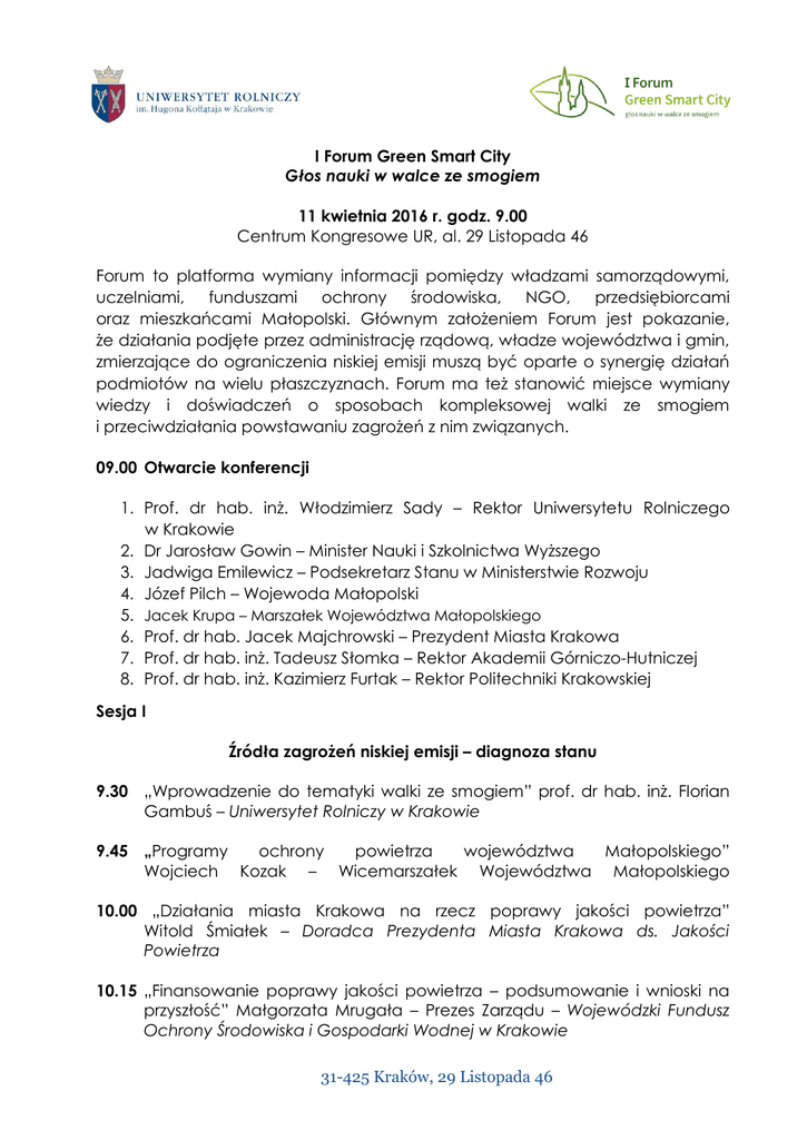 I Forum Green Smart City Głos nauki w walce ze smogiem 11 kwietnia 2016 r. godz. 9.00 Centrum Kongresowe UR, al. 29 Listopada 46 Forum to platforma wymiany informacji pomiędzy władzami samorządowymi, uczelniami, funduszami ochrony środowiska, NGO, przedsiębiorcami oraz mieszkańcami Małopolski. Głównym założeniem Forum jest pokazanie, że działania podjęte przez administrację rządową, władze województwa i gmin, zmierzające do ograniczenia niskiej emisji muszą być oparte o synergię działań podmiotów na wielu płaszczyznach. Forum ma też stanowić miejsce wymiany wiedzy i doświadczeń o sposobach kompleksowej walki ze smogiem i przeciwdziałania powstawaniu zagrożeń z nim związanych. 09.00 Otwarcie konferencji 1. Prof. dr hab. inż. Włodzimierz Sady – Rektor Uniwersytetu Rolniczego w Krakowie 2. Dr Jarosław Gowin – Minister Nauki i Szkolnictwa Wyższego 3. Jadwiga Emilewicz – Podsekretarz Stanu w Ministerstwie Rozwoju 4. Józef Pilch – Wojewoda Małopolski 5. Jacek Krupa – Marszałek Województwa Małopolskiego 6. Prof. dr hab. Jacek Majchrowski – Prezydent Miasta Krakowa 7. Prof. dr hab. inż. Tadeusz Słomka – Rektor Akademii Górniczo-Hutniczej 8. Prof. dr hab. inż. Kazimierz Furtak – Rektor Politechniki Krakowskiej Sesja I Źródła zagrożeń niskiej emisji – diagnoza stanu 9.30 „Wprowadzenie do tematyki walki ze smogiem” prof. dr hab. inż. Florian Gambuś – Uniwersytet Rolniczy w Krakowie 9.45 „Programy ochrony powietrza województwa Małopolskiego” Wojciech Kozak – Wicemarszałek Województwa Małopolskiego 10.00 „Działania miasta Krakowa na rzecz poprawy jakości powietrza” Witold Śmiałek – Doradca Prezydenta Miasta Krakowa ds. Jakości Powietrza 10.15 „Finansowanie poprawy jakości powietrza – podsumowanie i wnioski na przyszłość” Małgorzata Mrugała – Prezes Zarządu – Wojewódzki Fundusz Ochrony Środowiska i Gospodarki Wodnej w Krakowie 31-425 Kraków, 29 Listopada 46 10.30 „Ocena jakości powietrza w Małopolsce” Paweł Ciećko – Małopolski Wojewódzki Inspektor Ochrony Środowiska 10.45 „Perspektywy poprawy jakości powietrza w aglomeracji Krakowa” prof. dr hab. inż. Marian Mazur – Wydział Geodezji Górniczej i Inżynierii Środowiska, Akademia Górniczo-Hutnicza 11.00 „Klimat miasta a zanieczyszczenia powietrza” dr hab. Anita Bokwa Instytut Geografii i Gospodarki Przestrzennej Uniwersytet Jagielloński 11.15 „Zanieczyszczenia powietrza a choroby płuc” dr n. med. Anna Prokop Staszecka – Dyrektor Szpitala Specjalistycznego im. Jana Pawła II 11.30 „Wpływ zapylenia powietrza zewnętrznego na jego stan wewnątrz wybranych obiektów” prof. dr hab. Inż. Janusz Miczyński, dr inż. Zbigniew Zuśka – Katedra Ekologii, Klimatologii i Ochrony Powietrza, Uniwersytet Rolniczy w Krakowie 11:45 „Smog w Krakowie – spojrzenie w przyszłość z perspektywy historycznej” dr hab. inż. Wanda Wilczyńska-Michalik – Instytut Geografii Uniwersytet Pedagogiczny, prof. dr hab. inż. Marek Michalik – Instytut Nauk Geologicznych, Uniwersytet Jagielloński Przerwa kawowa 12.00 – 12.15 Sesja II Rola i znaczenie zieleni miejskiej w tworzeniu i funkcjonowaniu Green Smart City 12.15 „Zarządzanie i planowanie terenów zieleni na przykładzie Krakowa” Piotr Kempf – Dyrektor Zarządu Zieleni Miejskiej 12.30 „Ocena warunków wentylacji Krakowa przy wykorzystaniu modelu dyspersji zanieczyszczeń i zastosowaniu metod teledetekcyjnych pionowego profilu wiatru” dr Leszek Ośródka – Zakład Monitoringu i Modelowania Zanieczyszczeń Powietrza IMGW 12.45 „Ekrany i pnącza – taktyka i strategia w walce z pyłami zawieszonymi” dr hab. inż. Piotr Muras, prof. UR – Katedra Dendrologii i Architektury Krajobrazu, Uniwersytet Rolniczy w Krakowie 31-425 Kraków, 29 Listopada 46 13.00 „Zielone Dachy – narzędzie do walki z zanieczyszczeniami powietrza” dr hab. inż. Małgorzata Frazik-Adamczyk – Katedra Dendrologii i Architektury Krajobrazu, Uniwersytet Rolniczy w Krakowie 13.15 „Rola zieleni miejskiej w ograniczaniu pyłowych zanieczyszczeń powietrza” dr inż. Maciej Gliniak – Instytut Inżynierii Rolniczej i Informatyki, Uniwersytet Rolniczy w Krakowie 13.30 „Modelowanie przestrzenne GIS jakości życia w mieście” dr hab. inż. Piotr Wężyk – Zakład Urządzania Lasu, Geomatyki i Ekonomiki Leśnictw, Uniwersytet Rolniczy w Krakowie Przerwa kawowa 13.45 -14.00 Sesja III Praktyczne przykłady walki z niską emisją 14.00 „Ekologiczne ciepło – oferta Miejskiego Przedsiębiorstwa Energetyki Cieplnej SA dla mieszkańców Krakowa” Jan Sady – Prezes Zarządu Dyrektor Generalny MPEC S.A. 14.15 „Ograniczenie wtórnego pylenia z ulic (mycie ulic i chodników)” dr hab. inż. Agnieszka Generowicz - Instytut Zaopatrzenia w Wodę i Ochrony Środowiska, Politechnika Krakowska, dr inż. Małgorzata Kryłów Instytut Zaopatrzenia w Wodę i Ochrony Środowiska Politechnika Krakowska, Andrzej Natkaniec, Wiceprezes Zarządu, Dyrektor Techniczny MPO Jacek Sobczyk, Dyrektor Zakładu Oczyszczania MPO 14.35 „Błękitny węgiel alternatywą dla tradycyjnego paliwa kopalnego” - Instytut Chemicznej Przeróbki Węgla w Zabrzu dr inż. Aleksander Sobolewski - Dyrektor IChPW 14.50 „Kluczowe wyzwania w walce o czyste powietrze w Małopolsce” Andrzej Guła, Prezes Krakowskiego Alarmu Smogowego 15.05 „Podsumowanie i zamknięcie Forum” prof. dr hab. inż. Włodzimierz Sady Rektor Uniwersytetu Rolniczego w Krakowie Jacek Krupa – Marszałek Województwa Małopolskiego 15.20 Obiad * Organizator zastrzega sobie prawo do zmian w programie 31-425 Kraków, 29 Listopada 46 Komitet Organizacyjny I Forum Green Smart City- Głos nauki w walce ze smogiem Przewodniczący: dr hab. inż. Stanisław Małek, prof. UR w Krakowie Prorektor ds. Nauki, Wdrożeń i Współpracy Międzynarodowej UR Członkowie: mgr Tomasz Szanser, Kanclerz UR mgr. inż. Marcin Kobuszewski, Dyr