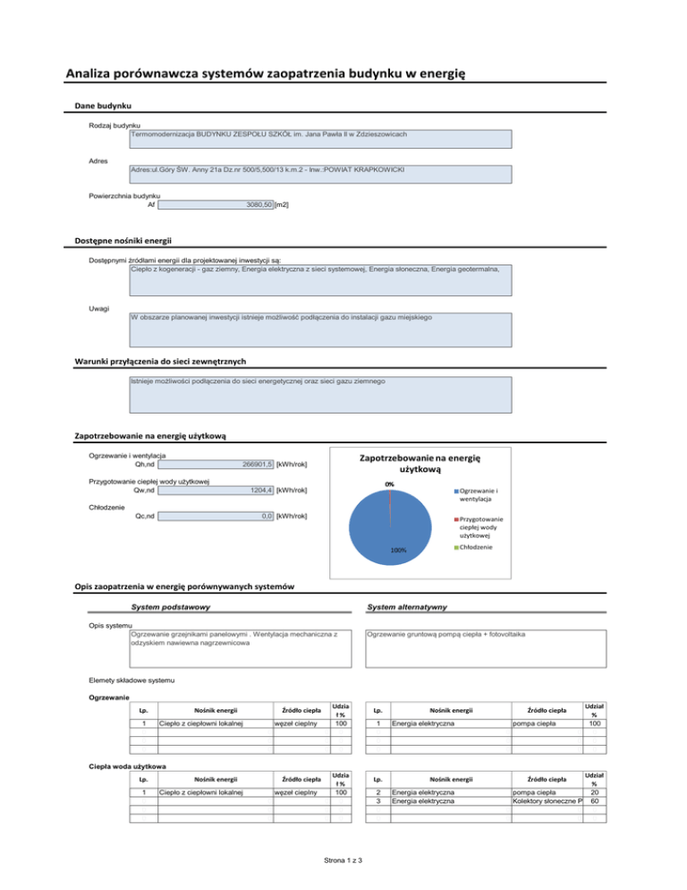 Analiza porównawcza systemów zaopatrzenia budynku w energię Dane budynku Rodzaj budynku Termomodernizacja BUDYNKU ZESPOŁU SZKÓŁ im. Jana Pawła II w Zdzieszowicach Adres Adres:ul.Góry ŚW. Anny 21a Dz.nr 500/5,500/13 k.m.2 - Inw.:POWIAT KRAPKOWICKI Powierzchnia budynku Af 3080,50 [m2] Dostępne nośniki energii Dostępnymi źródłami energii dla projektowanej inwestycji są: Ciepło z kogeneracji - gaz ziemny, Energia elektryczna z sieci systemowej, Energia słoneczna, Energia geotermalna, Uwagi W obszarze planowanej inwestycji istnieje możliwość podłączenia do instalacji gazu miejskiego Warunki przyłączenia do sieci zewnętrznych Istnieje możliwości podłączenia do sieci energetycznej oraz sieci gazu ziemnego Zapotrzebowanie na energię użytkową Ogrzewanie i wentylacja Qh,nd Zapotrzebowanie na energię użytkową 266901,5 [kWh/rok] Przygotowanie ciepłej wody użytkowej Qw,nd 0% 1204,4 [kWh/rok] Ogrzewanie i wentylacja Chłodzenie Qc,nd 0,0 [kWh/rok] Przygotowanie ciepłej wody użytkowej Chłodzenie 100% Opis zaopatrzenia w energię porównywanych systemów System podstawowy System alternatywny Opis systemu Ogrzewanie grzejnikami panelowymi . Wentylacja mechaniczna z odzyskiem nawiewna nagrzewnicowa Ogrzewanie gruntową pompą ciepła + fotovoltaika Elemety składowe systemu Ogrzewanie Lp. 1 0 0 0 Nośnik energii Źródło ciepła Ciepło z ciepłowni lokalnej węzeł cieplny 0 0 0 Udzia ł% 100 0 0 0 0 0 0 Lp. 1 0 0 0 Nośnik energii Źródło ciepła Energia elektryczna pompa ciepła 0 0 0 Udział % 100 0 0 0 0 0 0 Ciepła woda użytkowa Lp. 1 0 0 0 Nośnik energii Źródło ciepła Ciepło z ciepłowni lokalnej węzeł cieplny 0 0 0 Udzia ł% 100 0 0 0 0 0 0 Strona 1 z 3 Lp. 2 3 0 0 Nośnik energii Energia elektryczna Energia elektryczna Udział % pompa ciepła 20 Kolektory słoneczne PV 60 0 0 0 0 0 0 Źródło ciepła Chłodzenie Lp. Nośnik energii Źródło ciepła 0 0 0 0 Udzia ł% 0 0 0 0 Lp. Nośnik energii Źródło ciepła 0 0 0 0 Udział % 0 0 0 0 Urządzenia pomocnicze Lp. Nośnik energii 1 0 0 Źródło ciepła Ciepło z ciepłowni lokalnej węzeł cieplny 0 0 Udzia ł% 100% 0 0% 0 0% Lp. Nośnik energii Źródło ciepła 0 0 0 0 0 0 Zapotrzebowanie na energię porównywanych systemów System podstawowy System alternatywny Zapotrzebowanie na energię pierwotną EP 270,0 [kWh/m2 rok] EP 120,0 [kWh/m2 rok] Zapotrzebowanie na energię końcową EK 167,3 [kWh/m2 rok] EK 28,1 [kWh/m2 rok] EP EK [kWh/m2 rok] [kWh/m2 rok] 180,0 300,0 160,0 250,0 167,3 140,0 270,0 200,0 120,0 150,0 100,0 80,0 100,0 120,0 60,0 50,0 40,0 0,0 System podstawowy 20,0 System alternatywny 28,1 0,0 System podstawowy System alternatywny Analiza ekonomiczna porównywanych systemów System podstawowy System alternatywny Koszty inwestycyjne 0 [PLN] 0,00 [PLN/m2] 120000 [PLN] 38,95 [PLN/m2] 63774 [PLN] 20,70 [PLN/m2] 141132 [PLN] 45,81 [PLN/m2] Roczne koszty eksploatacyjne Koszt inwestycyjny Roczny koszt eksploatacji [PLN] [PLN] 160000 140000 140000 120000 120000 100000 100000 80000 80000 60000 60000 40000 20000 141132 120000 40000 63774 20000 0 0 0 Roczna różnica kosztów eksploatacji 77358 [PLN] Różnica kosztów inwestycyjnych 120000 [PLN] Prosty czas zwrotu inwestycji (SPBT) 1,6 [lata] Uwagi: Ze względów lokalizacyjnych możliwe jest zastosowanie jedynie gruntowej pompy ciepła solanka-woda z buforem c.w.u. W okresach szczytowych ogrzewanie elektryczne Strona 2 z 3 Udział % 0 0% 0 0% 0 0% Analiza ekologiczna porównywanych systemów System podstawowy System alternatywny Roczna emisja CO2 58496,9 [kgCO2/rok] 304056,7 [kgCO2/rok] Emisja CO2 [kg CO2/rok] 350000,0 300000,0 250000,0 304056,7 200000,0 150000,0 100000,0 50000,0 0,0 58496,9 System podstawowy System alternatywny Wybór systemu zaopatrzenia w energię; Wybrany system Założony system alternatywny zwróci się po ok. 1,6roku lecz wymaga znacznych kosztów inwestycyjnych. Decyzją inwestora do realizacji wybrano zaprojektowany system podstawowy. Uwagi: Opracował: inż. Ryszard Kaszowski Strona 3 z 3