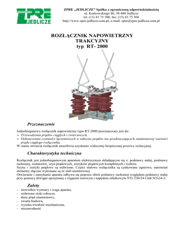ZPRE „JEDLICZE” Spółka z ograniczoną odpowiedzialnością ul. Kurkowskiego 86, 38-460 Jedlicze tel. (13) 43 75 300, fax: (13) 43 75 304 http://www.zpre-jedlicze.com.pl, e-mail: [email protected] ROZŁĄCZNIK NAPOWIETRZNY TRAKCYJNY typ RT- 2000 Przeznaczenie Jednobiegunowy rozłącznik napowietrzny typu RT-2000 przeznaczony jest do: ➢ Przewodzenia prądów ciągłych i zwarciowych, ➢ Dokonywania czynności łączeniowych w zakresie prądów nie przekraczających znamionowej wartości prądu ciągłego rozłącznika, W stanie otwarcia rozłącznik umożliwia uzyskanie widocznej bezpiecznej przerwy izolacyjnej. Charakterystyka techniczna Rozłącznik jest jednobiegunowym aparatem elektrycznym składającym się z: podstawy stałej, podstawy ruchomej, izolatorów, szyn prądowych, zestyków prądowych kompletnych i rożków. Szyny i zestyki prądowe są srebrzone. Części stalowe rozłącznika są cynkowane ogniowo, natomiast elementy złączne wykonane są ze stali nierdzewnej. Otwieranie i zamykanie aparatu odbywa się poprzez obrót podstawy ruchomej względem podstawy stałej przy pomocy dźwigni sprzężonej z cięgnem rurowym i napędem silnikowym NTs 230/24-I lub NTs24-2. Zalety – – – – – – niewielkie wymiary i waga aparatu, srebrzone styki robocze, duży prąd znamionowy, zwarta budowa, wysoka trwałość mechaniczna, niezawodność Dane techniczne Napięcie znamionowe Prąd znamionowy ciągły Prąd znamionowy wyłączalny Prąd znamionowy załączalny Prąd zwarciowy Czas trwania zwarcia Masa rozłącznika Klasa trwałości mechanicznej Trwałość elementów łączeniowych Dopuszczalne oblodzenie Temperatura pracy Gabaryty /dł. x szer. x wys./ 3,6 kV 2000 A 2000 A 2000 A 25 kA 0,2 s 28 kg M2 min. 15 wyłączeń prądu znam. 10 mm -250C do +400C 400 x 380 x 700 Rozłącznik napowietrzny RT-2000 spełnia wymagania norm: BN-80/9317-105 oraz PN-EN 62271-1:2009E i PN-EN 62271-102 : 2005