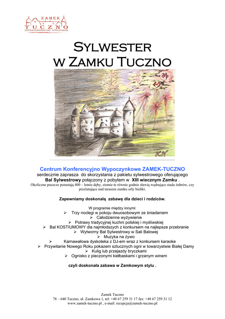 Sylwester w Zamku Tuczno Centrum Konferencyjno Wypoczynkowe ZAMEK-TUCZNO serdecznie zaprasza do skorzystania z pakietu sylwestrowego oferującego Bal Sylwestrowy połączony z pobytem w XIII wiecznym Zamku . Okoliczne puszcze porastają 400 – letnie dęby, ziemie te równie godnie sławią wędrujące stada żubrów, czy przelatujące nad tarasem zamku orły bieliki. Zapewniamy doskonałą zabawę dla dzieci i rodziców. W programie między innymi: Trzy noclegi w pokoju dwuosobowym ze śniadaniem ¾ Całodzienne wyżywienie ¾ Potrawy tradycyjnej kuchni polskiej i myśliwskiej ¾ Bal KOSTIUMOWY dla najmłodszych z konkursem na najlepsze przebranie ¾ Wytworny Bal Sylwestrowy w Sali Balowej ¾ Muzyka na żywo ¾ Karnawałowa dyskoteka z DJ-em wraz z konkursem karaoke ¾ Przywitanie Nowego Roku pokazem sztucznych ogni w towarzystwie Białej Damy ¾ Kulig lub przejazdy bryczkami ¾ Ognisko z pieczonymi kiełbaskami i grzanym winem ¾ czyli doskonała zabawa w Zamkowym stylu . Zamek Tuczno 78 – 640 Tuczno, ul. Zamkowa 1, tel: +48 67 259 31 17 fax: +48 67 259 31 12 www.zamek-tuczno.pl , e-mail: [email protected] Cennik brutto : Bal Sylwestrowy PLN 350.00 / osoba Bal Sylwestrowy z noclegiem PLN 450.00 / osoba ( nocleg 31.12.-01.01.2010 ) Pakiet standard PLN 950.00 / osoba ( 3 noclegi +program ) Pakiet prestiż PLN 1150.00 /osoba ( 3 noclegi w apartamencie + program) Doba hotelowa od godz. 14.00 do godz. 10.00. • • Osoby, które zdecydują się na wykupienie pakietu sylwestrowego do dnia 30.11.2009 otrzymają specjalny rabat w wysokości 10% Osoby, które zdecydują się na wykupienie pakietu sylwestrowego oraz świątecznego otrzymają specjalny rabat w wysokości 15% Agenda 31.12. 2009 14.00 - 16.00 17.00 - 19.00 21.00 – 04.00 00.10 Obiad Sylwestrowy bal kostiumowy dla dzieci konkurs na najlepsze przebranie. Bal Sylwestrowy w Sali Balowej Pokaz sztucznych ogni 01.01. 2010 10.00 - 12.00 18.00 - 20.00 20.00 - 02.00 Śniadanie Noworoczne Obiadokolacja Dyskoteka z konkursem karaoke w Sali Rycerskiej 02.01. 2010 08.00 - 10.00 13.00 - 15.00 16.00 - 18.00 18.00 - 20.00 21.00 - 23.00 Śniadanie Obiad Kulig lub przejazdy bryczkami Kolacja w restauracji Ognisko z kiełbaskami i grzańcem 03.01. 2010 08.00 - 10.00 Śniadanie Uwaga: • Przedłużona doba hotelowa do godz. 17.00 w dniu wyjazdu • Dzieci do lat 3 nie wymagające dostawki śpiące w pokoju rodziców – bez dopłaty • Dzieci od lat 4 do 10 śpiące w pokoju rodziców dopłata 100 zł/doba • Dzieci do lat 3 - wyżywienie bezpłatne • Dzieci od lat 4 do 10 – wyżywienie ½ ceny Serdecznie zapraszamy. Zamek Tuczno 78 – 640 Tuczno, ul. Zamkowa 1, tel: +48 67 259 31 17 fax: +48 67 259 31 12 www.zamek-tuczno.pl , e-mail: [email protected]