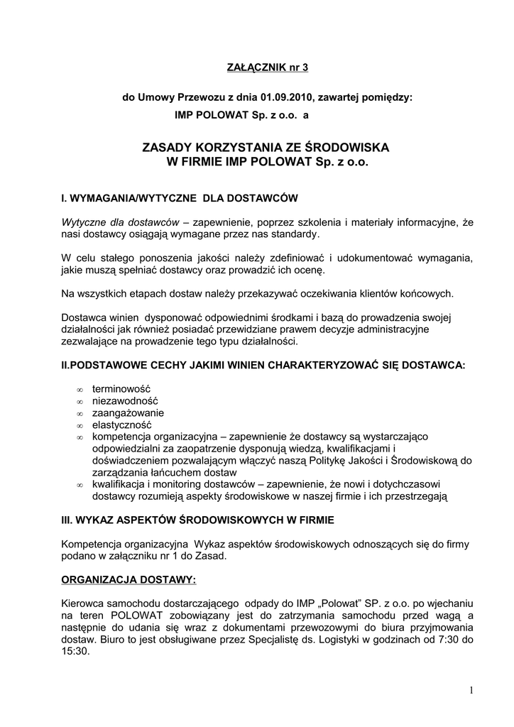 ZAŁĄCZNIK nr 3 do Umowy Przewozu z dnia 01.09.2010, zawartej pomiędzy: IMP POLOWAT Sp. z o.o. a ZASADY KORZYSTANIA ZE ŚRODOWISKA W FIRMIE IMP POLOWAT Sp. z o.o. I. WYMAGANIA/WYTYCZNE DLA DOSTAWCÓW Wytyczne dla dostawców – zapewnienie, poprzez szkolenia i materiały informacyjne, że nasi dostawcy osiągają wymagane przez nas standardy. W celu stałego ponoszenia jakości należy zdefiniować i udokumentować wymagania, jakie muszą spełniać dostawcy oraz prowadzić ich ocenę. Na wszystkich etapach dostaw należy przekazywać oczekiwania klientów końcowych. Dostawca winien dysponować odpowiednimi środkami i bazą do prowadzenia swojej działalności jak również posiadać przewidziane prawem decyzje administracyjne zezwalające na prowadzenie tego typu działalności. II.PODSTAWOWE CECHY JAKIMI WINIEN CHARAKTERYZOWAĆ SIĘ DOSTAWCA: • • • • • • terminowość niezawodność zaangażowanie elastyczność kompetencja organizacyjna – zapewnienie że dostawcy są wystarczająco odpowiedzialni za zaopatrzenie dysponują wiedzą, kwalifikacjami i doświadczeniem pozwalającym włączyć naszą Politykę Jakości i Środowiskową do zarządzania łańcuchem dostaw kwalifikacja i monitoring dostawców – zapewnienie, że nowi i dotychczasowi dostawcy rozumieją aspekty środowiskowe w naszej firmie i ich przestrzegają III. WYKAZ ASPEKTÓW ŚRODOWISKOWYCH W FIRMIE Kompetencja organizacyjna Wykaz aspektów środowiskowych odnoszących się do firmy podano w załączniku nr 1 do Zasad. ORGANIZACJA DOSTAWY: Kierowca samochodu dostarczającego odpady do IMP „Polowat” SP. z o.o. po wjechaniu na teren POLOWAT zobowiązany jest do zatrzymania samochodu przed wagą a następnie do udania się wraz z dokumentami przewozowymi do biura przyjmowania dostaw. Biuro to jest obsługiwane przez Specjalistę ds. Logistyki w godzinach od 7:30 do 15:30. 1 W pozostałych godzinach kierowca zgłasza się do pracownika ochrony, który przebywa w pomieszczeniu biura przyjmowania dostaw i zawiadamia właściwą osobę w POLOWAT o konieczności podjęcia wszystkich czynności związanych z odbiorem dostawy. W każdym przypadku kierowca samochodu jest zobowiązany do wykonywania poleceń osoby zajmującej się przyjęciem dostawy (Specjalisty ds. Logistyki lub innej wskazanej przez pracownika ochrony) w zakresie poruszania się w budynku administracyjnym oraz na placu manewrowym i składowym. Samowolne przemieszczanie się kierowców w innych od wyznaczonych stref jest niedopuszczalne. W/w osoby decydują również o kolejności rozładunków w przypadku wystąpienia spiętrzenia dostaw. Środki transportu winny charakteryzować się następującymi cechami: dobrym stanem technicznym, brakiem wycieków płynów i oleju, właściwymi parametrami emitowanych spalin, odpowiednim oznakowaniem. Podczas transportu odpadów na terenie zakładu, zawsze należy zabezpieczyć je przed dostępem osób niepowołanych. Odpady winne być przygotowane w sposób zapobiegający ich rozsypaniu podczas rozładunku (odpowiednie belowanie, zawiązane big bagi). Miejsca parkowania samochodów służących jako środek transportu to plac składowy, utwardzony plac składowy, magazyn surowca. Samochody powinny poruszać się po terenie zakładu z uwzględnieniem zasad ruchu drogowego (ograniczenie prędkości, znaki drogowe). V. WYTYCZNE DLA DOSTAWCÓW ŚRODKÓW CHEMICZNYCH Transport substancji niebezpiecznych (żrące, palne, wybuchowe, utleniające, itp.) może być realizowany wyłącznie przez wyspecjalizowane firmy. Kierowcy winni mieć ukończone szkolenie BHP oraz posiadać aktualne badania lekarskie zezwalające na pracę na danym stanowisku. Na środkach transportu należy umieścić znak ostrzegający przed niebezpieczeństwem Niedopuszczalne jest przewożenie substancji i preparatów chemicznych nie oznakowanych w sposób widoczny , umożliwiający ich identyfikację Kierowca musi posiadać dokumenty niezbędne przy przewożeniu substancji niebezpiecznych oraz odpowiednie karty charakterystyk 2 Kierowca powinien posiadać środki ochrony indywidualnej (maski, osłony twarzy, itp.) do wykonania czynności szczególnie niebezpiecznych Podczas transportu substancji chemicznych na terenie zakładu, zawsze należy zabezpieczyć je przed dostępem osób niepowołanych. Samochód służący jako środek transportu należy parkować z dala od miejsc, gdzie mogłoby dojść do zanieczyszczenia wody (wyciek)- patrz. pkt. IV (miejsca parkowania samochodów). Szkodliwe właściwości chemiczne niektórych substancji oznaczają, że trzeba zastosować dodatkowe środki ostrożności, aby zapewnić ich bezpieczny transport. VI Dodatkowe środki ostrożności przy transporcie substancji chemicznych: Należy sprawdzić, czy transportowana jest którakolwiek z następujących substancji: - związki wydzielające gazy pod wpływem wilgoci związki wydzielające ciepło pod wpływem wilgoci Niewłaściwe obchodzenie się z tego rodzaju substancjami niesie ze sobą niebezpieczeństwo wynikające ze złego składowania tych substancji. W szczególności, używanie wody do gaszenia ewentualnego pożaru może powodować znaczne niebezpieczeństwo dla służb ratunkowych. Tego rodzaju substancje transportować należy w osobnych pojemnikach, nie przepuszczających oparów, a pojemniki – w części przeznaczonej do przewozu towarów. - związki szybko utleniające W trakcie ogrzewania produktów utleniających wydzielają się duże ilości tlenu, który może spowodować nagłe rozprzestrzenianie się pożaru. Duże ilości takich związków wymagają całkowicie osobnych pojemników. Można je transportować pod warunkiem, że są one umieszczone w ognioodpornym, suchym pojemniku, z dala od źródeł ciepła i innych substancji. - związki łatwopalne oraz wybuchowe Można je transportować pod warunkiem, że są one umieszczone w ognioodpornym, suchym pojemniku, z dala od źródeł ciepła i innych substancji. 3 Informac