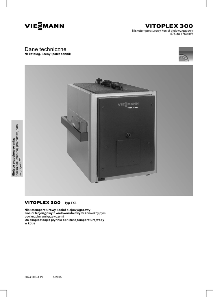 VIESMANN VITOPLEX 300 Niskotemperaturowy kocioł olejowy/gazowy 575 do 1750 kW Dane techniczne Miejsce przechowywania: teczka dokumentacji projektowej Vitotec, rejestr 21 Nr katalog. i ceny: patrz cennik VITOPLEX 300 Typ TX3 Niskotemperaturowy kocioł olejowy/gazowy Kocioł trójciągowy z wielowarstwowymi konwekcyjnymi powierzchniami grzewczymi Do eksploatacji z płynnie obniżaną temperaturą wody w kotle 5824 205–4 PL 5/2005 Zalety & & & & & Wielowarstwowe konwekcyjne powierzchnie ogrzewalne zapewniają wysokie bezpieczeństwo eksploatacji i dużą trwałość. Szczególnie oszczędny i przyjazny dla środowiska dzięki pracy z płynnie obniżaną temperaturą wody w kotle; wyłącza się całkowicie w przypadku braku zapotrzebowania na ciepło. Sprawność znormalizowana: 96% Wzrost sprawności znormalizowanej do 12% dzięki wykorzystaniu ciepła kondensacji przez wykonany ze stali nierdzewnej wymiennik ciepła spaliny/woda Vitotrans 333. Kocioł trójciągowy o niskim obciążeniu komory spalania, dzięki czemu spalanie odbywa się z niską emisją zanieczyszczeń i tlenków azotu. Bez wymogu minimalnego przepływu objętościowego wody grzewczej – obszerny płaszcz wodny i duża pojemność wodna zapewniają dobrą cyrkulację własną i bezpieczne odprowadzanie ciepła – ułatwione połączenie hydrauliczne. Zintegrowany układ rozruchowy Therm-Control zastępuje pompę mieszającą lub stałe podwyższanie temperatury wody & & & & & & na powrocie, skracając tym samym czas montażu oraz redukując koszty. System montażowy Fastfix, przyspieszający i ułatwiający montaż. Pomost roboczy kotła – ułatwia montaż i konserwację. Konstrukcja kompaktowa zapewnia łatwe ustawienie i niską wysokość montażową. Długie cykle pracy palnika oraz mała ilość przerw w pracy dzięki dużej pojemności wodnej chronią środowisko. Przy temperaturach progowych do 110°Cnie ma potrzeby montażu elementu pośredniego na zasilaniu, przyłącza wymagane do przyłączenia wyposażenia znajdują się na kotle grzewczym. Ekonomiczna i bezpieczna eksploatacja instalacji grzewczej dzięki cyfrowemu systemowi regulacyjnemu Vitotronic z możliwością komunikacji. Dostosowany do różnorodnych potrzeb spełnia wymagania wszystkich znanych systemów regulacyjnych oraz ich zastosowań. Standardowe połączenie LON-BUS umożliwia całkowitą integrację w systemach zarządzania budynku. Możliwość integracji z szafą sterowniczą Vitocontrol. A Wysoce skuteczna izolacja cieplna B Drugi ciąg spalin C Blacha prowadząca wodę z inżektorami wody powrotnej D Komora spalania (pierwszy ciąg) E Trzeci ciąg spalin jako wielowarstwowa, konwekcyjna powierzchnia grzewcza 5824 205–4 PL F Drzwi kotłowe 2 VIESMANN VITOPLEX 300 Dane techniczne Dane techniczne Znamionowa moc cieplna Znamionowe obciążenie cieplne Oznakowanie CE Dop. temperatura na zasilaniu (= temperatura progowa) Maks. ciśnienie robocze Opory przepływu spalin Wymiary korpusu kotła Długość * 1 Szerokość Wymiary całkowite Długość całkowita Szerokość całkowita – z regulatorem – bez regulatora Wysokość całkowita z króćcami Wysokość dźwiękochłonnych podkładek pod kocioł (pod obciążeniem) Fundament Długość Szerokość Średnica komory spalania Długość komory spalania Ciężar korpusu kotła Ciężar całkowity Kocioł grzewczy z izolacją cieplną i regulatorem obiegu kotła Pojemność wodna kotła Przyłącza kotła grzewczego Zasilanie i powrót kotła Przyłącze zabezpieczające (zawór bezpieczeństwa) Spust Parametry spalin* 2 Temperatura (przy temperaturze wody w kotle wynoszącej 50°C) – przy znamionowej mocy cieplnej – przy obciążeniu częściowym Temperatura (przy temperaturze wody w kotle wynoszącej 80°C) Masowe natężenie przepływu (dla oleju opałowego lekkiego i gazu ziemnego) – przy znamionowej mocy cieplnej – przy obciążeniu częściowym Wymagane ciśnienie tłoczenia Przyłącze spalin Pojemność części spalinowej Komora spalania i ciągi spalin Sprawność znormalizowana przy temp. ukł. grzewczego 75/ 60°C Straty energii dyżurnej q B,70 *1 5824 205–4 PL *2 kW kW 575 622 720 778 1120 1210 1400 1514 1750 1892 patrz strona 8 patrz strona 8 °C bar Pa mbar 895 968 6 300 3,0 6 370 3,7 6 360 3,6 6 430 4,3 6 470 4,7 6 500 5,0 mm mm 2035 1080 2185 1080 2385 1175 2595 1175 2850 1280 3085 1280 mm 2100 2255 2455 2665 2950 3185 mm mm mm mm 1460 1285 1695 37 1460 1285 1695 37 1550 1375 1955 37 1550 1375 1955 37 1655 1480 2145 37 1655 1480 2145 37 mm mm mm mm kg kg 1900 1300 685 1515 1468 1568 2000 1300 685 1665 1754 1859 2100 1500 780 1865 2762 2892 2300 1500 780 2075 2907 3042 2600 1600 840 2315 3507 3672 2800 1600 840 2550 4084 4259 litry 903 948 1364 1452 1964 2066 PN 6 DN PN 16 DN 100 40 100 40 125 50 125 50 150 65 150 65 R 1¼ 1¼ 1¼ 1¼ 1¼ 1¼ °C 165 165 165 165 165 165 °C °C 110 180 110 180 110 180 110 180 110 180 110 180 kg/h 954 1190 1490 1860 2320 2900 572 0 250 0,88 716 0 250 0,97 891 0 300 1,41 1120 0 300 1,60 1390 0 400 2,17 1740 0 400 2,46 % 96 96 96 96 96 96 % 0,18 0,15 0,13 0,13 0,12 0,12 kg/h Pa/mbar 7mm m3 Drzwi kotłowe zdemontowane. Wartości rachunkowe do projektowania instalacji spalinowej wg normy EN 13384 w odniesieniu do 13% CO2 w przypadku oleju opałowego lekkiego i 10% CO2 w przypadku gazu ziemnego. Temperatury spalin jako zmierzone wartości brutto przy20°C temperatury powietrza do spalania. Dane obciążenia częściowego odnoszą się do wydajności wynoszącej 60% znamionowej mocy cieplnej. Przy obciążeniu częściowym odbiegającym od podanych wartości (zależnie od sposobu eksploatacji) należy odpowiednio obliczyć przepływ masowy spalin. Temperatura spalin przy temperaturze wody w kotle wynoszącej 50°C jest miarodajna przy projektowaniu instalacji spalinowej. Temperatura spalin przy temperaturze wody w kotle wynoszącej 80°C służy do określenia zakresu zastosowania przewodów spalin przy maksymalnie dopuszczalnych
