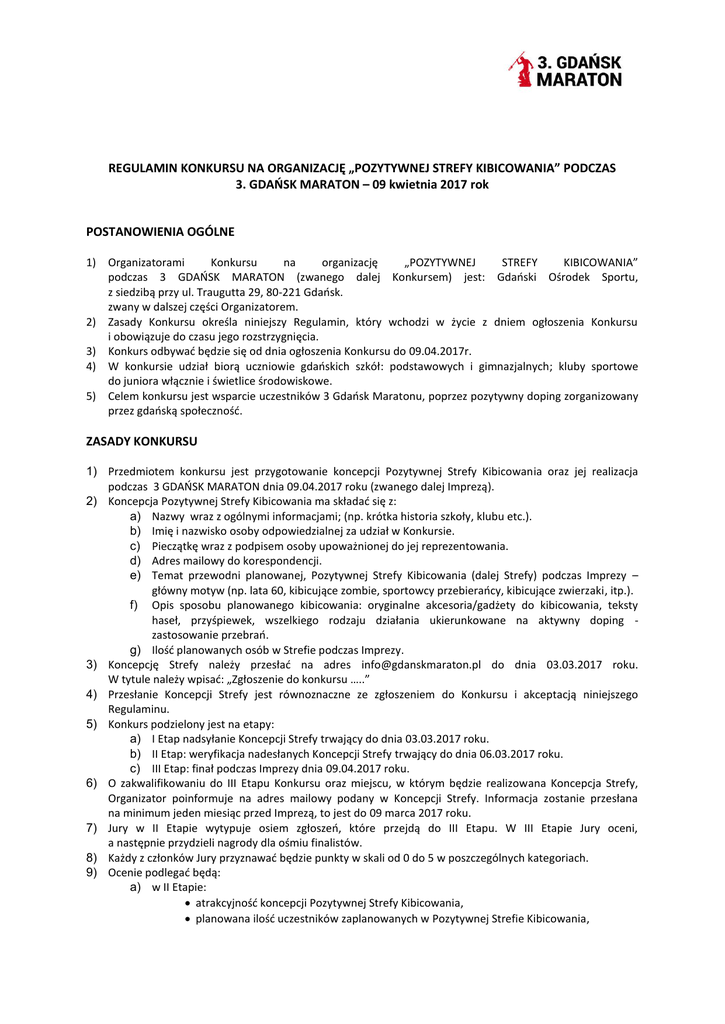 REGULAMIN KONKURSU NA ORGANIZACJĘ „POZYTYWNEJ STREFY KIBICOWANIA” PODCZAS 3. GDAŃSK MARATON – 09 kwietnia 2017 rok POSTANOWIENIA OGÓLNE 1) Organizatorami Konkursu na organizację „POZYTYWNEJ STREFY KIBICOWANIA” podczas 3 GDAŃSK MARATON (zwanego dalej Konkursem) jest: Gdański Ośrodek Sportu, z siedzibą przy ul. Traugutta 29, 80-221 Gdańsk. zwany w dalszej części Organizatorem. 2) Zasady Konkursu określa niniejszy Regulamin, który wchodzi w życie z dniem ogłoszenia Konkursu i obowiązuje do czasu jego rozstrzygnięcia. 3) Konkurs odbywać będzie się od dnia ogłoszenia Konkursu do 09.04.2017r. 4) W konkursie udział biorą uczniowie gdańskich szkół: podstawowych i gimnazjalnych; kluby sportowe do juniora włącznie i świetlice środowiskowe. 5) Celem konkursu jest wsparcie uczestników 3 Gdańsk Maratonu, poprzez pozytywny doping zorganizowany przez gdańską społeczność. ZASADY KONKURSU 1) Przedmiotem konkursu jest przygotowanie koncepcji Pozytywnej Strefy Kibicowania oraz jej realizacja podczas 3 GDAŃSK MARATON dnia 09.04.2017 roku (zwanego dalej Imprezą). 2) Koncepcja Pozytywnej Strefy Kibicowania ma składać się z: a) Nazwy wraz z ogólnymi informacjami; (np. krótka historia szkoły, klubu etc.). b) Imię i nazwisko osoby odpowiedzialnej za udział w Konkursie. c) Pieczątkę wraz z podpisem osoby upoważnionej do jej reprezentowania. d) Adres mailowy do korespondencji. e) Temat przewodni planowanej, Pozytywnej Strefy Kibicowania (dalej Strefy) podczas Imprezy – główny motyw (np. lata 60, kibicujące zombie, sportowcy przebierańcy, kibicujące zwierzaki, itp.). f) Opis sposobu planowanego kibicowania: oryginalne akcesoria/gadżety do kibicowania, teksty haseł, przyśpiewek, wszelkiego rodzaju działania ukierunkowane na aktywny doping zastosowanie przebrań. g) Ilość planowanych osób w Strefie podczas Imprezy. 3) Koncepcję Strefy należy przesłać na adres [email protected] do dnia 03.03.2017 roku. W tytule należy wpisać: „Zgłoszenie do konkursu …..” 4) Przesłanie Koncepcji Strefy jest równoznaczne ze zgłoszeniem do Konkursu i akceptacją niniejszego Regulaminu. 5) Konkurs podzielony jest na etapy: a) I Etap nadsyłanie Koncepcji Strefy trwający do dnia 03.03.2017 roku. b) II Etap: weryfikacja nadesłanych Koncepcji Strefy trwający do dnia 06.03.2017 roku. c) III Etap: finał podczas Imprezy dnia 09.04.2017 roku. 6) O zakwalifikowaniu do III Etapu Konkursu oraz miejscu, w którym będzie realizowana Koncepcja Strefy, Organizator poinformuje na adres mailowy podany w Koncepcji Strefy. Informacja zostanie przesłana na minimum jeden miesiąc przed Imprezą, to jest do 09 marca 2017 roku. 7) Jury w II Etapie wytypuje osiem zgłoszeń, które przejdą do III Etapu. W III Etapie Jury oceni, a następnie przydzieli nagrody dla ośmiu finalistów. 8) Każdy z członków Jury przyznawać będzie punkty w skali od 0 do 5 w poszczególnych kategoriach. 9) Ocenie podlegać będą: a) w II Etapie: atrakcyjność koncepcji Pozytywnej Strefy Kibicowania, planowana ilość uczestników zaplanowanych w Pozytywnej Strefie Kibicowania, 10) 11) 12) 13) innowacyjność koncepcji. b) w III Etapie: realizacja koncepcji Pozytywnej Strefy Kibicowania, zgodność realizacji punktów zawartych w koncepcji projektu, głośność kibicowania, zaangażowanie i wytrwałość jak największej grupy kibicującej. Zwycięzcą Konkursu zostanie Strefa najwyżej oceniona przez trzyosobowe Jury, w skład którego wejdą powołani przez Dyrektora GOS: przedstawiciele Organizatora oraz Wydziału Rozwoju Społecznego w III Etapie. Punkty z II i III Etapu nie sumują się. O miejscu zajętym w III etapie Konkursu i sposobie realizacji nagrody Organizator poinformuje Laureatów mailowo na adres mailowy podany w Koncepcji Strefy Laureatów w terminie do dwóch tygodni od zakończenia Imprezy tj. do 24 kwietnia 2016 roku. Wyniki Konkursu zostaną ogłoszone na www.sportgdansk.pl oraz www. gdanskmaraton.pl. NAGRODY Nagrodą w Konkursie jest sprzęt sportowy ufundowany przez Organizatora o wartości: a) I miejsce – 5000 pln brutto, b) II miejsce – 3000 pln brutto, c) III miejsce – 2000 pln brutto, d) Od IV do VIII miejsca – 1000 pln brutto. POSTANOWIENIA KOŃCOWE 1) Organizator wyklucza jakąkolwiek formę kibicowania naruszającą dobra osobiste zawodników i osób postronnych oraz przebieg Imprezy. 2) Uczestnicy biorący udział w realizacji Koncepcji Strefy (dalej Uczestnicy) wyrażają zgodę na wykorzystanie ich wizerunku i publikowanie treści audio-wideo związanych z Konkursem przez Organizatorów i partnerów Imprezy. 3) Organizatorzy oraz sponsorzy są uprawnieni do wykorzystania wizerunku, wypowiedzi i danych osobowych poszczególnych uczestników, przy czym wizerunek i dane te będą wykorzystywane w materiałach promujących Imprezę i wydarzenia jej towarzyszące (prasa, radio, telewizja, Internet, materiały graficzne). Uczestnikom nie przysługują żadne dalsze gratyfikacje, w szczególności wynagrodzenie z tytułu wykorzystania wizerunku, wypowiedzi i danych osobowych poszczególnych Uczestników. 4) Każdy Uczestnik obowiązuje się zachowywać w sposób niezagrażający innym osobom obecnym na Imprezie. Uczestnicy biorący udział w Imprezie odpowiadają za szkodę wyrządzoną Organizatorom lub osobom trzecim biorącymi udział w Imprezie. 5) Niniejszy regulamin dostępny jest w siedzibie Organizatorów. Organizator zastrzega sobie prawo odwołania Konkursu i/lub zmiany warunków Regulaminu Konkursu i powiadomienie Uczestników za pośrednictwem adresu email, o którym mowa w punkcie II. 2. d) Regulaminu. 6) Organizator zastrzega sobie prawo dyskwalifikacji w III Etapie Konkursu w przypadku rażącego braku spójności strefy z Koncepcją Strefy. W takim przypadku nagroda nie zostanie przyznana. 7) Decyzje Organizatorów Konkursu oraz Jury mają charakter ostateczny i nie przysługuje od nich odwołanie. 8) Przystąpienie do udziału w Ko
