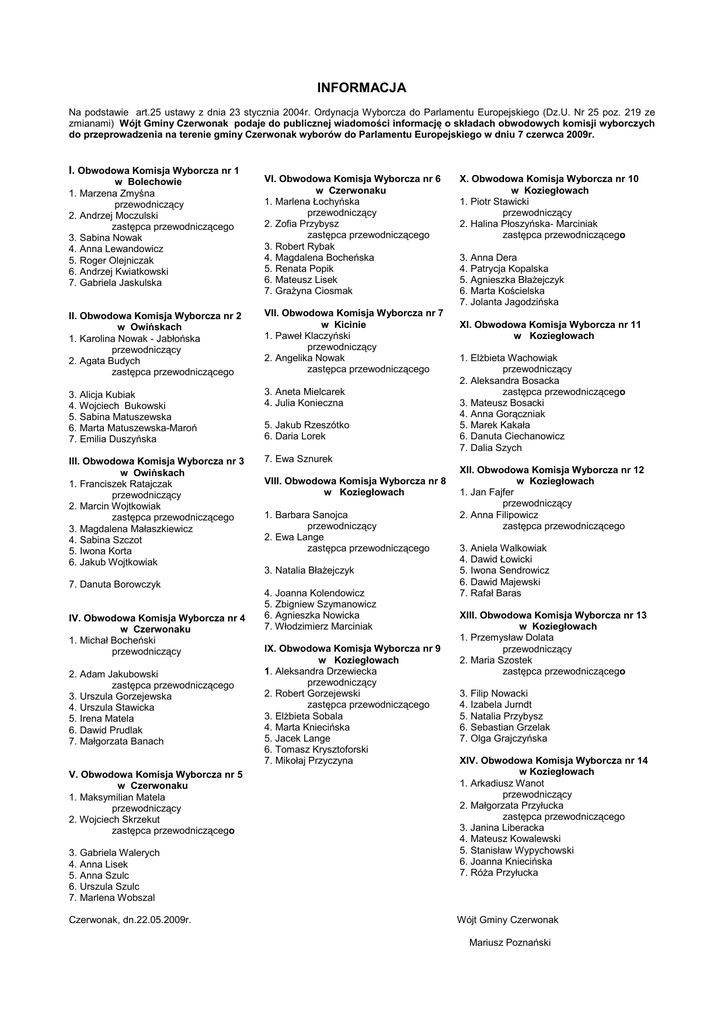 INFORMACJA Na podstawie art.25 ustawy z dnia 23 stycznia 2004r. Ordynacja Wyborcza do Parlamentu Europejskiego (Dz.U. Nr 25 poz. 219 ze zmianami) Wójt Gminy Czerwonak podaje do publicznej wiadomości informację o składach obwodowych komisji wyborczych do przeprowadzenia na terenie gminy Czerwonak wyborów do Parlamentu Europejskiego w dniu 7 czerwca 2009r. I. Obwodowa Komisja Wyborcza nr 1 w Bolechowie 1. Marzena Zmyśna przewodniczący 2. Andrzej Moczulski zastępca przewodniczącego 3. Sabina Nowak 4. Anna Lewandowicz 5. Roger Olejniczak 6. Andrzej Kwiatkowski 7. Gabriela Jaskulska VI. Obwodowa Komisja Wyborcza nr 6 w Czerwonaku 1. Marlena Łochyńska przewodniczący 2. Zofia Przybysz zastępca przewodniczącego 3. Robert Rybak 4. Magdalena Bocheńska 5. Renata Popik 6. Mateusz Lisek 7. GraŜyna Ciosmak II. Obwodowa Komisja Wyborcza nr 2 w Owińskach 1. Karolina Nowak - Jabłońska przewodniczący 2. Agata Budych zastępca przewodniczącego VII. Obwodowa Komisja Wyborcza nr 7 w Kicinie 1. Paweł Klaczyński przewodniczący 2. Angelika Nowak zastępca przewodniczącego 3. Alicja Kubiak 4. Wojciech Bukowski 5. Sabina Matuszewska 6. Marta Matuszewska-Maroń 7. Emilia Duszyńska 3. Aneta Mielcarek 4. Julia Konieczna III. Obwodowa Komisja Wyborcza nr 3 w Owińskach 1. Franciszek Ratajczak przewodniczący 2. Marcin Wojtkowiak zastępca przewodniczącego 3. Magdalena Małaszkiewicz 4. Sabina Szczot 5. Iwona Korta 6. Jakub Wojtkowiak 7. Ewa Sznurek 7. Danuta Borowczyk IV. Obwodowa Komisja Wyborcza nr 4 w Czerwonaku 1. Michał Bocheński przewodniczący 2. Adam Jakubowski zastępca przewodniczącego 3. Urszula Gorzejewska 4. Urszula Stawicka 5. Irena Matela 6. Dawid Prudlak 7. Małgorzata Banach V. Obwodowa Komisja Wyborcza nr 5 w Czerwonaku 1. Maksymilian Matela przewodniczący 2. Wojciech Skrzekut zastępca przewodniczącego 3. Gabriela Walerych 4. Anna Lisek 5. Anna Szulc 6. Urszula Szulc 7. Marlena Wobszal Czerwonak, dn.22.05.2009r. 5. Jakub Rzeszótko 6. Daria Lorek VIII. Obwodowa Komisja Wyborcza nr 8 w Koziegłowach 1. Barbara Sanojca przewodniczący 2. Ewa Lange zastępca przewodniczącego 3. Natalia BłaŜejczyk 4. Joanna Kolendowicz 5. Zbigniew Szymanowicz 6. Agnieszka Nowicka 7. Włodzimierz Marciniak IX. Obwodowa Komisja Wyborcza nr 9 w Koziegłowach 1. Aleksandra Drzewiecka przewodniczący 2. Robert Gorzejewski zastępca przewodniczącego 3. ElŜbieta Sobala 4. Marta Kniecińska 5. Jacek Lange 6. Tomasz Krysztoforski 7. Mikołaj Przyczyna X. Obwodowa Komisja Wyborcza nr 10 w Koziegłowach 1. Piotr Stawicki przewodniczący 2. Halina Płoszyńska- Marciniak zastępca przewodniczącego 3. Anna Dera 4. Patrycja Kopalska 5. Agnieszka BłaŜejczyk 6. Marta Kościelska 7. Jolanta Jagodzińska XI. Obwodowa Komisja Wyborcza nr 11 w Koziegłowach 1. ElŜbieta Wachowiak przewodniczący 2. Aleksandra Bosacka zastępca przewodniczącego 3. Mateusz Bosacki 4. Anna Gorączniak 5. Marek Kakała 6. Danuta Ciechanowicz 7. Dalia Szych XII. Obwodowa Komisja Wyborcza nr 12 w Koziegłowach 1. Jan Fajfer przewodniczący 2. Anna Filipowicz zastępca przewodniczącego 3. Aniela Walkowiak 4. Dawid Łowicki 5. Iwona Sendrowicz 6. Dawid Majewski 7. Rafał Baras XIII. Obwodowa Komisja Wyborcza nr 13 w Koziegłowach 1. Przemysław Dolata przewodniczący 2. Maria Szostek zastępca przewodniczącego 3. Filip Nowacki 4. Izabela Jurndt 5. Natalia Przybysz 6. Sebastian Grzelak 7. Olga Grajczyńska XIV. Obwodowa Komisja Wyborcza nr 14 w Koziegłowach 1. Arkadiusz Wanot przewodniczący 2. Małgorzata Przyłucka zastępca przewodniczącego 3. Janina Liberacka 4. Mateusz Kowalewski 5. Stanisław Wypychowski 6. Joanna Kniecińska 7. RóŜa Przyłucka Wójt Gminy Czerwonak Mariusz Poznański