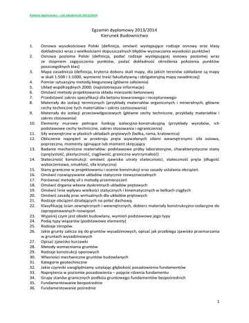 Pytania dyplomowe – rok akademicki 2013/2014 Egzamin dyplomowy 2013/2014 Kierunek Budownictwo 1. 2. 3. 4. 5. 6. 7. 8. 9. 10. 11. 12. 13. 14. 15. 16. 17. 18. 19. 20. 21. 22. 23. 24. 25. 26. 27. 28. 29. 30. 31. 32. 33. 34. 35. 36. Osnowa wysokościowa Polski (definicja, omówić występujące rodzaje osnowy oraz klasy dokładności wraz z wielkościami dopuszczalnych błędów wyznaczania wysokości punktów) Osnowa pozioma Polski (definicja, podać rodzaje występującej osnowy poziomej wraz ze stopniem zagęszczenia punktów, podać dokładność określenia położenia punktów poszczególnych klas) Mapa zasadnicza (definicja, kryteria doboru skali mapy, dla jakich terenów zakładane są mapy w skali 1:500 i 1:1000, wymienić treść fakultatywną i obligatoryjną mapy zasadniczej) Pomiar sytuacyjny metodą biegunową (główne założenia) Układ współrzędnych 2000. (najistotniejsze informacje) Omówić metody projektowania składu mieszanki betonowej Przedstawić zakres specyfikacji dla betonu towarowego i recepturowego Materiały do izolacji termicznych (przykłady materiałów organicznych i mineralnych, główne cechy techniczne tych materiałów i zakres zastosowania) Materiały do izolacji przeciwwilgociowych (główne cechy techniczne, przykłady materiałów i zakres stosowania) Elementy murowe pełniące funkcję izolacyjno-konstrukcyjną (przykłady wyrobów, ich podstawowe cechy techniczne, zakres stosowania i ograniczenia) Siły wewnętrzne w płaskich układach prętowych (belka, rama, kratownica) Obliczenie naprężeń w przekroju pręta wywołanych siłami wewnętrznymi: siła osiowa, poprzeczna, momenty zginające lub moment skręcający Badanie mechaniczne materiałów: podstawowe próby laboratoryjne, charakterystyczne stany (sprężystość, plastyczność, ciągliwość, graniczna wytrzymałość) Stateczność konstrukcji: omówić zjawisko utraty stateczności, stateczność pręta (długość wyboczeniowa, smukłość, siła krytyczna) Stany graniczne w projektowaniu i ocenie konstrukcji oraz zasady ustalania obciążeń. Omówić rozwiązywanie układów statycznie niewyznaczalnych Porównać metodę sił z metodą przemieszczeń Omówić drgania własne dyskretnych układów prętowych Omówić linie wpływu wielkości statycznych i kinematycznych w belkach ciągłych Omówić zasadę prac wirtualnych dla układów prętowych Rodzaje obciążeń działających na połać dachową. Klasyfikację ścian zewnętrznych i wewnętrznych, dobierz materiały konstrukcyjno-izolacyjne do zaproponowanych rozwiązań Wyjaśnij czym jest obiekt budowlany, wymień podstawowe jego typy Podaj typy wiązarów (podstawowe elementy) Rodzaje stropów. Jakie grunty zalicza się do gruntów wysadzinowych, opisać jak przebiega zjawisko przemarzania w gruntach wysadzinowych Opisać zjawisko kurzawki Metody wzmacniania gruntów Rodzaje konstrukcji oporowych Własności mechaniczne gruntów budowlanych Kategorie geotechniczne Jakie czynniki uwzględniamy ustalając głębokość posadowienia fundamentów Naprężenia w poziomie posadowienia – pojęcie rdzenia fundamentu Grupy stanów granicznych podłoża gruntowego fundamentów bezpośrednich Fundamentowanie bezpośrednie Fundamentowanie pośrednie 1 Pytania dyplomowe – rok akademicki 2013/2014 37. 38. 39. 40. 41. 42. 43. 44. 45. 46. 47. 48. 49. 50. 51. 52. 53. 54. 55. 56. 57. 58. 59. 60. 61. 62. 63. 64. 65. 66. 67. 68. 69. 70. 71. 72. 73. 74. 75. 76. 77. 78. 79. 80. 81. 82. 83. Metoda stanów granicznych w odniesieniu do konstrukcji żelbetowych Nośność zginanego przekroju żelbetowego Nośność na ścinanie wg modelu kratownicy zastępczej Zasady obliczania i konstruowania płyt krzyżowo zbrojonych Obliczanie stóp fundamentowych metodą wydzielonych wsporników trapezowych Właściwości mechaniczne stali budowlanych - definicje i badania Wymiarowanie konstrukcji metalowych metodą stanów granicznych Zasady projektowania dachowych wiązarów kratowych Systemy statyczno-konstrukcyjne hal stalowych Zabezpieczanie konstrukcji stalowych przed korozją Instalacja wentylacji mechanicznej nawiewno-wywiewnej. Wentylacja naturalna. Zabezpieczenia instalacji grzewczych. Układanie przewodów ogrzewania podłogowego Głębokość posadowienia elementów uzbrojenia ulicznego Klasyfikacja administracyjna i techniczna dróg publicznych Odwodnienie dróg Elementy przekroju poprzecznego drogi Elementy przekroju podłużnego drogi Wyznaczanie trasy drogowej - plan sytuacyjny Procedura określania współczynnika przenikania ciepła dla komponentów jednorodnych i niejednorodnych cieplnie Procedura oceny ryzyka rozwoju pleśni na przykładzie wybranego mostka termicznego Mostki termiczne w budynkach - istota zjawiska, wielkości opisujące mostki termiczne Składniki współczynnika przenoszenia ciepła uwzględniane w bilansie energetycznym budynku Ochrona budynku przed przegrzewaniem budynków w okresie letnim - wymagania i możliwe zabezpieczenia Własności fizyczne cieczy Podstawowe zagadnienia hydrostatyki Zdefiniuj i wyprowadź prawo Bernoulliego dla płynu nielepkiego o stałej gęstości (prędkość płynu nie zależy od czasu, zewnętrzne siły masowe są siłami potencjalnymi). Wyjaśnij jak spadek podłużny dna koryta wpływa na warunki przepływu strumienia cieczy. Omówić główne składniki bilansu wodnego w zlewni. Tryby udzielania zamówień publicznych. Elementy wniosku na pozwolenie na budowę/rozbiórkę. Wymagania dotyczące ochrony środowiska na placu budowy. Dziennik budowy jako urzędowy dokument przebiegu robót budowlanych (kto jest uprawniony do dokonywania wpisów i jakie wpisy należy wykonywać). Rola inżyniera kontraktu w zamówieniach wg FIDIC. Co to jest sprzęgło i jakie jest jego przeznaczenie? Co to są przekładnie? Scharakteryzować jedną z nich. Narysuj schemat elementarnego układu hydraulicznego i wymień jego elementy Jakie zadanie w układach hydraulicznych wykonuje silnik hydrauliczn