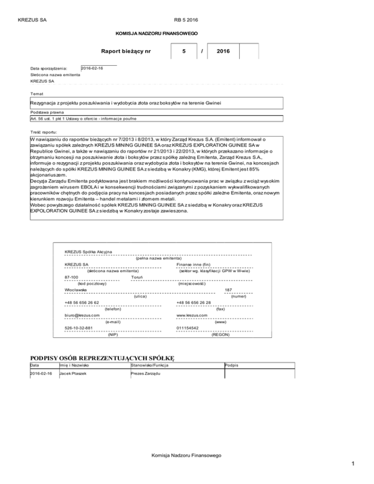 KREZUS SA RB 5 2016 KOMISJA NADZORU FINANSOWEGO Raport bieżący nr Data sporządzenia: Skróc ona nazwa emitenta 5 / 2016 2016-02-16 KREZUS SA Temat Rezygnacja z projektu poszukiwania i wydobycia złota oraz boksytów na terenie Gwinei Podstawa prawna Art. 56 ust. 1 pkt 1 Ustawy o oferc ie - informac je poufne Treść raportu: W nawiązaniu do raportów bieżących nr 7/2013 i 8/2013, w który Zarząd Krezus S.A. (Emitent) informował o zawiązaniu spółek zależnych KREZUS MINING GUINEE SA oraz KREZUS EXPLORATION GUINEE SA w Republice Gwinei, a także w nawiązaniu do raportów nr 21/2013 i 22/2013, w których przekazano informacje o otrzymaniu koncesji na poszukiwanie złota i boksytów przez spółkę zależną Emitenta, Zarząd Krezus S.A., informuje o rezygnacji z projektu poszukiwania oraz wydobycia złota i boksytów na terenie Gwinei, na koncesjach należących do spółki KREZUS MINING GUINEE SA z siedzibą w Konakry (KMG), której Emitent jest 85% akcjonariuszem. Decyzja Zarządu Emitenta podyktowana jest brakiem możliwości kontynuowania prac w związku z wciąż wysokim zagrożeniem wirusem EBOLA i w konsekwencji trudnościami związanymi z pozyskaniem wykwalifikowanych pracowników chętnych do podjęcia pracy na koncesjach posiadanych przez spółki zależne Emitenta, oraz nowym kierunkiem rozwoju Emitenta – handel metalami i złomem metali. Wobec powyższego działalność spółek KREZUS MINING GUINEE SA z siedzibą w Konakry oraz KREZUS EXPOLORATION GUINEE SA z siedzibą w Konakry zostaje zawieszona. KREZUS Spółka Akcyjna KREZUS SA 87-100 (pełna nazwa emitenta) Finanse inne (fin) (skróc ona nazwa emitenta) (kod poc ztowy) Włoc ławska +48 56 656 26 62 [email protected] om 526-10-32-881 (sektor wg. klasyfikac ji GPW w W-wie) Toruń (miejscowość) (ulica) +48 56 656 26 28 (telefon) www.krezus.com (e-mail) 011154542 (NIP) 187 (numer) (fax) (www) (REGON) PODPISY OSÓB REPREZENTUJĄCYCH SPÓŁKĘ Data 2016-02-16 Imię i Nazwisko Jacek Ptaszek Stanowisko/Funkc ja Prezes Zarządu Komisja Nadzoru Finansowego Podpis 1