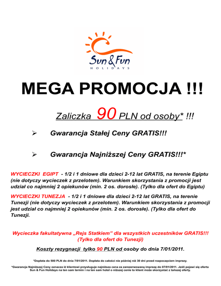MEGA PROMOCJA !!! Zaliczka 90 PLN od osoby* !!! Gwarancja Stałej Ceny GRATIS!!! Gwarancja Najniższej Ceny GRATIS!!!* WYCIECZKI EGIPT - 1/2 i 1 dniowe dla dzieci 2-12 lat GRATIS, na terenie Egiptu (nie dotyczy wycieczek z przelotem). Warunkiem skorzystania z promocji jest udział co najmniej 2 opiekunów (min. 2 os. dorosłe). (Tylko dla ofert do Egiptu) WYCIECZKI TUNEZJA - 1/2 i 1 dniowe dla dzieci 2-12 lat GRATIS, na terenie Tunezji (nie dotyczy wycieczek z przelotem). Warunkiem skorzystania z promocji jest udział co najmniej 2 opiekunów (min. 2 os. dorosłe). (Tylko dla ofert do Tunezji. Wycieczka fakultatywna „Rejs Statkiem” dla wszystkich uczestników GRATIS!!! (Tylko dla ofert do Tunezji) Koszty rezygnacji tylko 90 PLN od osoby do dnia 7/01/2011. *Dopłata do 500 PLN do dnia 7/01/2011. Dopłata do całości nie później niż 30 dni przed rozpoczęciem imprezy. *Gwarancja Najniższej Ceny oznacza iż klientowi przysługuje najniższa cena za zarezerwowaną imprezę do 07/01/2011. Jeśli pojawi się oferta Sun & Fun Holidays na ten sam termin i na ten sam hotel o niższej cenie to klient może skorzystać z tańszej oferty. Przy porównaniu cen uwzględnia się wartość wszystkich świadczeń, również świadczeń dodawanych gratis.