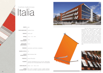 markiza balkonowa italia KASETA RURA NAWOJOWA MONTAŻ WYSIĘG średnica 70 mm ściana, sufit 1.0 m; 1.4 m; 1.8 m WYSIĘG MAKSYMALNY 1.8 m SZEROKOŚĆ MAKSYMALNA 5.0 m RAMIONA DASZEK W OPCJI KOLOR KONSTRUKCJI POSZYCIE FALBANA NAPĘD RĘCZNY NAPĘD AUTOMATYCZNY 30 brak italia jest markizą nadokienno-balkonową przeznaczoną do zacieniania i osłony wnęk okiennych, witryn, balkonów, tarasów i werand. Opuszczane ramiona z aluminium, wyposażono w sprężynę, która napina tkaninę i zapobiega składaniu ramion pod naporem wiatru. ciężar markizy rozłożony jest na uchwyty ramion i rury nawojowej, dlatego italia może być mocowana nawet tam, gdzie wytrzymałość podłoża nie pozwala na zastosowanie markizy tarasowej ze składanymi ramionami. Lekka konstrukcja markizy sprawia, że montaż jest niezwykle łatwy. elementy konstrukcyjne lakierowane są techniką proszkową na kolor biały. opuszczane, aluminiowe, ze sprężyną nie lakier proszkowy: biały ponad 100 wzorów wysokość standardowa 21cm (± 0,5 cm), maksymalna wysokość 40 cm dla kształtu C, D, 100 cm dla kształtu E korba: 1.5 m; 1.8 m; 2.2 m silnik, silnik ze zwijaniem ręcznym, nadajnik zdalnego sterowania, automatyka pogodowa wiatrowo-słoneczna 31 konstrukcja markiza balkonowa italia Wykonane z aluminium ramiona i uchwyty ścienno-sufitowe, zapewniają lekkość konstrukcji i łatwy montaż. Zastosowanie odlewów ciśnieniowych w ramionach zapewnia dużą wytrzymałość konstrukcji. automatyka W naszej ofercie dostępne są rozwiązania wiodących europejskich producentów, w tym: pełna automatyka wiatrowa i słoneczna, silniki sterowane przewodowo lub radiowo oraz przekładnie mechaniczne. montaż sta ard nd Widok z góry markiza otwarta Widok z boku markiza zamknięta pc ja Widok z góry markiza zamknięta o Widok z boku - markiza otwarta powyżej kąta 90° dopłata za tkaninę kolory konstrukcji W procesie lakierowania proszkowego w firmie Selt wykorzystywane są farby renomowanej szwajcarskiej firmy IGP. Dzięki zastosowaniu technologii proszków IGP-DURA®clean powierzchnie lakiernicze są odporne na zabrudzenia i łatwe w utrzymaniu. rAL 9010 poszycie falbana Oferujemy falbany w trzech kształtach wycięć C, D, E, jak na rysunkach poniżej. Wysokość falbany standardowej wynosi 21 cm. Falbany są estetycznie wykończone tasiemką. przy tkaninie typu PLAIN dostępna jest wyłącznie falbana E. Wszystkie materiały akrylowe zostały zaimpregnowane środkiem ochronnym TEFLON lub SCOTCHGARD. Stwarza to doskonałą barierę ochronną i wzmacnia właściwości hydrofobowe tkaniny, a ponadto zapobiega przywieraniu zabrudzeń do materiału. Należy pamiętać, że czynniki takie jak kwaśny deszcz, zanieczyszczenia pochodzenia zwierzęcego oraz czyszczenie materiału za pomocą środków ścierających mogą zniszczyć ochronne pokrycie. LOWICK 32 Kolory elementów lakierowanych proszkowo oraz elementów PVC dobrano tak, aby uzyskać jak najlepszą zgodność ze wzorcem kolorystycznym palety RAL. Ze względów technologicznych dopuszczalne są różnice w odcieniach kolorów, które nie mogą być podstawą do składania reklamacji. Producent zastrzega sobie prawo do wprowadzenia w każdym czasie zmian dotyczących wyrobów bez uprzedzenia. Szczegółowe dane techniczne dotyczące poszczególnych modeli oraz ich stosowania zawarte są w cenniku markiz i przynależnych instrukcjach obsługi. Producent zastrzega sobie prawo do wprowadzania zmian konstrukcyjnych. Tolerancja wymiarów szerokości markizy wynosi ± 2cm. 33 markiza balkonowa italia poręczowa KASETA RURA NAWOJOWA MONTAŻ WYSIĘG średnica 70 mm ściana, sufit 0.7 m WYSIĘG MAKSYMALNY 0.7 m (nawój tkaniny 2.1 m) SZEROKOŚĆ MAKSYMALNA 5.0 m RAMIONA DASZEK W OPCJI KOLOR KONSTRUKCJI POSZYCIE FALBANA NAPĘD RĘCZNY NAPĘD AUTOMATYCZNY 34 brak italia poręczowa to estetyczna osłona przed słońcem. Jest to praktyczna ozdoba balkonów, tarasów i wnęk balkonowych. charakterystyczne dla tej markizy ramiona mocowane są do balustrady balkonu. ich konstrukcja pozwala na ustawienie odpowiedniego kąta pochyłu. Na końcach i u podstawy ramion znajdują się haki, do których zaczepia się belkę przednią z materiałem. Odpowiednie naprężenie markizy osiąga się przez zwinięcie nadmiaru tkaniny. Lekka konstrukcja markizy sprawia, że montaż jest niezwykle łatwy. Zastosowanie ramion balustradowych daje większą swobodę montażu na balkonach. Konstrukcja jest lakierowana techniką proszkową na kolor biały. opuszczane, aluminiowe nie lakier proszkowy: biały ponad 100 wzorów wysokość standardowa 21cm (± 0,5 cm), maksymalna wysokość 40 cm dla kształtu C, D, 100 cm dla kształtu E korba: 1.5 m; 1.8 m; 2.2 m brak 35 markiza balkonowa italia poręczowa konstrukcja Wykonane z aluminium ramiona i uchwyty ścienno-sufitowe, zapewniają lekkość konstrukcji, dużą wytrzymałość i łatwy montaż. montaż Mocowanie do haka ramienia (ramię opuszczone) Mocowanie do haka ramienia Mocowanie do ramienia kolory konstrukcji W procesie lakierowania proszkowego w firmie Selt wykorzystywane są farby renomowanej szwajcarskiej firmy IGP. Dzięki zastosowaniu technologii proszków IGP-DURA®clean powierzchnie lakiernicze są odporne na zabrudzenia i łatwe w utrzymaniu. rAL 9010 poszycie falbana Oferujemy falbany w trzech kształtach wycięć C, D, E, jak na rysunkach poniżej. Wysokość falbany standardowej wynosi 21 cm. Falbany są estetycznie wykończone tasiemką. przy tkaninie typu PLAIN dostępna jest wyłącznie falbana E. Wszystkie materiały akrylowe zostały zaimpregnowane środkiem ochronnym TEFLON lub SCOTCHGARD. Stwarza to doskonałą barierę ochronną i wzmacnia właściwości hydrofobowe tkaniny, a ponadto zapobiega przywieraniu zabrudzeń do materiału. Należy pamiętać, że czynniki takie jak kwaśny deszcz, zanieczyszczenia pochodzenia zwierzęcego oraz czyszczenie materiału za pomocą środków ścierających mogą zniszczyć ochronne po