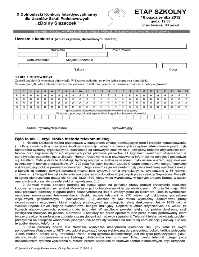 ETAP SZKOLNY X Dolnośląski Konkurs Interdyscyplinarny dla Uczniów Szkół Podstawowych 16 października 2012 godz. 12.00 czas trwania 60 minut „zDolny Ślązaczek” Kuratorium Oświaty we Wrocławiu • Dolnośląski Ośrodek Doskonalenia Nauczycieli we Wrocławiu Uczestnik konkursu (wpisz czytelnie, drukowanymi literami) Nazwisko Data urodzenia Imię / imiona Miejsce urodzenia Szkoła Klasa TABELA ODPOWIEDZI Zakreśl znakiem X właściwą odpowiedź. W każdym zadaniu jest tylko jedna poprawna odpowiedź. W razie pomyłki otocz błędnie zaznaczoną odpowiedź kółkiem i jeszcze raz zaznacz znakiem X dobrą odpowiedź. 1 2 3 4 5 6 7 8 9 10 11 12 13 14 15 16 17 18 19 20 21 22 23 24 25 A A A A A A A A A A A A A A A A A A A A A A A A A B B B B B B B B B B B B B B B B B B B B B B B B B C C C C C C C C C C C C C C C C C C C C C C C C C D D D D D D D D D D D D D D D D D D D D D D D D D Sprawdzenie poprawności odpowiedzi (wypełnia nauczyciel). W każdej z poniższych kratek wpisać 0 lub 1 zgodnie z kluczem odpowiedzi. Suma uzyskanych punktów ……………………… Sprawdzający ………………… Było to tak…, czyli krótka historia telekomunikacji 1. Historię ludzkości można przedstawić w kategoriach zmiany dominujących form i środków komunikowania. (…) Przypomnijmy linię rozwojową środków transmisji. Jednymi z pierwszych urządzeń telekomunikacyjnych były różnorodne systemy sygnalizacyjne, poczynając od umownych znaków ręką, dźwięków bębnów afrykańskich tamtamów oraz sygnałów dymnych używanych przez plemiona pierwotne. O sygnałach świetlnych stosowanych w starożytności wspominał już w „Iliadzie” Homer. Arabowie w celu przekazywania informacji na odległość posługiwali się światłem. Całe wybrzeże Andaluzji, będącej niegdyś w arabskim władaniu, było usiane wieżami sygnałowymi, spełniającymi funkcje przekaźników. W 1792 roku francuski inżynier Claude Chappe skonstruował telegraf optyczny wykorzystujący odbicie promieni słonecznych. Jego zasadniczym elementem były pięciometrowej wysokości wieże, z których za pomocą dźwigni obrotowej można było wysuwać ramie sygnalizacyjne, wyposażone w 86 różnych znaków. (…) Telegraf ten był skutecznie wykorzystywany do celów wojskowych przez cesarza Napoleona. Początki telegrafu elektrycznego datują się na lata 1830-1840, kiedy wielu wynalazców w różnych krajach Europy w swych aparatach wykorzystało zasadę elektromagnetyzmu. (…) 2. Samuel Morse, podczas podróży na statku wpadł na genialnie prosty pomysł przesyłania specjalnie kodowanych sygnałów (tzw. alfabet Morse`a) w jednoobwodowym układzie elektrycznym. W dniu 24 maja 1844 roku przekazał pierwszy telegram przez eksperymentalną linię z Waszyngtonu do Baltimore. Data ta symbolizuje narodziny nowoczesnej telekomunikacji. Szybki rozwój telegrafii w XIX wieku był dyktowany potrzebami wojskowymi, gospodarczymi i politycznymi. (…) Jeszcze w XIX wieku wynalazcy podejmowali próby skonstruowania urządzenia, które mogłoby przekazywać na odległość teksty drukowane. Już w 1855 roku w Wielkiej Brytanii David Hughes skonstruował telegraf drukujący. Dopiero w latach trzydziestych XX wieku, po licznych niepowodzeniach, powrócono do jego idei. W rezultacie powstał teleks, po polsku dalekopis, czyli elektryczna maszyna do pisania, sterowana u odbiorcy nie przez operatora lecz przez taśmę perforowaną, która tworzy urządzenie perforujące zgodnie z przesyłanymi od nadawcy sygnałami. Telegraf i teleks rozwiązały problem przesyłania na odległość wiadomości pisanych, nie pozwalały wszakże na naturalną komunikację głosową. Funkcje te spełnił dopiero telefon. (…) 3. Jako pierwszy aparat taki zbudował wynalazca amerykański Alexander Bell, gdy wraz ze swym pomocnikiem Watsonem w 1876 roku zdołał przekazać drogą elektryczną do sąsiedniego pokoju krótkie polecenie: „Panie Watson, proszę tutaj. Potrzebuje Pana.” Istotą systemu telefonicznego jest nie tylko przekazywanie głosu, ale możliwość porozumiewania się każdego użytkownika sieci z innymi. Toteż rozwój telefonii polegał, poza doskonaleniem systemu wybierania numerów, przede wszystkim na budowie central telefonicznych, czyli urządzeń Wojewódzka Komisja Konkursowa, zDolny Ślązaczek 2012/2013 ETAP SZKOLNY, zDolny Ślązaczek 16 października 2012 r., czas trwania 60 minut łączących wielu abonentów. (…) Jednak telegraf i telefonia nie były jeszcze środkiem wszechstronnej telekomunikacji międzyludzkiej, służyły bowiem wyłącznie do przekazu komunikatów audialnych. Współczesna rewolucja w telefonii polega na rozszerzeniu skali usług o tzw. usługi multimedialne, czyli przekazywanie, np. przez łącza ISDN (Integrated Services Digital Network) dźwięku, obrazu oraz danych w formie cyfrowej. Telefon przybiera formę wideotelefonu, czyli indywidualnej telewizji (w sensie dosłownym - widzenia na odległość, w czasie rzeczywistym). 4. Zarówno telegraf Morse'a, jak i telefon Bella ograniczały korzystanie z transmisji sygnałów wyłącznie do odbiorców stacjonarnych, fizycznie podłączonych do sieci. Tymczasem wojsko i flota potrzebowały także łączności ruchomej, a zatem bezprzewodowej. Potrzebne były nowe formy telekomunikacji, także masowej. Włoch Guglielmo Marconi wykorzystał fale radiowe do przenoszenia dźwięku. W 1895 roku łącząc cewkę oscylacyjną Herza z kluczem telegraficznym Morse'a i uziemioną anteną nadawczą, Marconi zdołał przekazać sygnały na odległość kilku kilometrów. Tak narodziła się nowa forma komunikowania - radio, czyli telekomunikacja bezprzewodowa. 5. Dopiero w XX wieku stało się możliwe przekazywanie ruchomych obrazów drogą radiową, czyli telewizja. W 1925 roku Baird założył firmę Television Limited, pierwszą instytucję zajmującą się transmisją obrazów na odległość. Prawdziwa kariera telewizji zaczęła si