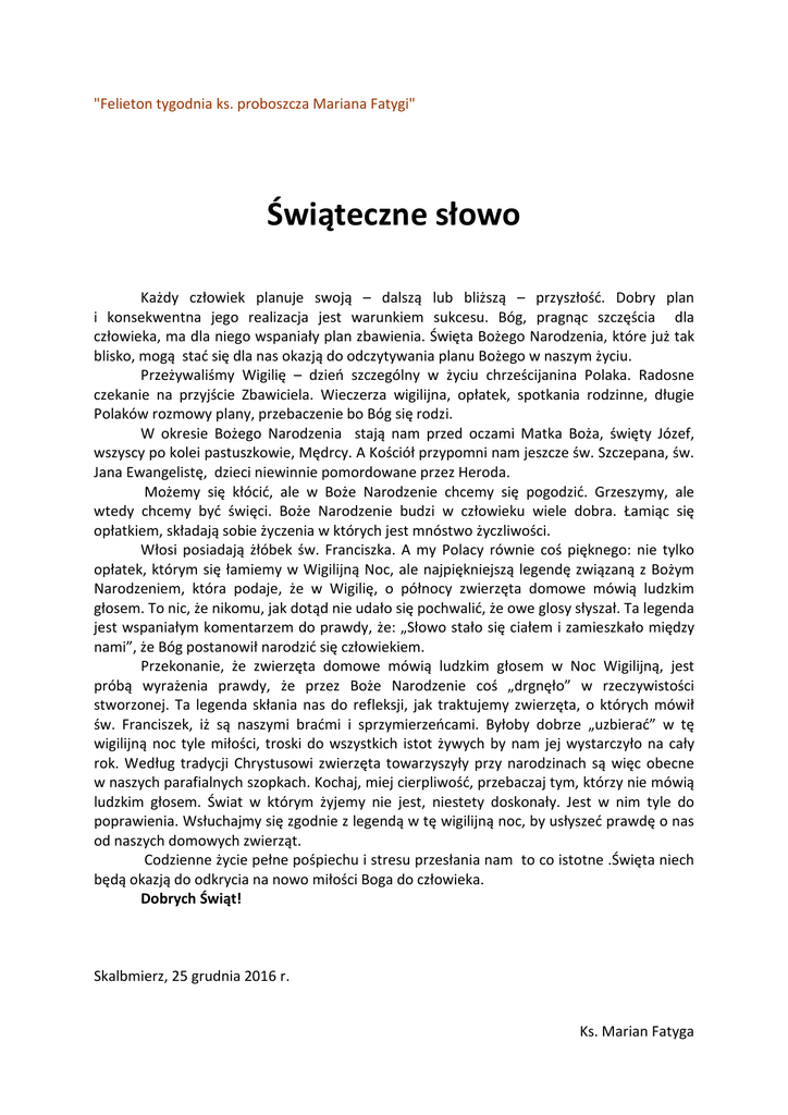"Felieton tygodnia ks. proboszcza Mariana Fatygi" Świąteczne słowo Każdy człowiek planuje swoją – dalszą lub bliższą – przyszłość. Dobry plan i konsekwentna jego realizacja jest warunkiem sukcesu. Bóg, pragnąc szczęścia dla człowieka, ma dla niego wspaniały plan zbawienia. Święta Bożego Narodzenia, które już tak blisko, mogą stać się dla nas okazją do odczytywania planu Bożego w naszym życiu. Przeżywaliśmy Wigilię – dzień szczególny w życiu chrześcijanina Polaka. Radosne czekanie na przyjście Zbawiciela. Wieczerza wigilijna, opłatek, spotkania rodzinne, długie Polaków rozmowy plany, przebaczenie bo Bóg się rodzi. W okresie Bożego Narodzenia stają nam przed oczami Matka Boża, święty Józef, wszyscy po kolei pastuszkowie, Mędrcy. A Kościół przypomni nam jeszcze św. Szczepana, św. Jana Ewangelistę, dzieci niewinnie pomordowane przez Heroda. Możemy się kłócić, ale w Boże Narodzenie chcemy się pogodzić. Grzeszymy, ale wtedy chcemy być święci. Boże Narodzenie budzi w człowieku wiele dobra. Łamiąc się opłatkiem, składają sobie życzenia w których jest mnóstwo życzliwości. Włosi posiadają żłóbek św. Franciszka. A my Polacy równie coś pięknego: nie tylko opłatek, którym się łamiemy w Wigilijną Noc, ale najpiękniejszą legendę związaną z Bożym Narodzeniem, która podaje, że w Wigilię, o północy zwierzęta domowe mówią ludzkim głosem. To nic, że nikomu, jak dotąd nie udało się pochwalić, że owe glosy słyszał. Ta legenda jest wspaniałym komentarzem do prawdy, że: „Słowo stało się ciałem i zamieszkało między nami”, że Bóg postanowił narodzić się człowiekiem. Przekonanie, że zwierzęta domowe mówią ludzkim głosem w Noc Wigilijną, jest próbą wyrażenia prawdy, że przez Boże Narodzenie coś „drgnęło” w rzeczywistości stworzonej. Ta legenda skłania nas do refleksji, jak traktujemy zwierzęta, o których mówił św. Franciszek, iż są naszymi braćmi i sprzymierzeńcami. Byłoby dobrze „uzbierać” w tę wigilijną noc tyle miłości, troski do wszystkich istot żywych by nam jej wystarczyło na cały rok. Według tradycji Chrystusowi zwierzęta towarzyszyły przy narodzinach są więc obecne w naszych parafialnych szopkach. Kochaj, miej cierpliwość, przebaczaj tym, którzy nie mówią ludzkim głosem. Świat w którym żyjemy nie jest, niestety doskonały. Jest w nim tyle do poprawienia. Wsłuchajmy się zgodnie z legendą w tę wigilijną noc, by usłyszeć prawdę o nas od naszych domowych zwierząt. Codzienne życie pełne pośpiechu i stresu przesłania nam to co istotne .Święta niech będą okazją do odkrycia na nowo miłości Boga do człowieka. Dobrych Świąt! Skalbmierz, 25 grudnia 2016 r. Ks. Marian Fatyga