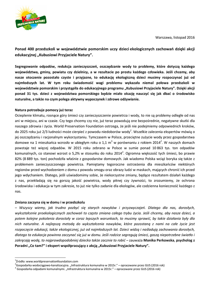 Warszawa, listopad 2016 Ponad 400 przedszkoli w województwie pomorskim uczy dzieci ekologicznych zachowa dzi ki akcji edukacyjnej „Kubusiowi Przyjaciele Natury”. Segregowanie odpadów, redukcja zanieczyszcze , oszcz dzanie wody to problemy, które dotycz ka dego województwa, gminy, powiatu czy dzielnicy, a w rezultacie po prostu ka dego cz owieka. Je li chcemy, aby nasze otoczenie pozosta o czyste i przyjazne, to edukacj ekologiczn dzieci musimy rozpoczyna ju od najm odszych lat. W tym roku wiadomo wagi problemu wykaza a niemal po owa przedszkoli w województwie pomorskim i przyst pi a do edukacyjnego programu „Kubusiowi Przyjaciele Natury”. Dzi ki akcji ponad 31 tys. dzieci z województwa pomorskiego b dzie mia o okazj nauczy si jak dba o rodowisko naturalne, a tak e na czym polega aktywny wypoczynek i zdrowe od ywianie. Natura potrzebuje pomocy ju teraz Ocieplenie klimatu, rosn ce góry mieci czy zanieczyszczenie powietrza i wody, to nie s problemy odleg e od nas ani w miejscu, ani w czasie. Czy tego chcemy czy nie, ju teraz powoduj one bezpo rednie, negatywne skutki dla naszego zdrowia i ycia. World Preservation Foundation ostrzega, e je li nie podejmiemy odpowiednich kroków, do 2025 roku ju 2/3 ludno ci mo e cierpie z powodu niedoborów wody1. Wszelkie zalecenia ekspertów mówi o jej oszcz dzaniu i racjonalnym wykorzystaniu. Tymczasem w Polsce, przeci tne zu ycie wody przez gospodarstwa domowe na 1 mieszka ca wzros o w ubieg ym roku o 1,1 m3 w porównaniu z rokiem 20142. W naszych domach powstaje te wi cej odpadów. W 2015 roku zebrano w Polsce w sumie ponad 10 863 tys. ton odpadów komunalnych, co stanowi wzrost o 5,2% w stosunku do roku 20143. Ogromna wi kszo tych mieci, bo prawie 82% (8 889 tys. ton) pochodzi a w nie z gospodarstw domowych. Jak wiadomo Polska wci boryka si tak e z problemem zanieczyszczonego powietrza. Pami tamy tegoroczne ostrze enia dla mieszka ców niektórych regionów przed wychodzeniem z domu z powodu smogu oraz obrazy ludzi w maskach, maj cych chroni ich przed jego wdychaniem. Dlatego, je li u wiadomimy sobie, e niekorzystne zmiany, b ce rezultatem dzia ka dego z nas, przek adaj si na gorsz jako powietrza, wody pitnej czy ywno ci, to zrozumiemy, e ochrona rodowiska i edukacja w tym zakresie, to ju nie tylko zadanie dla ekologów, ale codzienna konieczno ka dego z nas. Zmiana zaczyna si w domu i w przedszkolu – Wszyscy wiemy, jak trudno pozby si starych nawyków i przyzwyczaje . Dlatego dla nas, doros ych, wykszta cenie proekologicznych zachowa to cz sto zmiana ca ego trybu ycia. Je li chcemy, aby nasze dzieci, a potem kolejne pokolenia dorasta y w coraz lepszych warunkach, to musimy sprawi , by takie dzia ania by y dla nich naturalne. A najlepsz metod do wykszta cenia nawyków, które pozostan z nami na ca e ycie jest rozpocz cie edukacji, tak e ekologicznej, ju od najm odszych lat. Dzieci widz i na laduj zachowania doros ych, dlatego ta edukacja powinna zaczyna si ju w domu. Je li rodzice segreguj mieci, gasz niepotrzebne wiat o i zakr caj wod , to najprawdopodobniej dziecko tak e zacznie to robi – zauwa a Monika Perkowska, psycholog z Poradni „Co tam?” i ekspert wspó pracuj cy z akcj „Kubusiowi Przyjaciele Natury”. 1 ród o: www.worldpreservationfoundation.com Gospodarka wodoci gowo-kanalizacyjna. „Infrastruktura komunalna w 2015r.” – opracowane przez GUS (2016 rok) 3 Gospodarka odpadami komunalnymi. „Infrastruktura komunalna w 2015r.” – opracowane przez GUS (2016 rok) 2 Nie zawsze jednak rodzice s wiadomi konieczno ci edukacji w tym zakresie. Dlatego wa ne, by taka wiedza by a w odpowiedni sposób przekazywana najm odszym ju w przedszkolu, a potem w szkole. Dzi ki wiadomo ci i zaanga owaniu w tak tematyk nauczycieli, dzieci nie tylko mog zdoby podstawow wiedz o ekologii i nauczy si szacunku dla przyrody, ale potem mog mie równie wp yw na zmian postaw we w asnym domu. Jak wiadomo, dzieci ch tnie ucz si nowych rzeczy i pokazuj nabyte, np. w przedszkolu umiej tno ci swoim rodzicom. Dlatego to one ju od najm odszych lat mog sta si przyjació mi natury i agentami pozytywnych zmian, najpierw w naszych domach, a w konsekwencji, za jaki czas, tak e w kraju i na wiecie. Przyjaciele natury Dzi ki programowi edukacyjnemu „Kubusiowi Przyjaciele Natury” nauczyciele i dzieci zyskuj dost p do merytorycznych materia ów, które pomagaj im w proekologicznej edukacji. To akcja, która przez ostatnie 9 lat, obj a swoim zasi giem ponad 3 miliony dzieci. Do tegorocznej IX ju edycji programu, która potrwa do czerwca 2017 roku zg osi o si blisko 7,5 tys. przedszkoli z ca ej Polski. To ponad po owa z ok. 13 000 placówek w naszym kraju. Przek ada si to na 600 tys. dzieci, które wezm udzia w tematycznych zaj ciach lekcyjnych. ród zg oszonych przedszkoli znalaz o si tak e 409 placówek z województwa pomorskiego. Przedszkola, które uczestnicz w programie otrzymuj bezp atne materia y edukacje przygotowane przez metodyków: poradniki dla nauczycieli, ksi eczki dla dzieci, p yty CD z bajkami i dodatkowymi materia ami – czyli wszystko, co mo e pomóc wychowawcom w przeprowadzeniu atrakcyjnych zaj . W ramach realizacji programu, najm odsi poznaj zasady dbania o rodowisko naturalne, aktywnego wypoczynku i zdrowego od ywiania. Naucz si segregowa odpady, wybiera najlepsze formy ruchu oraz rozpoznawa korzy ci, jakie p yn ze spo ywania warzyw i owoców. Potwierdzeniem faktu, e dana placówka dba o wychowanie ekologiczne swoich podopiecznych jest uzyskanie specjalnego certyfikatu. Jak powiedzia a Agnieszka Olszewska, dyrektor Przedszkola „Magic Fish” bior cego udzia w akcji – Czujemy si odpowiedzialni za to, jak kolejne pokolenia b traktowa nasz planet , dlatego równie w tym roku zdecydowali my si przyst pi do akcji „Kubusiowi Przyjaciele Natury”, w której regularnie bierzemy udzia od kilku lat. Dla naszych podopiecznych to okazja do nauczenia si zachowa , które prze si potem na ich ekologiczn postaw w kolejnych latach ycia. Jedno