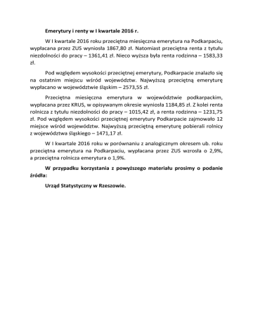 Emerytury i renty w I kwartale 2016 r. W I kwartale 2016 roku przeciętna miesięczna emerytura na Podkarpaciu, wypłacana przez ZUS wyniosła 1867,80 zł. Natomiast przeciętna renta z tytułu niezdolności do pracy – 1361,41 zł. Nieco wyższa była renta rodzinna – 1583,33 zł. Pod względem wysokości przeciętnej emerytury, Podkarpacie znalazło się na ostatnim miejscu wśród województw. Najwyższą przeciętną emeryturę wypłacano w województwie śląskim – 2573,55 zł. Przeciętna miesięczna emerytura w województwie podkarpackim, wypłacana przez KRUS, w opisywanym okresie wyniosła 1184,85 zł. Z kolei renta rolnicza z tytułu niezdolności do pracy – 1015,42 zł, a renta rodzinna – 1231,75 zł. Pod względem wysokości przeciętnej emerytury Podkarpacie zajmowało 12 miejsce wśród województw. Najwyższą przeciętną emeryturę pobierali rolnicy z województwa śląskiego – 1471,17 zł. W I kwartale 2016 roku w porównaniu z analogicznym okresem ub. roku przeciętna emerytura na Podkarpaciu, wypłacana przez ZUS wzrosła o 2,9%, a przeciętna rolnicza emerytura o 1,9%. W przypadku korzystania z powyższego materiału prosimy o podanie źródła: Urząd Statystyczny w Rzeszowie.