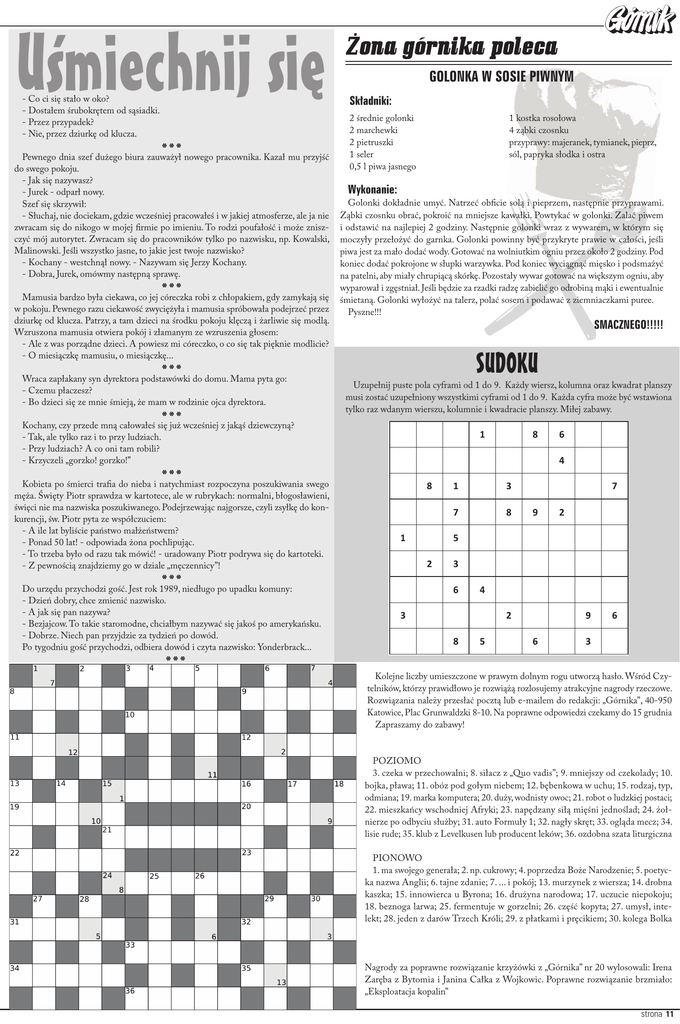 Uśmiechnij się - Co ci się stało w oko? - Dostałem śrubokrętem od sąsiadki. - Przez przypadek? - Nie, przez dziurkę od klucza. *** Pewnego dnia szef dużego biura zauważył nowego pracownika. Kazał mu przyjść do swego pokoju. - Jak się nazywasz? - Jurek - odparł nowy. Szef się skrzywił: - Słuchaj, nie dociekam, gdzie wcześniej pracowałeś i w jakiej atmosferze, ale ja nie zwracam się do nikogo w mojej firmie po imieniu. To rodzi poufałość i może zniszczyć mój autorytet. Zwracam się do pracowników tylko po nazwisku, np. Kowalski, Malinowski. Jeśli wszystko jasne, to jakie jest twoje nazwisko? - Kochany - westchnął nowy. - Nazywam się Jerzy Kochany. - Dobra, Jurek, omówmy następną sprawę. *** Mamusia bardzo była ciekawa, co jej córeczka robi z chłopakiem, gdy zamykają się w pokoju. Pewnego razu ciekawość zwyciężyła i mamusia spróbowała podejrzeć przez dziurkę od klucza. Patrzy, a tam dzieci na środku pokoju klęczą i żarliwie się modlą. Wzruszona mamusia otwiera pokój i złamanym ze wzruszenia głosem: - Ale z was porządne dzieci. A powiesz mi córeczko, o co się tak pięknie modlicie? - O miesiączkę mamusiu, o miesiączkę... Żona górnika poleca GOLONKA W SOSIE PIWNYM Składniki: 2 średnie golonki 2 marchewki 2 pietruszki 1 seler 0,5 l piwa jasnego 1 kostka rosołowa 4 ząbki czosnku przyprawy: majeranek, tymianek, pieprz, sól, papryka słodka i ostra Wykonanie: Golonki dokładnie umyć. Natrzeć obficie solą i pieprzem, następnie przyprawami. Ząbki czosnku obrać, pokroić na mniejsze kawałki. Powtykać w golonki. Zalać piwem i odstawić na najlepiej 2 godziny. Następnie golonki wraz z wywarem, w którym się moczyły przełożyć do garnka. Golonki powinny być przykryte prawie w całości, jeśli piwa jest za mało dodać wody. Gotować na wolniutkim ogniu przez około 2 godziny. Pod koniec dodać pokrojone w słupki warzywka. Pod koniec wyciągnąć mięsko i podsmażyć na patelni, aby miały chrupiącą skórkę. Pozostały wywar gotować na większym ogniu, aby wyparował i zgęstniał. Jeśli będzie za rzadki radzę zabielić go odrobiną mąki i ewentualnie śmietaną. Golonki wyłożyć na talerz, polać sosem i podawać z ziemniaczkami puree. Pyszne!!! SMACZNEGO!!!!! SUDOKU *** Wraca zapłakany syn dyrektora podstawówki do domu. Mama pyta go: - Czemu płaczesz? - Bo dzieci się ze mnie śmieją, że mam w rodzinie ojca dyrektora. *** Uzupełnij puste pola cyframi od 1 do 9. Każdy wiersz, kolumna oraz kwadrat planszy musi zostać uzupełniony wszystkimi cyframi od 1 do 9. Każda cyfra może być wstawiona tylko raz wdanym wierszu, kolumnie i kwadracie planszy. Miłej zabawy. Kochany, czy przede mną całowałeś się już wcześniej z jakąś dziewczyną? - Tak, ale tylko raz i to przy ludziach. - Przy ludziach? A co oni tam robili? - Krzyczeli „gorzko! gorzko!” 1 8 6 4 *** Kobieta po śmierci trafia do nieba i natychmiast rozpoczyna poszukiwania swego męża. Święty Piotr sprawdza w kartotece, ale w rubrykach: normalni, błogosławieni, święci nie ma nazwiska poszukiwanego. Podejrzewając najgorsze, czyli zsyłkę do konkurencji, św. Piotr pyta ze współczuciem: - A ile lat byliście państwo małżeństwem? - Ponad 50 lat! - odpowiada żona pochlipując. - To trzeba było od razu tak mówić! - uradowany Piotr podrywa się do kartoteki. - Z pewnością znajdziemy go w dziale „męczennicy”! 8 1 3 7 8 7 9 2 5 2 *** Do urzędu przychodzi gość. Jest rok 1989, niedługo po upadku komuny: - Dzień dobry, chce zmienić nazwisko. - A jak się pan nazywa? - Bezjajcow. To takie staromodne, chciałbym nazywać się jakoś po amerykańsku. - Dobrze. Niech pan przyjdzie za tydzień po dowód. Po tygodniu gość przychodzi, odbiera dowód i czyta nazwisko: Yonderbrack... 1 3 6 4 3 2 8 5 9 6 6 3 *** Kolejne liczby umieszczone w prawym dolnym rogu utworzą hasło. Wśród Czytelników, którzy prawidłowo je rozwiążą rozlosujemy atrakcyjne nagrody rzeczowe. Rozwiązania należy przesłać pocztą lub e-mailem do redakcji: „Górnika”, 40-950 Katowice, Plac Grunwaldzki 8-10. Na poprawne odpowiedzi czekamy do 15 grudnia Zapraszamy do zabawy! POZIOMO 3. czeka w przechowalni; 8. siłacz z „Quo vadis”; 9. mniejszy od czekolady; 10. bojka, pława; 11. obóz pod gołym niebem; 12. bębenkowa w uchu; 15. rodzaj, typ, odmiana; 19. marka komputera; 20. duży, wodnisty owoc; 21. robot o ludzkiej postaci; 22. mieszkańcy wschodniej Afryki; 23. napędzany siłą mięśni jednoślad; 24. żołnierze po odbyciu służby; 31. auto Formuły 1; 32. nagły skręt; 33. ogląda mecz; 34. lisie rude; 35. klub z Levelkusen lub producent leków; 36. ozdobna szata liturgiczna PIONOWO 1. ma swojego generała; 2. np. cukrowy; 4. poprzedza Boże Narodzenie; 5. poetycka nazwa Anglii; 6. tajne zdanie; 7. ... i pokój; 13. murzynek z wiersza; 14. drobna kaszka; 15. innowierca u Byrona; 16. drużyna narodowa; 17. uczucie niepokoju; 18. beznoga larwa; 25. fermentuje w gorzelni; 26. część kopyta; 27. umysł, intelekt; 28. jeden z darów Trzech Króli; 29. z płatkami i pręcikiem; 30. kolega Bolka Nagrody za poprawne rozwiązanie krzyżówki z „Górnika” nr 20 wylosowali: Irena Zaręba z Bytomia i Janina Całka z Wojkowic. Poprawne rozwiązanie brzmiało: „Eksploatacja kopalin” strona 11