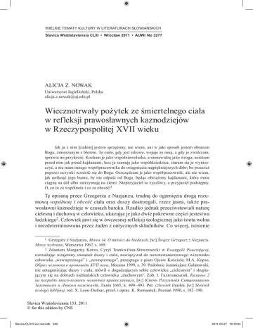 WIELKIE TEMATY KULTURY W LITERATURACH SŁOWIAŃSKICH Slavica Wratislaviensia CLIII • Wrocław 2011 • AUWr No 3277 ALICJA Z. NOWAK Uniwersytet Jagielloński, Polska [email protected] Wiecznotrwały pożytek ze śmiertelnego ciała w refleksji prawosławnych kaznodziejów w Rzeczypospolitej XVII wieku Jak ja z nim [ciałem] jestem sprzężony, nie wiem, ani w jaki sposób jestem obrazem Boga, zmieszanym z błotem. To ciało, gdy jest zdrowe, wojuje ze mną, a gdy je zwalczam, sprawia mi przykrość. Kocham je jako współniewolnika, a nienawidzę jako wroga; uciekam przed nim jak przed kajdanami, lecz je szanuję jako współdziedzica; staram się je wyniszczyć, a nie mam innego współpracownika do osiągnięcia najpiękniejszych dóbr; bo przecież poprzez uczynki wznieść się do Boga. Oszczędzam je jako współpracownik, ale nie wiem, jak uniknąć jego buntu, by nie odpaść od Boga, będąc obciążony kajdanami, które mnie ciągną na dół albo zatrzymują na ziemi. Nieprzyjaciel to życzliwy, a przyjaciel podstępny. O, co to za wspólnota i co za obcość!1 Tę opisaną przez Grzegorza z Nazjanzu, trudną do ogarnięcia drogą rozumową wspólnotę i obcość ciała oraz duszy dostrzegali, rzecz jasna, także prawosławni kaznodzieje w czasach baroku. Rzadko jednak przeciwstawiali naturę cielesną i duchową w człowieku, ukazując je jako dwie pokrewne części jestestwa ludzkiego2. Człowiek jawi się w ówczesnej refleksji teologicznej jako istota wolna i niezdeterminowana przez żaden z ontycznych składników. Co więcej, istnienie 1 Grzegorz z Nazjanzu, Mowa 14. O miłości do biednych, [w:] Święty Grzegorz z Nazjanzu. Mowy wybrane, Warszawa 1967, s. 169. 2 Zdaniem Margarity Korzo, Cyryl Trankwilion-Stawrowecki w Ewangelii Pouczającej, rozważając wzajemny stosunek duszy i ciała, nawiązywał do nowotestamentowego wizerunku człowieka „wewnętrznego” i „zewnętrznego”, przejętego z pism Ojców Kościoła; М.А. Корзо, Образ человека в проповеди XVII века, Москва 1999, s. 39. Podobnie Joannicjusz Galatowski, nie antagonizując duszy i ciała, mówił o dogadzającym sobie człowieku „cielesnym” i skupiającym się na dobrach niebiańskich człowieku „duchowym”. Zob. І. Галятовський, Казаньє 2 на погребѣ якого-колвекъ чоловѣка православнаго, [w:] Ключъ Pазумѣнія Священникомъ Законнымъ и Ляиком належачїй, Львів 1665, k. 490–493. Por. człowiek (hasło), [w:] Słownik teologii biblijnej, red. X. Leon-Dufour, przeł. i oprac. K. Romaniuk, Poznań 1990, s. 182–190. Slavica Wratislaviensia 153, 2011 © for this edition by CNS Slavica CLIII II kor red.indb 539 2011-04-27 10:10:04 540 • Alicja Z. Nowak w świecie i człowieku danej przez Stwórcę materii wyklucza traktowanie ciała jako kary. Z takiej bowiem ludzkiej kondycji wypływa wiele, obszernie omówionych w XVII-wiecznej literaturze homiletycznej, korzyści dla człowieka. Jedna z istotnych zalet posiadania śmiertelnego, kruchego i podlegającego chorobom ciała wynika z faktu, że ze względu na liczne fizyczne potrzeby, słabości i żądze3 jest ono dla człowieka od czasu upadku pierwszych rodziców wyzwaniem, egzaminem duchowej i religijnej dojrzałości. Jest zatem sprzymierzeńcem w zdobywaniu nagrody niebieskiej. Ciało — przekonywał Jan Chryzostom — jest „niższe od duszy i mniej doskonałe, jednak nie wrogie jej, ani nie walczące z nią, ani nie złe […]”4. W XVII-wiecznych kazaniach również podnoszony był problem wzajemnej zależności duszy i ciała w człowieku. Na przykład katolicki kaznodzieja Tomasz Młodzianowski wyraził opinię, że ludzka natura jest niedoskonała właśnie z racji połączenia duszy z ciałem. Jest to też powód, dla którego człowiek zajmuje w hierarchii stworzeń poziom niższy od aniołów5. Na tym tle ciekawie brzmią wypowiedzi ówczesnych prawosławnych mówców. Wileński archimandryta Leoncjusz Karpowicz zgadzał się z tezą, że szlachectwo wynika z posiadania duszy, gdy pisał: Mamy [...] ten tak drogi nieoszacowany skarb to jest duszę, rzecz tak zacna i piękna, iż się w niej niebieski oblubieniec zakochawszy z onych kosztownych pałaców swoich do tej bydlęcej stajni zstąpić zezwolił i na zmycie zmaz, któremi się była przez grzech oszpeciła najdroższej krwie swojej wylać nie żałował w ciele chorobom i samej śmierci podległym6. Jednocześnie istnienie ciała było dla ojca Leoncjusza i innych prawosławnych teologów świadectwem wyższości człowieka nad istotami natury duchowej7. Wyższość ta była ściśle związana z Wcieleniem, świadectwo ziemskiego życia Syna Bożego niosło dobitny dowód nobilitacji zarówno duszy, jak i ciała. A przebóstwienie całego człowieka urzeczywistniło się — jak głosił kaznodzieja — w narodzinach i śmierci Chrystusa, który nie anielską, lecz „ludzką naturę na się przybrał”, rodząc się w stajence, a także w osobie Jego Matki, którą tak uczcił, że Ją „nad anioły, Archanioły, Cherubiny i Serafiny wywyższywszy, najbliżej 3 O udrękach związanych z posiadaniem ciała Grzegorz z Nyssy pisał między innymi w Mowie pogrzebowej o cesarzowej Placylli. Por. idem, Wybór pism, przeł. W. Kania, Warszawa 1974, s. 109. 4 Kontynuując powyższy wywód, Chryzostom pisał: „[ciało] podlega duszy, jak cytra cytrzyście i jak okręt sternikowi, które nie są przeciwne prowadzącym je i używającym ich, ale nawet pozostają z nimi w wielkiej harmonii, tylko że nie mają równej wartości z mistrzem”. Św. Jan Chryzostom, Homilie na list św. Pawła do Rzymian, t. 1, przeł. T. Sinko, oprac. A. Baron, Kraków 1995, s. 195–196. 5 Por. L. Berezhnaya, Fear, and Death in the Catholic and Orthodox Sermons in the 16th–17th Century Polish-Lithuanian Commonwealth (An Attempt at Comparison),