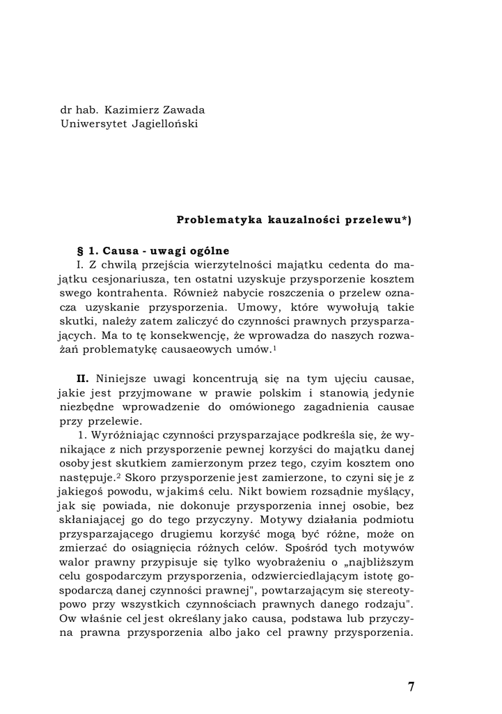 dr hab. Kazimierz Zawada Uniwersytet Jagielloński Problematyka kauzalności przelewu*) § 1. Causa - uwagi ogólne I. Z chwilą przejścia wierzytelności majątku cedenta do majątku cesjonariusza, ten ostatni uzyskuje przysporzenie kosztem swego kontrahenta. Również nabycie roszczenia o przelew oznacza uzyskanie przysporzenia. Umowy, które wywołują takie skutki, należy zatem zaliczyć do czynności prawnych przysparzających. Ma to tę konsekwencję, że wprowadza do naszych rozważań problematykę causaeowych umów.1 II. Niniejsze uwagi koncentrują się na tym ujęciu causae, jakie jest przyjmowane w prawie polskim i stanowią jedynie niezbędne wprowadzenie do omówionego zagadnienia causae przy przelewie. 1. Wyróżniając czynności przysparzające podkreśla się, że wynikające z nich przysporzenie pewnej korzyści do majątku danej osoby jest skutkiem zamierzonym przez tego, czyim kosztem ono następuje.2 Skoro przysporzenie jest zamierzone, to czyni się je z jakiegoś powodu, w jakimś celu. Nikt bowiem rozsądnie myślący, jak się powiada, nie dokonuje przysporzenia innej osobie, bez skłaniającej go do tego przyczyny. Motywy działania podmiotu przysparzającego drugiemu korzyść mogą być różne, może on zmierzać do osiągnięcia różnych celów. Spośród tych motywów walor prawny przypisuje się tylko wyobrażeniu o „najbliższym celu gospodarczym przysporzenia, odzwierciedlającym istotę gospodarczą danej czynności prawnej", powtarzającym się stereotypowo przy wszystkich czynnościach prawnych danego rodzaju". Ow właśnie cel jest określany jako causa, podstawa lub przyczyna prawna przysporzenia albo jako cel prawny przysporzenia. 7 R E J E N T Nr 2 - luty 1992 r. Można więc powiedzieć, że causa w powyższym znaczeniu stanowi „prawniczo ujęty cel przysporzenia, który tłumaczy dlaczego przysporzenie zostało dokonane". Podkreślony jest tu przede wszystkim subiektywny aspekt causae, przez wskazanie, że tłumaczy ona, dlaczego przysporzenie zostało dokonane, ale i zasygnalizowany jest jej aspekt obiektywny - przez zaznaczenie, iż stanowi ona cel typowy, związany z istotą gospodarczą danej czynności.3 Tradycyjnie w naszej doktrynie wyróżnia się trzy postacie causae. Są to: - causa solvendi - przysporzenie następuje celem zwolnienia z długu; podstawą prawną przysporzenia jest więc zamiar, chęć zwolnienia się z obowiązania; - causa obligandi vel acąuirendi - przysporzenie następuje w celu uzyskania jakiejś korzyści majątkowej; przysparzający podejmuje zatem swą czynność dlatego, że w zamian otrzymuje pewną korzyść majątkową; - causa donandi - przysporzenie ma stanowić wyłącznie akt szczodrobliwości. Jedni autorzy uważają, że ten trójpodział jest w zasadzie wyczerpujący.4 Inni są zdania, że można, a nawet należy, wprowadzić inne jeszcze postacie causae, w szczególności causam zabezpieczającą (causa cavendi). 5 Prawne znaczenie causae wyraża się w jej wpływie na ważność czynności przysparzających lub na definitywność przysporzenia. Czynności prawne przysparzające, w zależności od tego czy causa wpływa na ich ważność, dzieli się na klauzule przyczynowe i abstrakcyjne, czyli oderwane od causae. Ważność czynności kauzalnych zależy od istnienia i prawidłowości causae, uchybienie tej przesłance powoduje bezwzględną nieważność czynności. Natomiast czynności abstrakcyjne są ważne także w przypadku braku lub wadliwości causae, ale dokonywane wówczas przysporzenie nie jest definitywne i podlega zwrotowi na podstawie przepisów o bezpodstawnym wzbogaceniu. Obie te konstrukcje uznają więc prawną doniosłość causae przy czynnościach przysparzających, a różnią się tylko tym, że wiążą inne konsekwencje z jej brakiem lub nieprawidłowością. Konstrukcja czynności abstrakcyjnej jest powszechnie krytykowana za sztucz- 8 Problematyka kauzalności przelewu ność, nieliczenie się z wolą przysparzającego - skoro bowiem przysparzający chce dokonać swej czynności tylko w określonym celu, oddającym jej sens gospodarczy, nie powinno się uznawać tej czynności za ważną mimo nieosiągnięcia tego celu.6 Poszczególne systemy prawne, na tle których wyłania się problematyka causae, dopuszczają jednak w pewnym zakresie, niekiedy zupełnie tylko marginalnie, czynności abstrakcynej. Uzasadnia się to zwykle potrzebami obrotu, potrzebą jego pewności i szybkości. 2. Z powyższych wypowiedzi wynikałoby, że problematyka causae dotyczy w jednakowym stopniu wszystkich czynności przysparzających. Jednak już uwagi prawnoporównawcze pouczają, że tak być nie musi. Interesująca różnica zachodzi pomiędzy ustawodawstwami, zwłaszcza między francuskim Kodeksem cywilnym a kodeksami: austriackim, niemieckim i szwajcarskim, gdy chodzi o traktowanie causae przy umowach zobowiązujących. Różnica ta wynika z rozejścia się poglądów nauki francuskiej i niemieckiej na doniosłość problematyki causae przy umowie zobowiązującej z chwilą ugruntowania się w XVII w. na terenie Francji i Niemiec zasady swobody umów, wyrażającej się w możliwości kreowania zobowiązań w drodze nieformalnej, swobodnie kształtowanej przez strony w zakresie treści, umowy kauzalnej. Francuski Kodeks cywilny zaliczył causam pod wpływem nauki do przesłanek ważności umowy zobowiązującej (art. 1108). Stosownie do art. 1131 tego Kodeksu „zobowiązanie bez przyczyny albo o przyczynie fałszywej lub niegodziwej nie może mieć żadnego skutku". Inne kwestie dotyczące causae, a mianowicie, że nie musi być ona wyrażona w umowie oraz kiedy jest niegodziwa, zostały unormowane w art. 1132 i 1133; zgodnie z tym ostatnim przepisem „przyczyna jest niegodziwa, gdy jest zabroniona prawem, przeciwna dobrym obyczajom lub porządkowi publicznemu". Według nauki francuskiej i twórców francuskiego Kodeksu cywilnego, wymóg godziwej causae dla ważności umowy mia