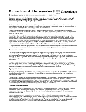 Rozdawnictwo akcji bez prywatyzacji - pisze Stefan Kawalec* 2010-01-19, ostatnia aktualizacja 2010-01-19 20:47:46.0 Dawanie darmowych akcji pracownikom prywatyzowanych firm ma tylko wtedy sens, gdy państwo faktycznie pozbywa się kontroli nad spółką. Inaczej rodzi to patologie, których jaskrawym przykładem jest sytuacja w KGHM Rząd zapowiada przyspieszenie prywatyzacji. W ciągu dwóch lat chce sprzedać akcje ponad 800 spółek. Przychody z prywatyzacji planowane w roku 2010 mają wynieść 25 mld zł, czyli około trzy i pół razy więcej niż w 2009 r. Środki te mają wesprzeć finanse państwa, ograniczając wzrost długu publicznego. Zgodnie z obowiązująca od 1996 roku ustawą o komercjalizacji i prywatyzacji, z chwilą sprzedania inwestorom zewnętrznym pierwszych należących do skarbu państwa akcji spółki, jej pracownicy uzyskują prawo do otrzymania za darmo do 15 proc. akcji. "Gazeta" (12-13 grudnia 2009) napisała, że związki zawodowe przygotowują wielką kampanię informacyjną dla pracowników dotyczącą uprawnień do bezpłatnych akcji i szacują, że do załóg trafią z tego tytułu miliardy złotych. "Gazeta" odnotowuje głos przedstawiciela PKPP Lewiatan Jeremiego Mordasewcza, który oburza się na dawanie pracownikom darmowych akcji jako łapówki za zgodę na prywatyzację zakładów, których powstanie finansowało cale społeczeństwo. Szef "Solidarności" Poczty Polskiej, gdzie darmowe akcje ma dostać ponad 120 tysięcy aktualnych i byłych pracowników, odpowiada, że to pracownicy tworzyli majątek firmy i należy im się prawo do akcji. Ta kontrowersja jest okazją do przypomnienia, jakie jest ekonomiczne uzasadnienie dla przyznania pracownikom akcji na preferencyjnych warunkach i kiedy z punktu widzenia interesu całego społeczeństwa ma to sens. Prywatyzacja: korzyści Choć zdarzają się przypadki odnoszących sukcesy przedsiębiorstw państwowych, to generalnie firmy państwowe są tworami nieefektywnymi. Doświadczenia wielu krajów w XX wieku wykazały, że w warunkach konkurencji przedsiębiorstwa państwowe osiągają przeciętnie wyniki ekonomiczne, znacznie gorsze niż porównywalne firmy prywatne. Po latach poszukiwań skutecznych sposobów podniesienia sprawności firm publicznych w demokratycznych krajach kapitalistycznych uznano, że najlepszym sposobem jest prywatyzacja, czyli sprzedaż firm prywatnym właścicielom. W Polsce po 20 latach transformacji udział sektora państwowego w gospodarce jest wciąż znacznie większy niż w najbogatszych krajach Zachodu. Prywatyzacja w Polsce leży w interesie całego społeczeństwa - po to by oddzielić firmy od polityki, zwiększyć konkurencję i efektywność gospodarki, aby produkt krajowy i zamożność Polaków mogły rosnąć szybciej, byśmy szybciej mogli zmniejszać lukę rozwojową w stosunku do Zachodu. Prywatyzacja: obawy Wiele przykładów pokazuje, że zwlekanie z prywatyzacją prowadzi firmy do upadku. Ale sprzedaż firm często wywołuje niepewność ich menedżerów i pracowników. Mimo że obawy te są często nieuzasadnione, w wielu przypadkach hamują prywatyzację. Polska nie jest wyjątkiem, bo podobne obawy występowały także w innych krajach. Pragmatyczne podejście do tego zagadnienia zastosowano po raz pierwszy na dużą skalę w Wielkiej Brytanii w latach 80. XX wieku podczas prywatyzacji za rządów Margaret Thatcher. Pracownikom i menedżerom sprzedawanych firm udostępniano część akcji na preferencyjnych warunkach. Taka rekompensata i zachęta dla tych, którzy potencjalnie mogli zostać poszkodowani w wyniki zmiany własnościowej, ułatwiła sprawny przebieg brytyjskiej prywatyzacji. Czy dawać akcje pracownikom Z doświadczenia brytyjskiego czerpano przy pisaniu polskiej ustawy prywatyzacyjnej z 1990 r. Przyznano wówczas pracownikom prawo do nabycia do 20 procent akcji za połowę ceny. Nowa ustawa z roku 1996 umożliwia pracownikom otrzymanie do 15 proc. akcji, ale za to za darmo. Można dyskutować, czy skala i konstrukcja tych uprawnień jest właściwa. Ale sam fakt przyznawania pracownikom prywatyzowanych firm puli akcji na zasadach preferencyjnych jest rozwiązaniem słusznym i racjonalnym. W sytuacji, gdy prywatyzacja przedsiębiorstwa przynosi korzyść dla gospodarki, ogółu podatników i obywateli, racjonalne jest przyznanie zachęt i rekompensat tym, którzy na własnej skórze ponoszą skutki tej operacji. Bez stworzenia minimum bezpieczeństwa i zachęt dla menedżerów i pracowników sprawne przeprowadzenie prywatyzacji dużej liczby przedsiębiorstw byłoby bardzo trudne, a nawet niemożliwe. Można więc powiedzieć, że akcje dla pracowników to racjonalny koszt ponoszony przez społeczeństwo i gospodarkę, po to by odnosić korzyści ze sprawnej prywatyzacji. Na czym polega prawdziwa prywatyzacja Prywatyzacja nie następuje przez samo przekształcenie przedsiębiorstwa państwowego w spółkę ani przez wprowadzenie akcji spółki na giełdę, ani przez udostępnienia części akcji innym akcjonariuszom. Prywatyzacja w pełnym tego słowa znaczeniu ma miejsce dopiero wtedy, gdy kontrola zarządcza nad firmą przechodzi w ręce prywatnych akcjonariuszy. Natomiast w przypadku gdy pakiet kontrolny pozostaje ręku państwa, społeczeństwo i gospodarka nie odnoszą korzyści w postaci wyjęcia firmy spod kurateli państwowej. Prezesi nie mogą koncentrować swojej uwagi na biznesie, bo ich przyszłość zależy od polityków i najczęściej tracą stanowiska z przyczyn zupełnie innych niż wyniki ekonomiczne firmy. Akcje dla pracowników - tak, ale... Niestety, w niektórych prywatyzowanych w Polsce firmach, doszło do sytuacji, że państwo sprzedało część akcji inwestorom zewnętrznym, pracownicy dostali swoje 15 proc. udziałów, ale kontrola nad spółką i tak pozostała w rękach skarbu państwa. Takie zachowanie - przyznanie darmowych akcji załodze przy zachowaniu kontroli państwa ma niewiele wspólnego z racjonalny