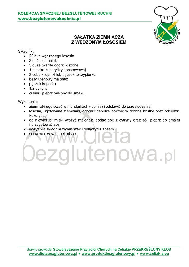 KOLEKCJA SMACZNEJ BEZGLUTENOWEJ KUCHNI www.bezglutenowakuchnia.pl SAŁATKA ZIEMNIACZA Z WĘDZONYM ŁOSOSIEM Składniki: 20 dkg wędzonego łososia 3 duże ziemniaki 3 duże twarde ogórki kiszone 1 puszka kukurydzy konserwowej 3 cebulki dymki lub pęczek szczypiorku bezglutenowy majonez pęczek koperku 1/2 cytryny cukier i pieprz mielony do smaku Wykonanie: ziemniaki ugotować w mundurkach (łupinie) i odstawić do przestudzenia łososia, ugotowane ziemniaki, ogórki i cebulkę pokroić w drobną kostkę oraz odcedzić kukurydzę do niewielkiej miski włożyć majonez, dodać sok z cytryny oraz sól, pieprz do smaku i przygotować sos wszystkie składniki wymieszać i połączyć z sosem serwować w szklanej misce Serwis prowadzi Stowarzyszenie Przyjaciół Chorych na Celiakię PRZEKREŚLONY KŁOS www.dietabezglutenowa.pl ● www.produktbezglutenowy.pl ● www.celiakia.eu