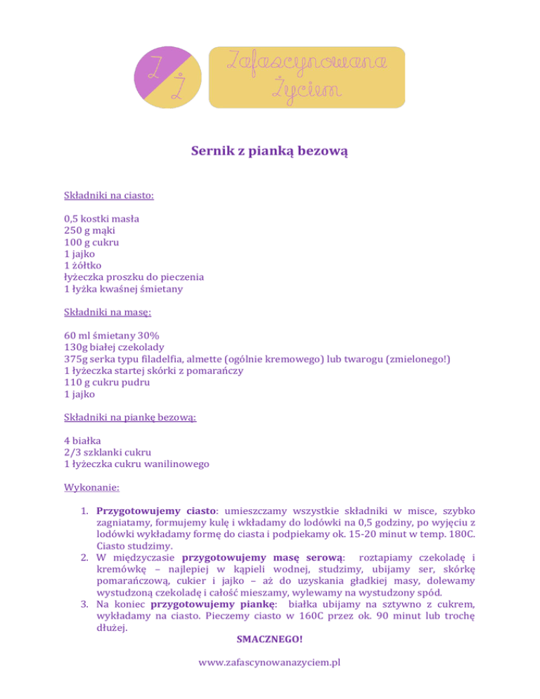 Sernik z pianką bezową Składniki na ciasto: 0,5 kostki masła 250 g mąki 100 g cukru 1 jajko 1 żółtko łyżeczka proszku do pieczenia 1 łyżka kwaśnej śmietany Składniki na masę: 60 ml śmietany 30% 130g białej czekolady 375g serka typu filadelfia, almette (ogólnie kremowego) lub twarogu (zmielonego!) 1 łyżeczka startej skórki z pomarańczy 110 g cukru pudru 1 jajko Składniki na piankę bezową: 4 białka 2/3 szklanki cukru 1 łyżeczka cukru wanilinowego Wykonanie: 1. Przygotowujemy ciasto: umieszczamy wszystkie składniki w misce, szybko zagniatamy, formujemy kulę i wkładamy do lodówki na 0,5 godziny, po wyjęciu z lodówki wykładamy formę do ciasta i podpiekamy ok. 15-20 minut w temp. 180C. Ciasto studzimy. 2. W międzyczasie przygotowujemy masę serową: roztapiamy czekoladę i kremówkę – najlepiej w kąpieli wodnej, studzimy, ubijamy ser, skórkę pomarańczową, cukier i jajko – aż do uzyskania gładkiej masy, dolewamy wystudzoną czekoladę i całość mieszamy, wylewamy na wystudzony spód. 3. Na koniec przygotowujemy piankę: białka ubijamy na sztywno z cukrem, wykładamy na ciasto. Pieczemy ciasto w 160C przez ok. 90 minut lub trochę dłużej. SMACZNEGO! www.zafascynowanazyciem.pl