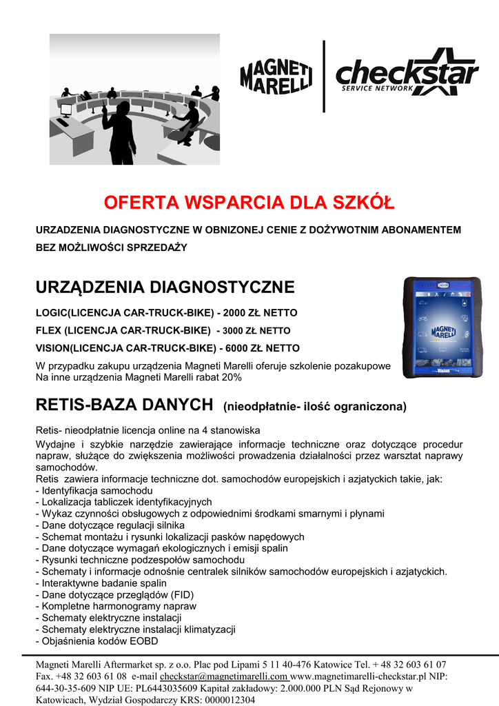 OFERTA WSPARCIA DLA SZKÓŁ URZADZENIA DIAGNOSTYCZNE W OBNIZONEJ CENIE Z DOŻYWOTNIM ABONAMENTEM BEZ MOŻLIWOŚCI SPRZEDAŻY URZĄDZENIA DIAGNOSTYCZNE LOGIC(LICENCJA CAR-TRUCK-BIKE) - 2000 ZŁ NETTO FLEX (LICENCJA CAR-TRUCK-BIKE) - 3000 ZŁ NETTO VISION(LICENCJA CAR-TRUCK-BIKE) - 6000 ZŁ NETTO W przypadku zakupu urządzenia Magneti Marelli oferuje szkolenie pozakupowe Na inne urządzenia Magneti Marelli rabat 20% RETIS-BAZA DANYCH (nieodpłatnie- ilość ograniczona) Retis- nieodpłatnie licencja online na 4 stanowiska Wydajne i szybkie narzędzie zawierające informacje techniczne oraz dotyczące procedur napraw, służące do zwiększenia możliwości prowadzenia działalności przez warsztat naprawy samochodów. Retis zawiera informacje techniczne dot. samochodów europejskich i azjatyckich takie, jak: - Identyfikacja samochodu - Lokalizacja tabliczek identyfikacyjnych - Wykaz czynności obsługowych z odpowiednimi środkami smarnymi i płynami - Dane dotyczące regulacji silnika - Schemat montażu i rysunki lokalizacji pasków napędowych - Dane dotyczące wymagań ekologicznych i emisji spalin - Rysunki techniczne podzespołów samochodu - Schematy i informacje odnośnie centralek silników samochodów europejskich i azjatyckich. - Interaktywne badanie spalin - Dane dotyczące przeglądów (FID) - Kompletne harmonogramy napraw - Schematy elektryczne instalacji - Schematy elektryczne instalacji klimatyzacji - Objaśnienia kodów EOBD Magneti Marelli Aftermarket sp. z o.o. Plac pod Lipami 5 11 40-476 Katowice Tel. + 48 32 603 61 07 Fax. +48 32 603 61 08 e-mail [email protected] www.magnetimarelli-checkstar.pl NIP: 644-30-35-609 NIP UE: PL6443035609 Kapitał zakładowy: 2.000.000 PLN Sąd Rejonowy w Katowicach, Wydział Gospodarczy KRS: 0000012304 PLAKATY TECHNICZNE (nieodpłatnie) Magneti Marelli Aftermarket sp. z o.o. Plac pod Lipami 5 11 40-476 Katowice Tel. + 48 32 603 61 07 Fax. +48 32 603 61 08 e-mail [email protected] www.magnetimarelli-checkstar.pl NIP: 644-30-35-609 NIP UE: PL6443035609 Kapitał zakładowy: 2.000.000 PLN Sąd Rejonowy w Katowicach, Wydział Gospodarczy KRS: 0000012304 SZKOLENIA- (odpłatnie w obniżonej cenie) Tematy szkoleń 2016-2017 Szkolenia Podstawowe(nieogrniczona liczba uczniów) Klimatyzacja- podstawy szkolenie 1000 zł netto Diagnostyka - podstawy szkolenie 1000 zł netto Szkolenia zaawansowane(max 20 osób –cena obniżona 100 zł/osobę) -System common rail na przykładzie silnik 1.3 Multijet ( FIAT, OPEL, SUZUKI) – budowa i naprawa* - Filtry FAP/DPF* -Systemy klimatyzacji -Czujniki TPMS -Flitry DPF/FAP -Informacyjne Platformy danych MATERIAŁY SZKOLENIOWE I EDUKACYJNE (nieodpłatnie) - Imobilizer z transporderem (ststem anty-rozruchowy) - System sterowania silnikiem IAW 4AV (VW Golf- Lupo 1.4 16v 55kW, Polo 1.6 16v 88KW) - Działanie systemów (Punto, Panda, Cinqecento) zapłon Nanoplex Digiplex Wtrysk jednopunktowy Kuład klimatyzacji na przykładzie Fiat Stilo - Magneti Marelli Aftermarket sp. z o.o. Plac pod Lipami 5 11 40-476 Katowice Tel. + 48 32 603 61 07 Fax. +48 32 603 61 08 e-mail [email protected] www.magnetimarelli-checkstar.pl NIP: 644-30-35-609 NIP UE: PL6443035609 Kapitał zakładowy: 2.000.000 PLN Sąd Rejonowy w Katowicach, Wydział Gospodarczy KRS: 0000012304 WIZYTY W FABRYKACH MAGNETI MARELLI (nieodpłatnie –max 20 osób) Program cyklicznych wizyt w fabrykach Magneti Marelli pozwalających na poszerzenie wiedzy na temat produkcji oryginalnych części dla producentów samochodów: -Fabryka oświetlenia Magneti Marelli Automotive Lightnig w Sosnowcu -Fabryka zawieszeń Magneti Marelli Suspension Systems w Bielsku – Białej -Fabryka układów wydechowych Magneti Marelli exhaust systems w Mysłowicach Magneti Marelli Aftermarket sp. z o.o. Plac pod Lipami 5 11 40-476 Katowice Tel. + 48 32 603 61 07 Fax. +48 32 603 61 08 e-mail [email protected] www.magnetimarelli-checkstar.pl NIP: 644-30-35-609 NIP UE: PL6443035609 Kapitał zakładowy: 2.000.000 PLN Sąd Rejonowy w Katowicach, Wydział Gospodarczy KRS: 0000012304