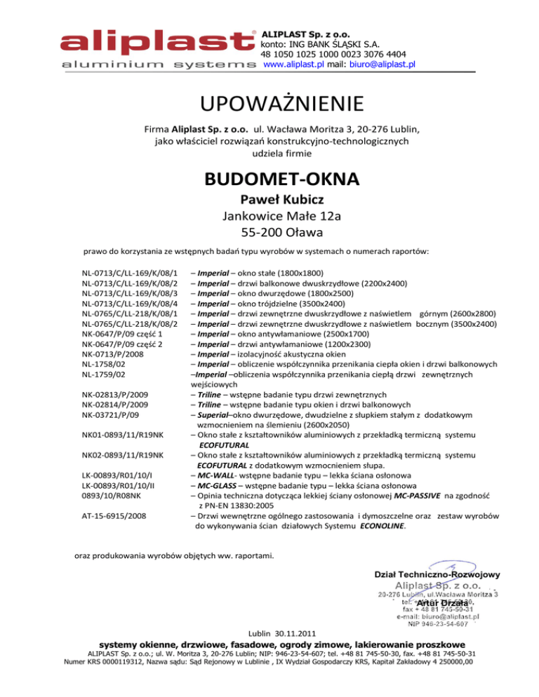 ALIPLAST Sp. z o.o. konto: ING BANK ŚLĄSKI S.A. 48 1050 1025 1000 0023 3076 4404 www.aliplast.pl mail: [email protected] UPOWAŻNIENIE Firma Aliplast Sp. z o.o. ul. Wacława Moritza 3, 20-276 Lublin, jako właściciel rozwiązań konstrukcyjno-technologicznych udziela firmie BUDOMET-OKNA Paweł Kubicz Jankowice Małe 12a 55-200 Oława prawo do korzystania ze wstępnych badań typu wyrobów w systemach o numerach raportów: NL-0713/C/LL-169/K/08/1 NL-0713/C/LL-169/K/08/2 NL-0713/C/LL-169/K/08/3 NL-0713/C/LL-169/K/08/4 NL-0765/C/LL-218/K/08/1 NL-0765/C/LL-218/K/08/2 NK-0647/P/09 część 1 NK-0647/P/09 część 2 NK-0713/P/2008 NL-1758/02 NL-1759/02 NK-02813/P/2009 NK-02814/P/2009 NK-03721/P/09 NK01-0893/11/R19NK NK02-0893/11/R19NK LK-00893/R01/10/I LK-00893/R01/10/II 0893/10/R08NK AT-15-6915/2008 – Imperial – okno stałe (1800x1800) – Imperial – drzwi balkonowe dwuskrzydłowe (2200x2400) – Imperial – okno dwurzędowe (1800x2500) – Imperial – okno trójdzielne (3500x2400) – Imperial – drzwi zewnętrzne dwuskrzydłowe z naświetlem górnym (2600x2800) – Imperial – drzwi zewnętrzne dwuskrzydłowe z naświetlem bocznym (3500x2400) – Imperial – okno antywłamaniowe (2500x1700) – Imperial – drzwi antywłamaniowe (1200x2300) – Imperial – izolacyjność akustyczna okien – Imperial – obliczenie współczynnika przenikania ciepła okien i drzwi balkonowych –Imperial –obliczenia współczynnika przenikania ciepłą drzwi zewnętrznych wejściowych – Triline – wstępne badanie typu drzwi zewnętrznych – Triline – wstępne badanie typu okien i drzwi balkonowych – Superial–okno dwurzędowe, dwudzielne z słupkiem stałym z dodatkowym wzmocnieniem na ślemieniu (2600x2050) – Okno stałe z kształtowników aluminiowych z przekładką termiczną systemu ECOFUTURAL – Okno stałe z kształtowników aluminiowych z przekładką termiczną systemu ECOFUTURAL z dodatkowym wzmocnieniem słupa. – MC-WALL- wstępne badanie typu – lekka ściana osłonowa – MC-GLASS – wstępne badanie typu – lekka ściana osłonowa – Opinia techniczna dotycząca lekkiej ściany osłonowej MC-PASSIVE na zgodność z PN-EN 13830:2005 – Drzwi wewnętrzne ogólnego zastosowania i dymoszczelne oraz zestaw wyrobów do wykonywania ścian działowych Systemu ECONOLINE. oraz produkowania wyrobów objętych ww. raportami. Dział Techniczno-Rozwojowy Artur Drzała Lublin 30.11.2011 systemy okienne, drzwiowe, fasadowe, ogrody zimowe, lakierowanie proszkowe ALIPLAST Sp. z o.o.; ul. W. Moritza 3, 20-276 Lublin; NIP: 946-23-54-607; tel. +48 81 745-50-30, fax. +48 81 745-50-31 Numer KRS 0000119312, Nazwa sądu: Sąd Rejonowy w Lublinie , IX Wydział Gospodarczy KRS, Kapitał Zakładowy 4 250000,00