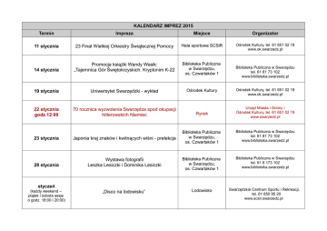 KALENDARZ IMPREZ 2015 Termin Impreza Miejsce Organizator 11 stycznia 23 Finał Wielkiej Orkiestry Świątecznej Pomocy Hala sportowa SCSiR Ośrodek Kultury, tel. 61 651 02 19 www.ok.swarzedz.pl 14 stycznia Promocja książki Wandy Wasik: „Tajemnica Gór Świętokrzyskich. Kryptonim K-22 Biblioteka Publiczna w Swarzędzu, os. Czwartaków 1 19 stycznia Uniwersytet Swarzędzki - wykład Ośrodek Kultury Ośrodek Kultury, tel. 61 651 02 19 www.ok.swarzedz.pl 22 stycznia godz.12:00 70 rocznica wyzwolenia Swarzędza spod okupacji hitlerowskich Niemiec Rynek Urząd Miasta i Gminy / Ośrodek Kultury, tel. 61 651 02 19 www.swarzedz.pl 23 stycznia Japonia kraj znaków i kwitnących wiśni - prelekcja Biblioteka Publiczna w Swarzędzu, os. Czwartaków 1 Biblioteka Publiczna w Swarzędzu tel. 61 81 73 102 www.biblioteka.swarzedz.pl 28 stycznia Wystawa fotografii Leszka Lesiczki i Dominika Lesiczki Biblioteka Publiczna w Swarzędzu, os. Czwartaków 1 Biblioteka Publiczna w Swarzędzu tel. 61 8 173 102 www.biblioteka.swarzedz.pl „Disco na lodowisku” Lodowisko Swarzędzkie Centrum Sportu i Rekreacji, tel. 61 650 95 20 www.scsir.swarzedz.pl styczeń (każdy weekend – piątek i sobota sesje o godz. 18:00 i 20:00) Biblioteka Publiczna w Swarzędzu tel. 61 81 73 102 www.biblioteka.swarzedz.pl Swarzędzkie Centrum Sportu i Rekreacji, tel. 61 650 95 20 www.scsir.swarzedz.pl Bal przebierańców na lodowisku Lodowisko 1 luty Koncert Karnawałowy Swarzędzkiej Orkiestry Dętej Hala sportowa SCSiR Ośrodek Kultury, tel. 61 651 02 19 www.ok.swarzedz.pl luty Wernisaż wystawy kronik Ośrodka Kultury Ośrodek Kultury Ośrodek Kultury, tel. 61 651 02 19 www.ok.swarzedz.pl 25 lutego Środowe Wieczory w „Pałacyku pod lipami” „Pałacyk pod lipami” Ośrodek Kultury, tel. 61 651 02 19 www.ok.swarzedz.pl 14 lutego Koncert Walentynkowy Ośrodek Kultury Ośrodek Kultury, tel. 61 651 02 19 www.ok.swarzedz.pl 14 lutego „Wodne Party” z okazji Walentynek Pływalnia „Wodny Raj” 16 lutego Uniwersytet Swarzędzki - wykład Ośrodek Kultury Ośrodek Kultury, tel. 61 651 02 19 www.ok.swarzedz.pl 16-27 lutego Ferie Zimowe Ośrodek Kultury Ośrodek Kultury, tel. 61 651 02 19 www.ok.swarzedz.pl 16-20 i 23-27 lutego Półkolonie – ferie 2015 Swarzędzkie Centrum Sportu i Rekreacji Swarzędzkie Centrum Sportu i Rekreacji, tel. 61 650 95 20 www.scsir.swarzedz.pl 31 stycznia Swarzędzkie Centrum Sportu i Rekreacji, tel. 61 650 95 20 www.scsir.swarzedz.pl 26 lutego Państwo Środka – Chiny, prelekcja luty– każdy piątek i sobota godz. 18.00 i 20.00 „Disco na lodowisku” Biblioteka Publiczna w Swarzędzu, os. Czwartaków 1 Biblioteka Publiczna w Swarzędzu tel. 61 8 173 102 www.biblioteka.swarzedz.pl Lodowisko Swarzędzkie Centrum Sportu i Rekreacji, tel. 61 650 95 20 www.scsir.swarzedz.pl 11 marca Środowe Wieczory w „Pałacyku pod lipami” „Pałacyk pod lipami” Ośrodek Kultury, tel. 61 651 02 19 www.ok.swarzedz.pl 7 marca Dzień Kobiet na Pływalni - „Wodne Party” Pływalnia „Wodny Raj” Swarzędzkie Centrum Sportu i Rekreacji, tel. 61 650 95 20 www.scsir.swarzedz.pl 8 marca 16 marca 19 marca 22 marca Amatorska liga hokeja - finał Uniwersytet Swarzędzki - wykład Obchody Dnia Patrona Swarzędza św. Józefa Kabaret Skeczów Męczących impreza biletowana Lodowisko Swarzędzkie Centrum Sportu i Rekreacji, tel. 61 650 95 20 www.scsir.swarzedz.pl Ośrodek Kultury Ośrodek Kultury, tel. 61 651 02 19 www.ok.swarzedz.pl Pomnik Św. Józefa, Ośrodek Kultury Urząd Miasta i Gminy / Ośrodek Kultury, tel. 61 651 02 19 www.swarzedz.pl Gimnazjum nr 3 impreza biletowana Ośrodek Kultury, tel. 61 651 02 19 www.ok.swarzedz.pl 11 kwietnia Amatorski turniej siatkówki Hala sportowa SCSiR Swarzędzkie Centrum Sportu i Rekreacji, tel. 61 650 95 20 www.scsir.swarzedz.pl 20 kwietnia Uniwersytet Swarzędzki - wykład Ośrodek Kultury Ośrodek Kultury, tel. 61 651 02 19 www.ok.swarzedz.pl 25 kwietnia Rajd Rowerowy – rozpoczęcie sezonu 2015 Parking przy pływalni „Wodny Raj” Swarzędzkie Centrum Sportu i Rekreacji, tel. 61 650 95 20 www.scsir.swarzedz.pl Parking przy pływalni „Wodny Raj” Swarzędzkie Centrum Sportu i Rekreacji, tel. 61 650 95 20 www.scsir.swarzedz.pl 25 kwietnia Rajd nordic walking – rozpoczęcie sezonu 2015 kwiecień Dolina Cybiny w fotografii Bogusława Kaźmierczaka - wystawa Biblioteka Publiczna w Swarzędzu, os. Czwartaków 1 Biblioteka Publiczna w Swarzędzu, os. Czwartaków 1 tel. 61 8 173 102 www.biblioteka.swarzedz.pl 11 kwietnia Swarzędzkie Spotkanie Flażoletowe Hala sportowa SCSiR Ośrodek Kultury, tel. 61 651 02 19 www.ok.swarzedz.pl kwiecień Gminny konkurs piosenki „Zostań Gwiazdą” Gimnazjum nr 3 Ośrodek Kultury, tel. 61 651 02 19 www.ok.swarzedz.pl 1 maja Przystań Wodna nad Jeziorem Swarzędzkim - rozpoczęcie sezonu 2015 Przystań nad jeziorem Swarzędzkie Centrum Sportu i Rekreacji, tel. 61 650 95 20 www.scsir.swarzedz.pl 1 - 3 maja Józefinki – święto Patrona Swarzędza Rynek Referat Promocji/Ośrodek Kultury Swarzędz tel. 61 651 02 19 www.swarzedz.pl Urząd Miasta i Gminy/Ośrodek Kultury, tel. 61 651 02 19 www.swarzedz.pl 2 maja godz. 12:00 Święto Pracy, Dzień Flagi Rzeczypospolitej Polskiej,Święto Konstytucji 3 maja – obchody Rynek 8 maja godz. 12:00 Dzień Zwycięstwa Rynek Urząd Miasta i Gminy/Ośrodek Kultury, tel. 61 651 02 19 www.swarzedz.pl Architektura Dubaju – wystawa fotografii Magdaleny Pannert-Bobrowskiej Biblioteka Publiczna w Swarzędzu, os. Czwartaków 1 Biblioteka Publiczna w Swarzędzu, os. Czwartaków 1 tel. 61 8 173 102 www.biblioteka.swarzedz.pl start: ul. Cieszkowskiego meta: stadion miejski Chevrolet Szpot/Urząd Miasta i Gminy/ Ośrodek Kultury/ Swarzędzkie Centrum Sportu i Rekreacji, tel. 61 650 95 20 www.swarzedz.pl Ośrodek Kultury Ośrodek Kultury, tel. 61 651 02 19 |www.ok.swarzedz.pl Parking przy pływalni „Wodny Raj” Referat Promocji, tel.61 651 24 07, Swarzędzkie Centrum Sportu i Rekreacji www.swarz