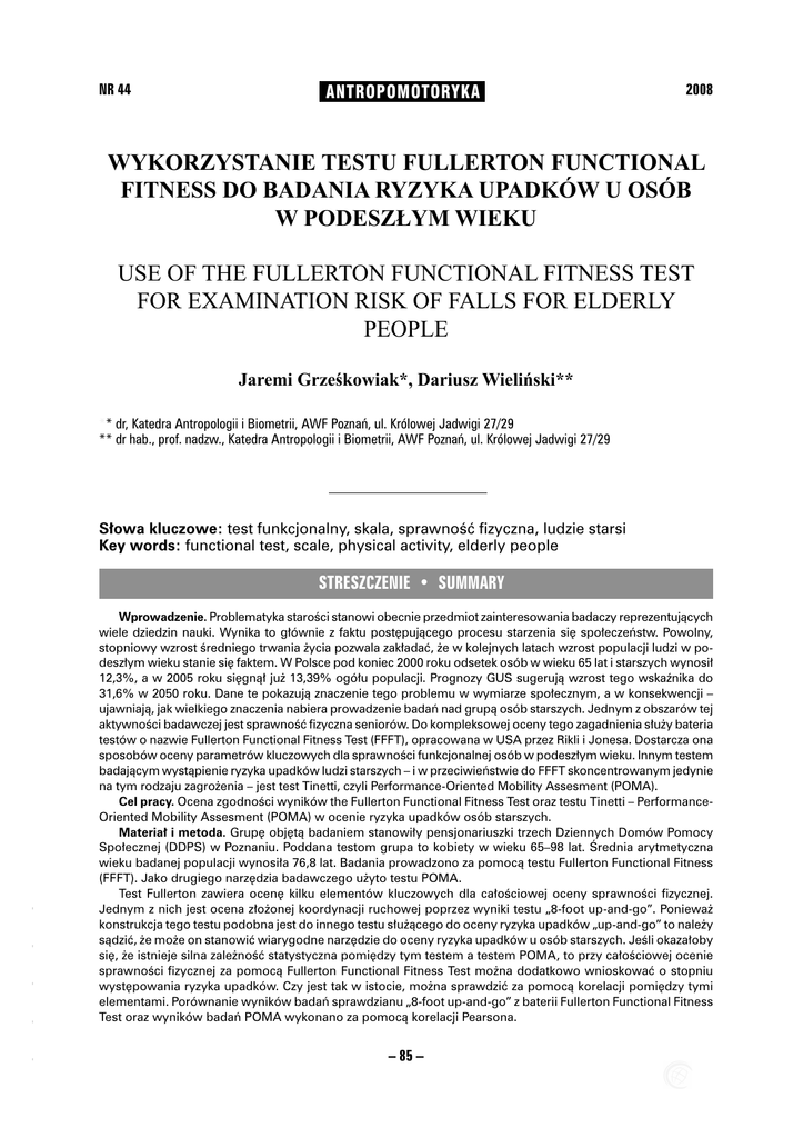NR 44 AN TRO PO MO TO RY KA 2008 WYKORZYSTANIE TESTU FULLERTON FUNCTIONAL FITNESS DO BADANIA RYZYKA UPADKÓW U OSÓB W PODESZŁYM WIEKU USE OF THE FULLERTON FUNCTIONAL FITNESS TEST FOR EXAMINATION RISK OF FALLS FOR ELDERLY PEOPLE Jaremi Grześkowiak*, Dariusz Wieliński** ** dr, Katedra Antropologii i Biometrii, AWF Poznań, ul. Królowej Jadwigi 27/29 ** dr hab., prof. nadzw., Katedra Antropologii i Biometrii, AWF Poznań, ul. Królowej Jadwigi 27/29 Słowa kluczowe: test funkcjonalny, skala, sprawność fizyczna, ludzie starsi Key words: functional test, scale, physical activity, elderly people – 85 – - - - Wprowadzenie. Problematyka starości stanowi obecnie przedmiot zainteresowania badaczy reprezentujących wiele dziedzin nauki. Wynika to głównie z faktu postępującego procesu starzenia się społeczeństw. Powolny, stopniowy wzrost średniego trwania życia pozwala zakładać, że w kolejnych latach wzrost populacji ludzi w podeszłym wieku stanie się faktem. W Polsce pod koniec 2000 roku odsetek osób w wieku 65 lat i starszych wynosił 12,3%, a w 2005 roku sięgnął już 13,39% ogółu populacji. Prognozy GUS sugerują wzrost tego wskaźnika do 31,6% w 2050 roku. Dane te pokazują znaczenie tego problemu w wymiarze społecznym, a w konsekwencji – ujawniają, jak wielkiego znaczenia nabiera prowadzenie badań nad grupą osób starszych. Jednym z obszarów tej aktywności badawczej jest sprawność fizyczna seniorów. Do kompleksowej oceny tego zagadnienia służy bateria testów o nazwie Fullerton Functional Fitness Test (FFFT), opracowana w USA przez Rikli i Jonesa. Dostarcza ona sposobów oceny parametrów kluczowych dla sprawności funkcjonalnej osób w podeszłym wieku. Innym testem badającym wystąpienie ryzyka upadków ludzi starszych – i w przeciwieństwie do FFFT skoncentrowanym jedynie na tym rodzaju zagrożenia – jest test Tinetti, czyli Performance-Oriented Mobility Assesment (POMA). Cel pracy. Ocena zgodności wyników the Fullerton Functional Fitness Test oraz testu Tinetti – PerformanceOriented Mobility Assesment (POMA) w ocenie ryzyka upadków osób starszych. Materiał i metoda. Grupę objętą badaniem stanowiły pensjonariuszki trzech Dziennych Domów Pomocy Społecznej (DDPS) w Poznaniu. Poddana testom grupa to kobiety w wieku 65–98 lat. Średnia arytmetyczna wieku badanej populacji wynosiła 76,8 lat. Badania prowadzono za pomocą testu Fullerton Functional Fitness (FFFT). Jako drugiego narzędzia badawczego użyto testu POMA. Test Fullerton zawiera ocenę kilku elementów kluczowych dla całościowej oceny sprawności fizycznej. Jednym z nich jest ocena złożonej koordynacji ruchowej poprzez wyniki testu „8-foot up-and-go”. Ponieważ konstrukcja tego testu podobna jest do innego testu służącego do oceny ryzyka upadków „up-and-go” to należy sądzić, że może on stanowić wiarygodne narzędzie do oceny ryzyka upadków u osób starszych. Jeśli okazałoby się, że istnieje silna zależność statystyczna pomiędzy tym testem a testem POMA, to przy całościowej ocenie sprawności fizycznej za pomocą Fullerton Functional Fitness Test można dodatkowo wnioskować o stopniu występowania ryzyka upadków. Czy jest tak w istocie, można sprawdzić za pomocą korelacji pomiędzy tymi elementami. Porównanie wyników badań sprawdzianu „8-foot up-and-go” z baterii Fullerton Functional Fitness Test oraz wyników badań POMA wykonano za pomocą korelacji Pearsona. - STRESZCZENIE • SUMMARY Jaremi Grześkowiak, Dariusz Wieliński Wyniki badań. Pomiędzy wynikami badanych prób (POMA i FFFT) zachodzi bardzo silna zależność statystyczna. Dla obu testów sporządzono skale pomiarowe, porównano je i skonstruowano pięciostopniową skalę ryzyka upadków dla osób badanych za pomocą testu z baterii Fullerton Functional Fitness. Wnioski. (1) Próbę „8-foot up-and-go” można wykorzystać jako wskaźnik do oceny ryzyka upadków kobiet w wieku powyżej 65 lat, bez konieczności stosowania innych testów do oceny ryzyka upadków (np. testu Tinetti). (2) Wskazane jest prowadzenie co pięć lat badań w grupach wieku dla mężczyzn i kobiet. Pozwoli to określić szczegółowo poziom ryzyka upadków dla grup wiekowych, a tym samym progresję ryzyka upadków związaną z wiekiem człowieka. Introduction. Problems of elderly people have a lot of interest from several disciplines of science due to the progress of aging society syndromes. Slow gradual increase of the average human lifespan allows presupposing that nearest future will bring increase of senior’s population. At the end of 2000 the percentage of 65-year-olds and older citizens was 12.3%; five years later (2005) it was 13.38% of the population of Poles as a whole. According to demographic prognosis of GUS this rate is going to rise up to 31.6% by the end of 2050. That information shows the importance of doing research on this field, such as checking physical efficiency of seniors. The Fullerton Functional Fitness Test, developed by Rikli and Jones, is one of the best tools for estimating a large number of aspect of senior’s physical efficiency and fitness. The other test, which may be useful only when examining the risk of fall, is Performance-Oriented Mobility Assessment (Tinetti test). The aim of the work. To examine the conformity of the Fullerton Functional Fitness Test and PerformanceOriented Mobility Assessment as the tools for estimating of the risk of fall in the group of seniors. Material and methods. The research group consists of 64 women at the age of 65–98, habitants of the DDPS in Poznań. Arithmetic mean of that group was 76,8. The participants were examined with the help of the Fullerton Functional. The second method was Tinetti test (POMA), useful to estimate risk of falling of elderly people. First method consists of several elements, which are important when estimating the aspects of comprehensive fitness. One of them, “8-foot up-and-go test”, i