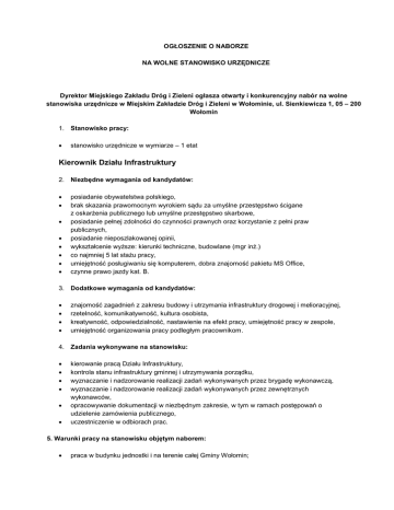 OGŁOSZENIE O NABORZE NA WOLNE STANOWISKO URZĘDNICZE Dyrektor Miejskiego Zakładu Dróg i Zieleni ogłasza otwarty i konkurencyjny nabór na wolne stanowiska urzędnicze w Miejskim Zakładzie Dróg i Zieleni w Wołominie, ul. Sienkiewicza 1, 05 – 200 Wołomin 1. Stanowisko pracy: stanowisko urzędnicze w wymiarze – 1 etat Kierownik Działu Infrastruktury 2. Niezbędne wymagania od kandydatów: posiadanie obywatelstwa polskiego, brak skazania prawomocnym wyrokiem sądu za umyślne przestępstwo ścigane z oskarżenia publicznego lub umyślne przestępstwo skarbowe, posiadanie pełnej zdolności do czynności prawnych oraz korzystanie z pełni praw publicznych, posiadanie nieposzlakowanej opinii, wykształcenie wyższe: kierunki techniczne, budowlane (mgr inż.) co najmniej 5 lat stażu pracy, umiejętność posługiwaniu się komputerem, dobra znajomość pakietu MS Office, czynne prawo jazdy kat. B. 3. Dodatkowe wymagania od kandydatów: znajomość zagadnień z zakresu budowy i utrzymania infrastruktury drogowej i melioracyjnej, rzetelność, komunikatywność, kultura osobista, kreatywność, odpowiedzialność, nastawienie na efekt pracy, umiejętność pracy w zespole, umiejętność organizowania pracy podległym pracownikom. 4. Zadania wykonywane na stanowisku: kierowanie pracą Działu Infrastruktury, kontrola stanu infrastruktury gminnej i utrzymywania porządku, wyznaczanie i nadzorowanie realizacji zadań wykonywanych przez brygadę wykonawczą, wyznaczanie i nadzorowanie realizacji zadań wykonywanych przez zewnętrznych wykonawców, opracowywanie dokumentacji w niezbędnym zakresie, w tym w ramach postępowań o udzielenie zamówienia publicznego, uczestniczenie w odbiorach prac. 5. Warunki pracy na stanowisku objętym naborem: praca w budynku jednostki i na terenie całej Gminy Wołomin; praca na stanowisku urzędniczym; praca przy komputerze. 6. Wskaźnik zatrudnienia osób niepełnosprawnych w jednostce: w miesiącu poprzedzającym upublicznienie ogłoszenia wskaźnik zatrudnienia osób niepełnosprawnych w Urzędzie, w rozumieniu przepisów ustawy o rehabilitacji zawodowej i społecznej oraz zatrudnieniu osób niepełnosprawnych, wyniósł poniżej 6%.* 7.Wymagane dokumenty życiorys zawodowy, list motywacyjny, kopie dokumentów potwierdzające wykształcenie, uprawnienia, staż pracy i doświadczenie zawodowe, ukończone kursy, szkolenia, oświadczenie kandydata o braku skazania prawomocnym wyrokiem sądu za umyślne przestępstwo ścigane z oskarżenia publicznego lub umyślne przestępstwo skarbowe. oświadczenie kandydata od kiedy może podjąć zatrudnienie, kserokopia dokumentu poświadczającego obywatelstwo polskie, oświadczenie kandydata o posiadaniu pełnej zdolności do czynności prawnych oraz o korzystaniu z pełni praw publicznych, oświadczenie kandydata o posiadaniu nieposzlakowanej opinii. Termin składania ofert: do 14 października 2014 r. Wymagane dokumenty należy składać osobiście lub pocztą na adres: Miejski Zakład Dróg i Zieleni w Wołominie, ul. Sienkiewicza 1, 05-200 Wołomin, w zamkniętej kopercie z dopiskiem: „Nabór na stanowisko Kierownik Działu Infrastruktury”. Wymagane dokumenty aplikacyjne, w tym m.in. list motywacyjny, życiorys zawodowy, powinny być własnoręcznie podpisane i opatrzone klauzulą: Wyrażam zgodę na przetwarzanie moich danych osobowych zawartych w ofercie pracy dla potrzeb niezbędnych do realizacji procesu rekrutacji zgodnie z ustawą z 29 sierpnia 1997 roku o ochronie danych osobowych (Dz.U. z 2002 r. Nr 101, poz. 926 z późn. zm.) oraz ustawy z dnia 21 listopada 2008 r. o pracownikach samorządowych (Dz.U. Nr 223, poz. 1458 z późn. zm.). Oferty, które wpłyną do Miejskiego Zakładu Dróg i Zieleni po wyżej określonym terminie lub będą niekompletne nie będą rozpatrywane. Wołomin, dnia 3 października 2014 r. * kandydat, który zamierza skorzystać z uprawnienia, o którym mowa w art. 13a ust. 2 ustawy z dnia 21 listopada 2008r. o pracownikach samorządowych, jest obowiązany do złożenia wraz z dokumentami kopii dokumentu potwierdzającego niepełnosprawność.