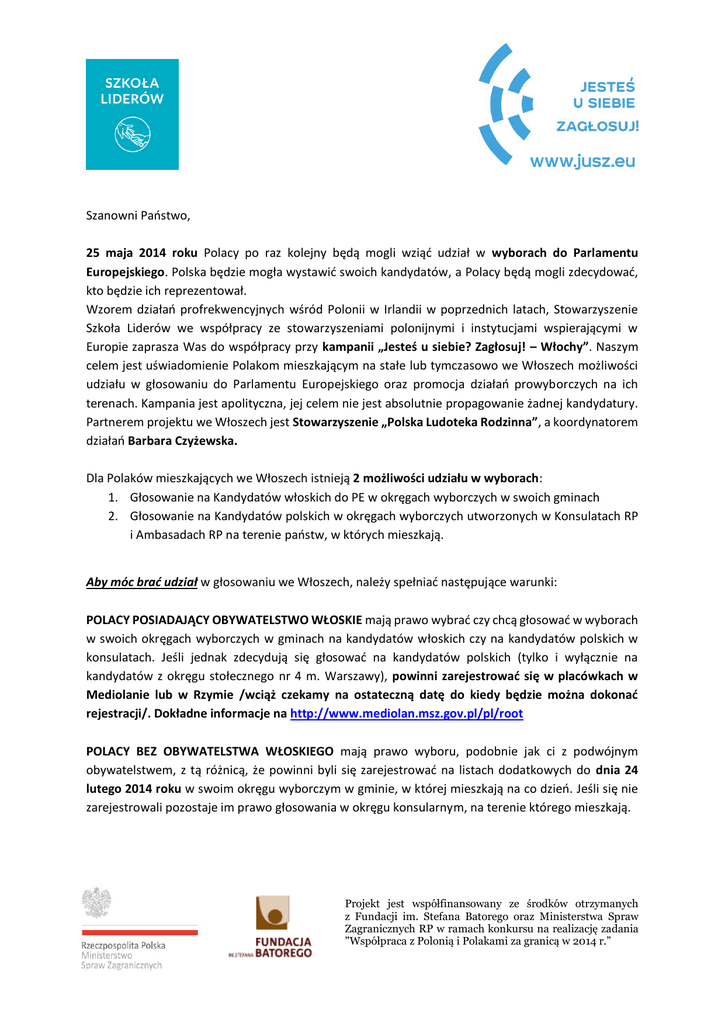 Szanowni Państwo, 25 maja 2014 roku Polacy po raz kolejny będą mogli wziąć udział w wyborach do Parlamentu Europejskiego. Polska będzie mogła wystawić swoich kandydatów, a Polacy będą mogli zdecydować, kto będzie ich reprezentował. Wzorem działań profrekwencyjnych wśród Polonii w Irlandii w poprzednich latach, Stowarzyszenie Szkoła Liderów we współpracy ze stowarzyszeniami polonijnymi i instytucjami wspierającymi w Europie zaprasza Was do współpracy przy kampanii „Jesteś u siebie? Zagłosuj! – Włochy”. Naszym celem jest uświadomienie Polakom mieszkającym na stałe lub tymczasowo we Włoszech możliwości udziału w głosowaniu do Parlamentu Europejskiego oraz promocja działań prowyborczych na ich terenach. Kampania jest apolityczna, jej celem nie jest absolutnie propagowanie żadnej kandydatury. Partnerem projektu we Włoszech jest Stowarzyszenie „Polska Ludoteka Rodzinna”, a koordynatorem działań Barbara Czyżewska. Dla Polaków mieszkających we Włoszech istnieją 2 możliwości udziału w wyborach: 1. Głosowanie na Kandydatów włoskich do PE w okręgach wyborczych w swoich gminach 2. Głosowanie na Kandydatów polskich w okręgach wyborczych utworzonych w Konsulatach RP i Ambasadach RP na terenie państw, w których mieszkają. Aby móc brać udział w głosowaniu we Włoszech, należy spełniać następujące warunki: POLACY POSIADAJĄCY OBYWATELSTWO WŁOSKIE mają prawo wybrać czy chcą głosować w wyborach w swoich okręgach wyborczych w gminach na kandydatów włoskich czy na kandydatów polskich w konsulatach. Jeśli jednak zdecydują się głosować na kandydatów polskich (tylko i wyłącznie na kandydatów z okręgu stołecznego nr 4 m. Warszawy), powinni zarejestrować się w placówkach w Mediolanie lub w Rzymie /wciąż czekamy na ostateczną datę do kiedy będzie można dokonać rejestracji/. Dokładne informacje na http://www.mediolan.msz.gov.pl/pl/root POLACY BEZ OBYWATELSTWA WŁOSKIEGO mają prawo wyboru, podobnie jak ci z podwójnym obywatelstwem, z tą różnicą, że powinni byli się zarejestrować na listach dodatkowych do dnia 24 lutego 2014 roku w swoim okręgu wyborczym w gminie, w której mieszkają na co dzień. Jeśli się nie zarejestrowali pozostaje im prawo głosowania w okręgu konsularnym, na terenie którego mieszkają. Projekt jest współfinansowany ze środków otrzymanych z Fundacji im. Stefana Batorego oraz Ministerstwa Spraw Zagranicznych RP w ramach konkursu na realizację zadania "Współpraca z Polonią i Polakami za granicą w 2014 r.” Jak głosować? Głosując w okręgach włoskich należy zgłosić się w dniu wyborów z Kartą do Głosowania w swoim okręgu wyborczym i oddać głos na kandydata z listy. Jeśli chodzi o głosowanie w polskich placówkach dyplomatycznych, należy najpierw zarejestrować się w placówce ze swojego okręgu konsularnego, a w dniu 25 maja 2014 roku zgłosić się osobiście i oddać głos na kandydata z listy warszawskiej lub zagłosować w systemie korespondencyjnym. Każdy kto ma prawo głosować, może oddać głos TYLKO W JEDNYM WYBRANYM PRZEZ SIEBIE OKRĘGU, albo włoskim albo dyplomatycznym. Parlament Europejski to o soby, które powinny reprezentować interesy społeczeństwa UE, dlatego jest ważne, by każdy obywatel oddał głos na swojego kandydata, bez względu na to gdzie mieszka. Polacy są obecni w każdym kraju UE, mają te same prawa i przywileje, jak pozostali Europejczycy, mają prawo decydować o tym, kto będzie u szczytu władzy ustawodawczej UE. Pomóżmy Polakom być świadomymi Europejczykami i wspólnie realizujmy cele kampanii Jesteś u siebie? Zagłosuj! – Włochy. Szczegółowych informacji o projekcie udziela: Barbara Czyżewska, „Polska Ludoteka Rodzinna” Kontakt telefoniczny: 377 277 6001 Kontakt e-mail: [email protected] Oficjalna strona: http://jusz.eu/it-2/ Grupa społecznościowa: https://www.facebook.com/PolacyglosujaweWloszech?fref=ts Koordynator kampanii w Europie: Aleksandra Minkiewicz /[email protected] Zachęcam wszystkich do aktywnego włączenia się w akcję i na początek, przesłania naszej informacji do członków Waszych stowarzyszeń, rodziców dzieci ze szkół czy bliższych i dalszych znajomych. Serdecznie pozdrawiam Barbara Czyżewska Koordynator Projektu we Włoszech Projekt jest współfinansowany ze środków otrzymanych z Fundacji im. Stefana Batorego oraz Ministerstwa Spraw Zagranicznych RP w ramach konkursu na realizację zadania "Współpraca z Polonią i Polakami za granicą w 2014 r.”