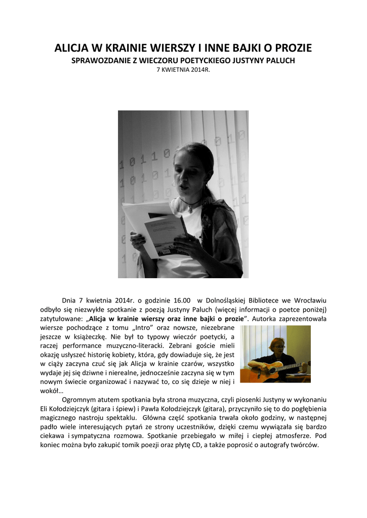 ALICJA W KRAINIE WIERSZY I INNE BAJKI O PROZIE SPRAWOZDANIE Z WIECZORU POETYCKIEGO JUSTYNY PALUCH 7 KWIETNIA 2014R. Dnia 7 kwietnia 2014r. o godzinie 16.00 w Dolnośląskiej Bibliotece we Wrocławiu odbyło się niezwykłe spotkanie z poezją Justyny Paluch (więcej informacji o poetce poniżej) zatytułowane: „Alicja w krainie wierszy oraz inne bajki o prozie”. Autorka zaprezentowała wiersze pochodzące z tomu „Intro” oraz nowsze, niezebrane jeszcze w książeczkę. Nie był to typowy wieczór poetycki, a raczej performance muzyczno-literacki. Zebrani goście mieli okazję usłyszeć historię kobiety, która, gdy dowiaduje się, że jest w ciąży zaczyna czuć się jak Alicja w krainie czarów, wszystko wydaje jej się dziwne i nierealne, jednocześnie zaczyna się w tym nowym świecie organizować i nazywać to, co się dzieje w niej i wokół… Ogromnym atutem spotkania była strona muzyczna, czyli piosenki Justyny w wykonaniu Eli Kołodziejczyk (gitara i śpiew) i Pawła Kołodziejczyk (gitara), przyczyniło się to do pogłębienia magicznego nastroju spektaklu. Główna część spotkania trwała około godziny, w następnej padło wiele interesujących pytań ze strony uczestników, dzięki czemu wywiązała się bardzo ciekawa i sympatyczna rozmowa. Spotkanie przebiegało w miłej i ciepłej atmosferze. Pod koniec można było zakupić tomik poezji oraz płytę CD, a także poprosić o autografy twórców. Justyna Paluch urodziła się 4 grudnia 1975 roku we Wrocławiu, dokładnie 100 lat po narodzinach Rainera Marii Rilkego, co zupełnie nie ma wpływu na jej pisanie. Ukończyła Bibliotekoznawstwo na Uniwersytecie Wrocławskim, a obecnie pracuje w III LO we Wrocławiu jako nauczyciel i bibliotekarz. Prowadzi tam również Grupę Poetycką HURTOWNIA. Współpracuje na polu literatury i fotografii z Salonikiem Trzech Muz, tudzież innymi instytucjami. Drukowała w „Odrze”, „Akancie” i „Cegle”, jest laureatką kilku konkursów poetyckich. Opracowanie: Tekst: Aleksandra Nalazek Zdjęcia: Rafał Sikora