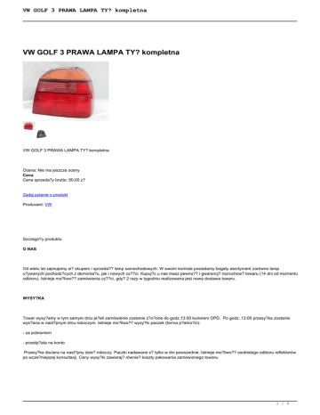 VW GOLF 3 PRAWA LAMPA TY? kompletna VW GOLF 3 PRAWA LAMPA TY? kompletna VW GOLF 3 PRAWA LAMPA TY? kompletna Ocena: Nie ma jeszcze oceny Cena Cena sprzeda?y brutto: 50,00 z? Zadaj pytanie o produkt Producent: VW Szczegó?y produktu O NAS Od wielu lat zajmujemy si? skupem i sprzeda?? lamp samochodowych. W swoim komisie posiadamy bogaty asortyment zarówno lamp u?ywanych pochodz?cych z demonta?u, jak i nowych cz??ci. Kupuj?c u nas masz pewno?? i gwarancj? rozruchow? towaru (14 dni od momentu odbioru). Istnieje mo?liwo?? zamówienia cz??ci, gdy? 2 razy w tygodniu realizowana jest nowa dostawa towaru. WYSY?KA Towar wysy?amy w tym samym dniu je?eli zamówienie zostanie z?o?one do godz.13:00 kurierem DPD. Po godz. 13:00 przesy?ka zostanie wys?ana w nast?pnym dniu roboczym. Istnieje mo?liwo?? wysy?ki paczek (forma p?atno?ci): - za pobraniem - przedp?ata na konto Przesy?ka dociera na nast?pny dzie? roboczy. Paczki nadawane s? tylko w dni powszednie. Istnieje mo?liwo?? osobistego odbioru reflektorów po wcze?niejszej konsultacji. Ceny wysy?ki zawieraj? równie? koszty pakowania zamówionego towaru. 1 / 4 VW GOLF 3 PRAWA LAMPA TY? kompletna Maj? Pa?stwo prawo zwrotu zakupionego towaru w ci?gu 14 dni (ustawowo) wraz z dowodem zakupu i formularzem odst?pienia od umowy zawartym na naszej stronie : http://lampy-samochodowe.pl/media/files/Formularz_Odstapienia_OU.pdf bez podania przyczyny, zwrócimy pieni?dze- nie zwracamy jedynie kosztów wysy?ki. Nie odbieramy przesy?ek za pobraniem. ZAKUP PRZEDMIOTU VW GOLF 3 PRAWA LAMPA TY? kompletna 1. Wybierz produkt i dodaj go do koszyka. 2. Wybierz sposób zap?aty/ odbioru, uzupe?nij dane do wysy?ki 3. Ewentualne sugestie prosz? wpisa? w polu wiadomo??. 4. Oczekuj na kuriera- sprawd? zawarto?? przesy?ki przy odbiorze (wszystkie paczki s? ubezpieczone) . STAN MAGA MODEL/ STRON OPIS ZYNO MARKA A CZ??CI WY CENA VW PRAWA TY?, KO 1E-9 50,00 PLN GOLF 3 MPLERT NA, Z W K?ADEM, FIRMY S ATURNU S PARAGON/FAKTURA Do ka?dej zakupionej cz??ci do??czamy paragon . Je?li ?ycz? Pa?stwo sobie faktur?, prosimy o informacj? wraz z danymi niezb?dnymi do jej wystawienia. KONTAKT: Wszelkie zapytania prosimy kierowa? na e-mail: [email protected] Wszystkie przedmioty s? dok?adnie opisane i skatalogowane. Je?li masz dodatkowe pytania prosimy o kontakt z naszym ekspertem pod nr tel.: 798-986-497 2 / 4 VW GOLF 3 PRAWA LAMPA TY? kompletna GODZINY OTWARCIA: Pracujemy od poniedzia?ku do soboty w godz. 8:00- 18:00. STRONA WWW: www.lampy-samochodowe.pl ZAMIENNIKI: Nie kupuj zamienników na innych aukcjach. S? to cz??ci o krótkiej ?ywotno?ci i s?abej jako?ci wykonania. Pos?u?? na zdecydowanie krótszy czas ni? cz??ci oryginalne, mimo, ?e s? nowe. Zakup na naszych aukcjach jest jednoznaczny z akceptacj? regulaminu dost?pnego na naszej stronie. DZI?KUJEMY ZA ZAINTERESOWANIE Mercedes - naprawa i przeróbka lamp LED tel: 513-531-967 / tel: 795-785-666 naprawa lamp LED - w przypadku uszkodzenia lamp LED w samochodach osobowych - producent nie przewidzia? ingerencji w lamp? , czy wymiany uszkodzonych elementów lub przepalanego LED - ASO oferuja wymian? lamp na nowe - jednak cena nowych lamp nadal powala na kolana - oferujemy napraw? i przeróbk lamp LED - przerabiamy równie? lampy z wersji USA www.motolampy.com ?#?naprawa_lamp? ?#?lampy_samochodowe? ?#?lampy_led? ?#?naprawa_led??#?przeróbka_usa? ?#?lampy_usa? Wi?kszo?? wspó?czesnych samochodów osobowych wyposa?onych jest w lampy zbudowane w oparciu o LED. Takie lampy nie posiadaj? zwyk?ych ?arówek . Minusem tego rozwi?zania jest brak mo?liwo?ci w?asnor?cznej szybkiej wymiany uszkodzonego czy przepalonego elementu. Autoryzowane serwisy nie widza innego wyj?cia jak wymian? lampy na now? , jednak cena nowych lamp powala na kolana. Nasza firma oferuje napraw? lamp LED. Naprawiamy lampy we wszystkich modelach Mercedes , Audi , BMW - inne po uzgodnieniu Przerabiamy równie? lampy z wersji USA na europ? Nie musisz wymienia? lamp na nowe - ka?d? naprawimy 3 / 4 VW GOLF 3 PRAWA LAMPA TY? kompletna naprawa lamp regeneracja lamp lampy samochodowe autolampy lampy led, przeróbka lamp naprawa lamp led polerowanie reflektorów przeróbka lamp usa, lampy mercedes , naprawa reflektorów polerowanie lamp lampy ty? reflektor audi tanie lampy lampy u?ywane tuning lamp powrót Czytaj równie?: BMW e39 - opis , porady i ciekawostki Mercedes GL przeróbka lamp z USA Regeneracja reflektorów - Skoda Roomster Dlaczego regenerowa? lampy ? eXfan - lampy samochodowe - naprawa lamp 4 / 4 Powered by TCPDF (www.tcpdf.org)