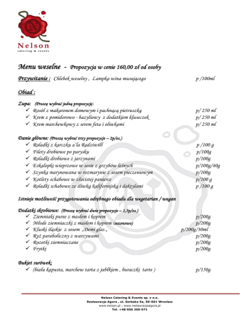 Menu weselne - Propozycja w cenie 160,00 zł od osoby Przywitanie : Chlebek weselny , Lampka wina musującego p /100ml Obiad : Zupa: (Proszę wybrać jedną propozycję) Rosół z makaronem domowym i pachnącą pietruszką Krem z pomidorowo - bazyliowy z dodatkiem kluseczek Krem marchewkowy z serem feta i oliwkami Danie główne: (Proszę wybrać trzy propozycje – 2p/os.) Roladki z karczku a’la Radziwiłł Filety drobiowe po parysku Roladki drobiowe z jarzynami Eskalopki wieprzowe w sosie z grzybów leśnych Szynka marynowana w rozmarynie z sosem pieczeniowym Kotlety schabowe w złocistej panierce Roladki schabowe ze śliwką kalifornijską i daktylami p/ 250 ml p/ 250 ml p/ 250 ml p /100 g p/100g p/100g p/100g/40g p/100g p/100 g p /100 g Istnieje możliwość przygotowania odrębnego obiadu dla wegetarian / wegan Dodatki skrobiowe: (Proszę wybrać dwie propozycje – 1,5p/os.) Ziemniaki puree z masłem i koprem Młode ziemniaczki z masłem i koprem (sezonowo) Kluski śląskie z sosem „Demi glas „ Ryż paraboliczny z warzywami Rozetki ziemniaczane Frytki Bukiet surówek: (biała kapusta, marchew tarta z jabłkiem , buraczki tarte ) Nelson Catering & Events sp. z o.o. Restauracja Agora , ul. Serbska 5a, 50-001 Wrocław www.nelson.pl ; www.restauracjaagora.pl Tel. +48 606 200 071 p/200g p/200g p/200g/30ml p/200g p/200g p/200g p/150g Przekąski zimne podane do stołu po obiedzie: Mięsa i wędliny 120g/os : Rolada z karczku z podgrzybkami Schab pieczony ze śliwką kalifornijską i daktylami Rolada drobiowa z borówkami żurawin Rolada z boczku, szynka wiejska, kabanosy , Pasztet pieczony obsadzany borówkami żurawin Dodatki: Pieczywo mieszane, masełko smakowe, Sosy do mięs (chrzan, ćwikła, żurawina) Zestaw przekąskowy (marynaty, pieczarki, papryka, ogórek) Delikatesy stołu Tymbaliki drobiowe z jullienne marchewkowym i groszkiem cukrowym Rulony szynkowe z musem chrzanowym / pieczarkowym Ryba w rumianych jarzynach z pomidorem Rolmopsy śledziowe z pikantnej marynaty ½ Jajka faszerowanego pieczarkami / po carsku z kawiorem Roladki z łososia wędzonego z ziołowym fromage i nuta Bazyli Sałatka z grillowanym kurczakiem, ananasem i orzechami Sałatka z winogronem, serem pleśniowym i ziołowymi grzankami Sałatka jarzynowa p/25g p/25g p/25g p/25g p/25g p/70g p/40p/40g p/60g/40g p/60g p/30g p/30g p/100g p/100g p/100g Przekąski gorące podawane w godzinach nocnych (Proszę wybrać dwie propozycje – 2p/os.) Barszcz czysty z pasztecikiem Żurek gotowany na wędzonce ze świeżo tartym chrzanem Flaczki drobiowe z grzankami czosnkowymi i świeżą pietruszką Rolady wieprzowe nadziewane kapustą i grzybami Ragout z szynki marynowanej w rozmarynie z championami Uda trybowane z marynaty sojowej w sosie słodko kwaśnym Krojone piersi indyka z championami w sosie beszamelowym Szaszłyki z szynki z cebulą i słoniną Bigos na trzech rodzajach mięs, zakrapiany czerwonym winem Pierogi ruskie według sprawdzonych receptur Nelson Catering & Events sp. z o.o. Restauracja Agora , ul. Serbska 5a, 50-001 Wrocław www.nelson.pl ; www.restauracjaagora.pl Tel. +48 606 200 071 p/225ml/szt. p/225ml p/225ml p/120g p/200g p/200g p/200g p/150g p/250g p/200g Deser: Stół z deserami - od zleceniodawcy Owoce z fantazją podane - 100 g / os Open bar z napojami: Kawa z dodatkami Paleta herbat smakowych z dodatkami Soki owocowe Woda mineralna (n. gaz ) Napoje gazowane z oferty Coca – Coli Lód w kostkach Cooler’y na alkohol Biały alkohol bez limitu; bez limitu; od 100 os w cenie menu bez limitu bez limitu rozliczne wg. zużycia rozliczane wg. zużycia od zleceniodawcy * Zapewniamy wszelkie szkło potrzebne do serwowania alkoholi dostarczonych przez zleceniodawcę *( Alkohol od zleceniodawcy powinien być dostarczony min. na 10 h przed rozpoczęciem serwowania, w celu odpowiedniego schłodzenia oraz przygotowania szkła i innych niezbędnych akcesoriów . *Nie doliczamy korkowego Cena zawiera: Szatnię z obsługą (1 os.) Obsługę techniczną i sprzątającą (2 os.) Miejsca siedzące w tradycyjnym ustawieniu, lub przy stołach okrągłych Osobę nadzorującą przebieg realizacji Nelson Catering & Events sp. z o.o. Restauracja Agora , ul. Serbska 5a, 50-001 Wrocław www.nelson.pl ; www.restauracjaagora.pl Tel. +48 606 200 071 Obsługę kelnerską (1 os./20 os.) personel w strojach firmowych Sprzątanie sali Delikatna dekoracja kwiatowa na stołach Stojak na kwiatki Świeczniki Serwetki fizelinowe Bieliznę stołową * ilość porcji, ustanawiana dla każdego zlecenia indywidualnie Nelson Catering & Events sp. z o.o. Restauracja Agora , ul. Serbska 5a, 50-001 Wrocław www.nelson.pl ; www.restauracjaagora.pl Tel. +48 606 200 071