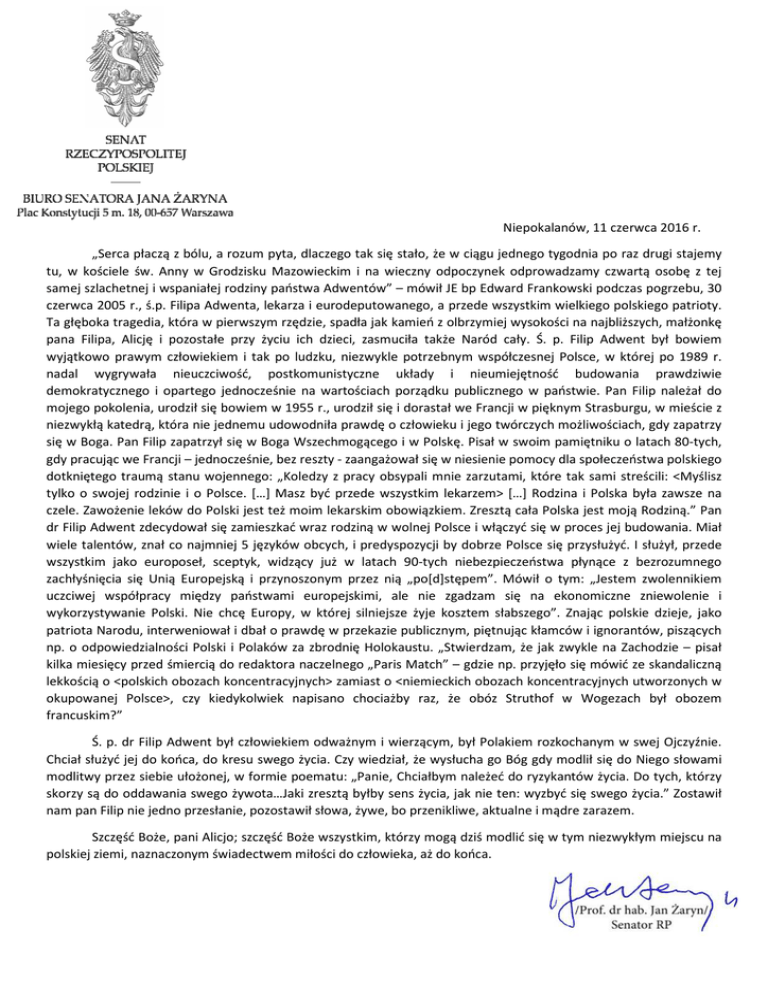 Niepokalanów, 11 czerwca 2016 r. „Serca płaczą z bólu, a rozum pyta, dlaczego tak się stało, że w ciągu jednego tygodnia po raz drugi stajemy tu, w kościele św. Anny w Grodzisku Mazowieckim i na wieczny odpoczynek odprowadzamy czwartą osobę z tej samej szlachetnej i wspaniałej rodziny państwa pań Adwentów” – mówił JE bp Edward Frankowski podczas pogrzebu, 30 czerwca 2005 r., ś.p. Filipa Adwenta, lekarza i eurodeputowanego, a przede wszystkim wielkiego polskiego patrioty. Ta głęboka tragedia, która w pierwszym rzędzie, spadła jak kamień z olbrzymiej olbrzymiej wysokości na najbliższych, małżonkę pana Filipa, Alicję i pozostałe przy życiu ich dzieci, zasmuciła także Naród cały. Ś. p. Filip Adwent był bowiem wyjątkowo prawym człowiekiem i tak po ludzku, niezwykle potrzebnym współczesnej Polsce, w której po 1989 1 r. nadal wygrywała nieuczciwość, postkomunistyczne układy i nieumiejętność budowania prawdziwie demokratycznego i opartego jednocześnie na wartościach porządku publicznego w państwie. Pan Filip należał do mojego pokolenia, urodził się bowiem w 1955 r., urodził się i dorastał we Francji w pięknym Strasburgu, w mieście z niezwykłą katedrą, która nie jednemu udowodniła prawdę o człowieku i jego twórczych możliwościach, gdy zapatrzy się w Boga. Pan Filip zapatrzył się w Boga Wszechmogącego i w Polskę. Pisał w swoim pamiętniku o latach 80-tych, 80 gdy pracując we Francji – jednocześnie, bez reszty - zaangażował się w niesienie pomocy dla społeczeństwa polskiego dotkniętego traumą stanu wojennego: „Koledzy z pracy obsypali mnie zarzutami, które tak sami streścili: streścili <Myślisz tylko o swojej rodzinie i o Polsce. […] Masz być przede wszystkim lekarzem> […] Rodzina i Polska była zawsze na czele. Zawożenie leków do Polski jest też moim lekarskim obowiązkiem. Zresztą cała Polska jest moją Rodziną.” Pan dr Filip Adwent zdecydował cydował się zamieszkać wraz rodziną w wolnej Polsce i włączyć się w proces jej budowania. Miał wiele talentów, znał co najmniej 5 języków obcych, i predyspozycji by dobrze Polsce się przysłużyć. I służył, przede wszystkim jako europoseł, sceptyk, widzący już j w latach 90-tych tych niebezpieczeństwa płynące z bezrozumnego zachłyśnięcia się Unią Europejską i przynoszonym przez nią „po[d]stępem”.. Mówił o tym: „Jestem zwolennikiem uczciwej współpracy między państwami europejskimi, ale nie zgadzam się na ekonomiczne zniewolenie z i wykorzystywanie Polski. Nie chcę Europy, w której silniejsze żyje kosztem słabszego”. Znając polskie dzieje, jako patriota Narodu, interweniował i dbał o prawdę w przekazie publicznym, piętnując kłamców i ignorantów, piszących np. o odpowiedzialności alności Polski i Polaków za zbrodnię Holokaustu. „Stwierdzam, że jak zwykle na Zachodzie – pisał kilka miesięcy przed śmiercią do redaktora naczelnego „Paris Match” – gdzie np. przyjęło się mówić ze skandaliczną lekkością o <polskich obozach koncentracyjnych> koncentracyjnych> zamiast o <niemieckich obozach koncentracyjnych utworzonych w okupowanej Polsce>, czy kiedykolwiek napisano chociażby raz, że obóz Struthof w Wogezach był obozem francuskim?” Ś. p. dr Filip Adwent był człowiekiem odważnym i wierzącym, był Polakiem rozkochanym rozk w swej Ojczyźnie. Chciał służyć jej do końca, do kresu swego życia. Czy wiedział, że wysłucha go Bóg gdy modlił się do Niego słowami modlitwy przez siebie ułożonej, ożonej, w formie poematu: „Panie, Chciałbym należeć do ryzykantów życia. Do tych, którzy skorzy orzy są do oddawania swego żywota…Jaki zresztą byłby sens życia, jak nie ten: wyzbyć się swego życia.” Zostawił nam pan Filip nie jedno przesłanie, pozostawił słowa, żywe, bo przenikliwe, aktualne i mądre zarazem. Szczęść Boże, pani Alicjo; szczęść Boże wszystkim, wszystkim, którzy mogą dziś modlić się w tym niezwykłym miejscu na polskiej ziemi, naznaczonym świadectwem miłości do człowieka, aż do końca.