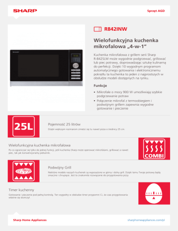Sprzęt AGD R842INW Wielofunkcyjna kuchenka mikrofalowa „4-w-1” Kuchenka mikrofalowa z grillem serii Sharp R-842SLM może wygodnie podgrzewać, grillować lub piec potrawy, doprowadzając sztukę kulinarną do perfekcji. Dzięki 10 wygodnym programom automatycznego gotowania i elektronicznemu pokrętłu ta kuchenka to jeden z najprostszych w obsłudze modeli dostępnych na rynku. Funkcje Mikrofale o mocy 900 W umożliwiają szybkie podgrzewanie potraw Połączenie mikrofal z termoobiegiem i podwójnym grillem zapewnia wygodne gotowanie i pieczenie Pojemność 25 litrów Dzięki większym rozmiarom zmieści się tu nawet pizza o średnicy 25 cm. Wielofunkcyjna kuchenka mikrofalowa Po co ograniczać się tylko do jednej funkcji, jeśli kuchenka Sharp może operować mikrofalami, grillować a nawet piec, tak jak konwencjonalny piekarnik. Podwójny Grill Niektóre modele naszych kuchenek są wyposażone w górny i dolny grill. Dzięki temu Twoje potrawy będą smaczne i chrupiące. Jest to znakomite rozwiązanie do przygotowania pizzy Timer kuchenny Gotowanie i pieczenie pod pełną kontrolą. Ten wygodny w obsłudze timer przypomni Ci, że czas przygotowania właśnie się skończył. Sharp Home Appliances sharphomeappliances.com/pl Sprzęt AGD Kluczowe cechy Automatyczne programy pieczenia ciasta Tak Zegar Tak Przycisk "Info" Nie Przycisk "Język" Nie Funkcja plus 1 minuta / +30s Yes / No Kolor kuchenki Inox Automatyczne programy gotowania i rozmrażania 10 Korekcja ustawień (WIĘCEJ/MNIEJ) Nie Materiał, z którego wykonane jest wnętrze kuchenki Stainless Steel Tryb pracy połączonej: grill (kwarcowy i w podczerwieni) Tak Automatyczne programy przygotowania pizzy Tak Tryb pracy połączonej: termoobieg + mikrofale Yes Funkcja podgrzewania Tak Timer (maks. podawanie minut i sekund) 95/00 Średnica talerza obrotowego w cm / materiał 30.1 / Metal Pojemność komory (w litrach) 25 Zakres regulacji temperatury termoobiegu (°C) 140-230 Tryb pracy połączonej: grill (kwarcowy lub w podczerwieni) + mikrofale Tak Tryb oszczędzania energii Tak Menu FUN lub automatyczne programy do zakąsek – Sharp Home Appliances sharphomeappliances.com/pl Sprzęt AGD Moc wyjściowa Moc wyjściowa (W) 900 Poziomy mocy mikrofal 5 Termoobieg (W) 2300 Grill kwarcowy (W) 1200 Grill w podczerwieni (W) Top: 1100 Bottom: 500 Waga (kg) 15.8 kg Mocy, zużycia i napięcia Bezpiecznik źródła zasilania/wyłącznik obwodu (A) 16 Wymiary i waga Wymiary wewnętrzne (szer.) x (wys.) x (gł.) mm 330 x 208 x 368 Wymiary zewnętrzne (szer.) x (wys.) x (gł.) mm 513 x 306 x 430 Wyposażenie Wysoki ruszt Nie Kwadratowa półka Nie Niski ruszt Tak Kwadratowy pojemnik Nie European article number Kod EAN Sharp Home Appliances Powered by TCPDF (www.tcpdf.org) 4974019762340 sharphomeappliances.com/pl