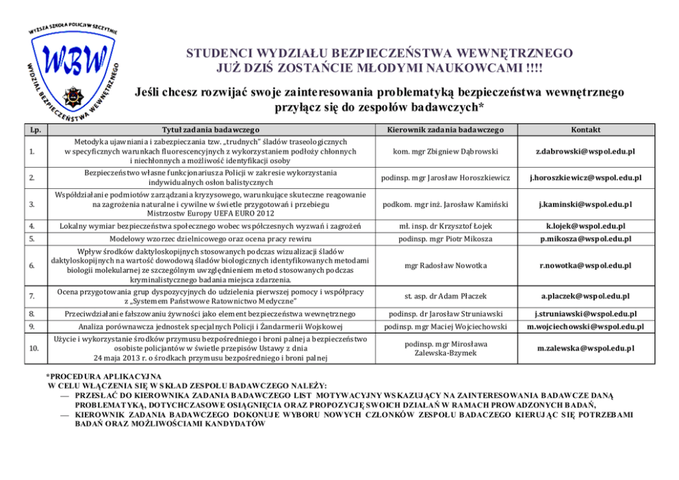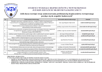 STUDENCI WYDZIAŁU BEZP IECZEŃSTWA WEWNĘTRZNEGO JUŻ DZIŚ ZOSTAŃCIE MŁODYMI NAUKOWCAMI !!!! Jeśli chcesz rozwijać swoje zainteresowania problematyką bezpieczeństwa wewnętrznego przyłącz się do zespołów badawczych* Lp. Tytuł zadania badawczego Kierownik zadania badawczego Kontakt 1. Metodyka ujawniani a i zabezpieczania tzw. „trudnych” śladów traseologicznych w specyficznych warunkach fluorescencyjnych z wykorzystaniem podłoży chłonnych i niechłonnych a możliwość identyfikacji osoby kom. mgr Zbi gniew Dąbrowski [email protected] 2. Bezpieczeńs two własne funkcjonariusza Policji w zakresie wykorzystania indywidualnych osłon balistycznych podinsp. mgr Jarosław Horoszkiewicz [email protected] 3. Współdziałani e podmiotów zarządzani a kryzysowego, warunkujące skuteczne reagowanie na zagrożenia naturalne i cywilne w świ etle przygotowań i przebiegu Mistrzostw Europy UEFA EURO 2012 podkom. mgr inż. Jarosław Kamiński [email protected] 4. Lokalny wymiar bezpieczeństwa społecznego wobec ws półczesnych wyzwań i zagrożeń mł. insp. dr Krzysztof Łojek [email protected] 5. Modelowy wzorzec dzi elnicowego oraz ocena pracy rewiru podinsp. mgr Piotr Mikosza [email protected] 6. Wpływ środków daktyloskopijnych stosowanych podczas wizualizacji śladów daktyloskopijnych na wartość dowodową śladów biologicznych identyfikowanych metodami biologii molekularnej ze szczególnym uwzględnieniem metod stosowanych podczas kryminalistycznego badania miejsca zdarzenia. mgr Radosław Nowotka [email protected] 7. Ocena przygotowania grup dyspozycyjnych do udzielenia pierwszej pomocy i współpracy z „Systemem Państwowe Ratownictwo M edyczne” st. asp. dr Adam Płaczek [email protected] 8. Przeciwdziałani e fałszowaniu żywności jako element bezpieczeństwa wewnętrznego podinsp. dr Jarosław Struniawski [email protected] 9. Analiza porównawcza jednostek specjal nych Policji i Żandarmerii Wojskowej podinsp. mgr Maci ej Wojciechowski [email protected] 10. Użycie i wykorzystanie środków przymusu bezpośredniego i broni palnej a bezpi eczeńs two osobiste policjantów w świetle przepisów Ustawy z dnia 24 maja 2013 r. o środkach przymusu bezpośredniego i broni palnej podinsp. mgr Mirosława Zalewska-Bzymek [email protected] *PROCED URA APLIKACYJ NA W CELU WŁĄCZENIA SIĘ W S KŁAD ZESPOŁ U BADAWCZEGO NALEŻY: PRZESŁ AĆ DO KIEROWNIKA ZADANIA B ADAWCZEGO LIST MOTYWACYJNY WS KAZUJ ĄCY NA ZAINTERESOWANIA B ADAWCZE DANĄ PROB LEMAT YKĄ, DOTYCHCZASOWE OSIĄGNIĘCIA ORAZ PROPOZYCJ Ę SWOICH DZIAŁAŃ W RAMACH PROWADZONYCH B ADAŃ, KIEROWNIK ZADANIA B ADAWCZEGO DOKONUJ E WYB ORU NOWYCH CZŁONKÓW ZESPOŁ U B ADACZEGO KIERUJ ĄC S IĘ POTRZEB AMI BADAŃ ORAZ MOŻLIWOŚCIAMI KANDYDATÓW