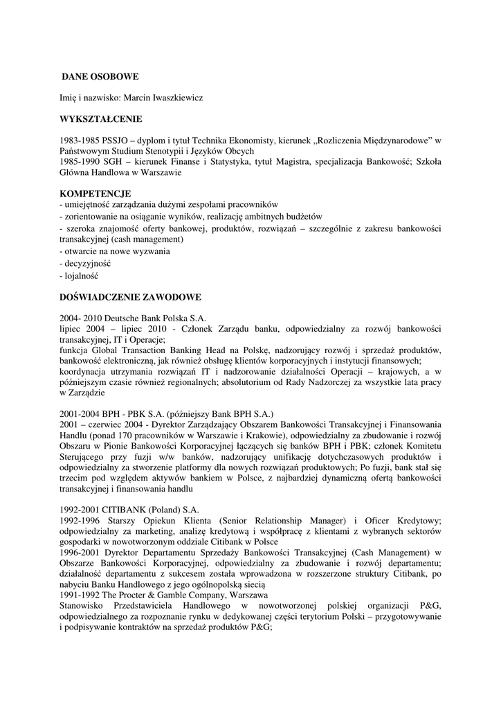 DANE OSOBOWE Imię i nazwisko: Marcin Iwaszkiewicz WYKSZTAŁCENIE 1983-1985 PSSJO – dyplom i tytuł Technika Ekonomisty, kierunek „Rozliczenia Międzynarodowe” w Państwowym Studium Stenotypii i Języków Obcych 1985-1990 SGH – kierunek Finanse i Statystyka, tytuł Magistra, specjalizacja Bankowość; Szkoła Główna Handlowa w Warszawie KOMPETENCJE - umiejętność zarządzania dużymi zespołami pracowników - zorientowanie na osiąganie wyników, realizację ambitnych budżetów - szeroka znajomość oferty bankowej, produktów, rozwiązań – szczególnie z zakresu bankowości transakcyjnej (cash management) - otwarcie na nowe wyzwania - decyzyjność - lojalność DOŚWIADCZENIE ZAWODOWE 2004- 2010 Deutsche Bank Polska S.A. lipiec 2004 – lipiec 2010 - Członek Zarządu banku, odpowiedzialny za rozwój bankowości transakcyjnej, IT i Operacje; funkcja Global Transaction Banking Head na Polskę, nadzorujący rozwój i sprzedaż produktów, bankowość elektroniczną, jak również obsługę klientów korporacyjnych i instytucji finansowych; koordynacja utrzymania rozwiązań IT i nadzorowanie działalności Operacji – krajowych, a w późniejszym czasie również regionalnych; absolutorium od Rady Nadzorczej za wszystkie lata pracy w Zarządzie 2001-2004 BPH - PBK S.A. (późniejszy Bank BPH S.A.) 2001 – czerwiec 2004 - Dyrektor Zarządzający Obszarem Bankowości Transakcyjnej i Finansowania Handlu (ponad 170 pracowników w Warszawie i Krakowie), odpowiedzialny za zbudowanie i rozwój Obszaru w Pionie Bankowości Korporacyjnej łączących się banków BPH i PBK; członek Komitetu Sterującego przy fuzji w/w banków, nadzorujący unifikację dotychczasowych produktów i odpowiedzialny za stworzenie platformy dla nowych rozwiązań produktowych; Po fuzji, bank stał się trzecim pod względem aktywów bankiem w Polsce, z najbardziej dynamiczną ofertą bankowości transakcyjnej i finansowania handlu 1992-2001 CITIBANK (Poland) S.A. 1992-1996 Starszy Opiekun Klienta (Senior Relationship Manager) i Oficer Kredytowy; odpowiedzialny za marketing, analizę kredytową i współpracę z klientami z wybranych sektorów gospodarki w nowotworzonym oddziale Citibank w Polsce 1996-2001 Dyrektor Departamentu Sprzedaży Bankowości Transakcyjnej (Cash Management) w Obszarze Bankowości Korporacyjnej, odpowiedzialny za zbudowanie i rozwój departamentu; działalność departamentu z sukcesem została wprowadzona w rozszerzone struktury Citibank, po nabyciu Banku Handlowego z jego ogólnopolską siecią 1991-1992 The Procter & Gamble Company, Warszawa Stanowisko Przedstawiciela Handlowego w nowotworzonej polskiej organizacji P&G, odpowiedzialnego za rozpoznanie rynku w dedykowanej części terytorium Polski – przygotowywanie i podpisywanie kontraktów na sprzedaż produktów P&G; Faktyczne wprowadzenie produktów P&G do polskiego handlu, z zachowaniem pełnej obecności w handlu hurtowym. ODZNACZENIA 2010 Odznaka Honorowa Związku Banków Polskich za osobisty wkład w rozwój sektora bankowego w Polsce ZAINTERESOWANIA - tenis ziemny (były zawodnik drużyny pierwszoligowej; instruktor) - narciarstwo alpejskie (były zawodnik Warszawskiego Klubu Narciarskiego WKN)
