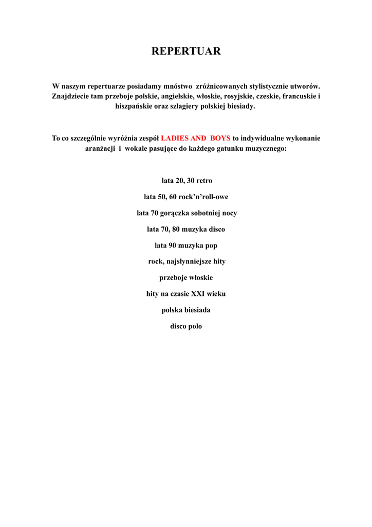 REPERTUAR W naszym repertuarze posiadamy mnóstwo zróżnicowanych stylistycznie utworów. Znajdziecie tam przeboje polskie, angielskie, włoskie, rosyjskie, czeskie, francuskie i hiszpańskie oraz szlagiery polskiej biesiady. To co szczególnie wyróżnia zespół LADIES AND BOYS to indywidualne wykonanie aranżacji i wokale pasujące do każdego gatunku muzycznego: lata 20, 30 retro lata 50, 60 rock’n’roll-owe lata 70 gorączka sobotniej nocy lata 70, 80 muzyka disco lata 90 muzyka pop rock, najsłynniejsze hity przeboje włoskie hity na czasie XXI wieku polska biesiada disco polo