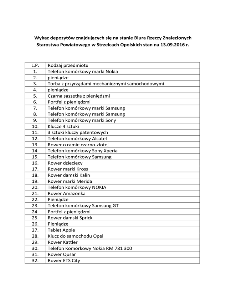 Wykaz depozytów znajdujących się na stanie Biura Rzeczy Znalezionych Starostwa Powiatowego w Strzelcach Opolskich stan na 13.09.2016 r. L.P. 1. 2. 3. 4. 5. 6. 7. 8. 9. 10. 11. 12. 13. 14. 15. 16. 17. 18. 19. 20. 21. 22. 23. 24. 25. 26. 27. 28. 29. 30. 31. 32. Rodzaj przedmiotu Telefon komórkowy marki Nokia pieniądze Torba z przyrządami mechanicznymi samochodowymi pieniądze Czarna saszetka z pieniędzmi Portfel z pieniędzmi Telefon komórkowy marki Samsung Telefon komórkowy marki Samsung Telefon komórkowy marki Sony Klucze 4 sztuki 3 sztuki kluczy patentowych Telefon komórkowy Alcatel Rower o ramie czarno-złotej Telefon komórkowy Sony Xperia Telefon komórkowy Samsung Rower dziecięcy Rower marki Kross Rower damski Kalin Rower marki Merida Telefon komórkowy NOKIA Rower Amazonka Pieniądze Telefon komórkowy Samsung GT Portfel z pieniędzmi Rower damski Sprick Pieniądze Tablet Apple Klucz do samochodu Opel Rower Kattler Telefon Komórkowy Nokia RM 781 300 Rower Qusar Rower ETS City 33. 34. 35. 36. 37. Telefon Komórkowy Nokia G2-05 Portfel czarny z pieniędzmi Wiertarka Pegasus Telefon Komórkowy marki Apple Telefon Komórkowy Samsung GT i 9506 Kontakt w/s odbioru rzeczy przez osoby uprawnione pod numerem telefonu 77 4401759 w godzinach 8.00-16.00 oraz w pokoju 312 Starostwa.