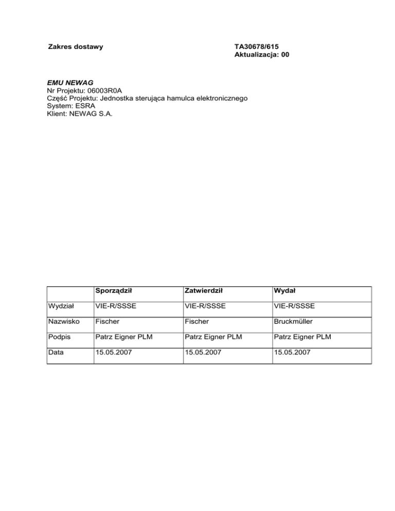 Zakres dostawy TA30678/615 Aktualizacja: 00 EMU NEWAG Nr Projektu: 06003R0A Część Projektu: Jednostka sterująca hamulca elektronicznego System: ESRA Klient: NEWAG S.A. Sporządził Zatwierdził Wydał Wydział VIE-R/SSSE VIE-R/SSSE VIE-R/SSSE Nazwisko Fischer Fischer Bruckmüller Podpis Patrz Eigner PLM Patrz Eigner PLM Patrz Eigner PLM Data 15.05.2007 15.05.2007 15.05.2007 Zakres dostawy / Jednostka sterująca hamulca elektronicznego Projekt: EMU NEWAG WYKAZ WPROWADZONYCH POPRAWEK Pop Data Nazwisko Par. Opis zmiany 1 15.05.2007 Fischer Wszystkie 1 wersja Nr Dok.: TA30678/615 Aktualizacja: 00 Strona 2/17 SPIS TREŚCI 1 Przeznaczenie 1.1 Ogólna charakterystyka 1.2 Cele 2 Dokumentacja odniesiona 5 5 5 6 3 3.1 4 4.1 4.2 Definicje Skróty Konfiguracja zespołu pociągowego Hamulec bezpośredni Hamulec pośredni 6 6 6 7 7 4.3 5 Hamulec torowy Wyposażenie sprzętowe jednostki EBCU 7 7 6 7 Łącznik sprzęgłowy Sygnały interfejsowe EBCU 7 8 7.1 Wejścia 8 7.1.1 7.1.2 7.1.3 7.2 7.2.1 7.2.2 7.2.3 8 8.1 8.2 8.3 8.4 9 Układowe wejścia binarne Układowe wejścia analogowe Sygnały wejściowe z TMS Wyprowadzenia Wyjścia binarne Wyjścia mocy Sygnały wyjściowe do TMS Tryby pracy hamulca Hamulec główny Hamulec zatrzymujący i dociskowy Hamulec bezpieczeństwa Hamulec postojowy Wypożyczenie (hamulca głównego) 8 9 10 10 10 11 11 11 11 11 12 12 12 10 Sygnał masy obciążenia 12 11 Ograniczenie szarpnięcia hamulca głównego 13 12 Diagnostyka 13 13 Kontrola poślizgu koła 13 13.1 13.2 14 Funkcja Próba antypoślizgowa Kontrola poślizgu 13 13 13 15 Przyłącze serwisowe ST03 13 16 17 Dokumentacja Wskazówki dotyczące zasad projektowania bezpieczników 14 15 17.1 17.2 17.3 Ogólna charakterystyka EBCU Moduł sprężarki II60770 15 15 16 17.4 17.5 17.6 17.7 17.8 Moduł sprężarki 8.010.1.321.0248 Hamulec magnetyczny torowy Zawory odcinające Czujniki ciśnienia Regulatory ciśnienia 16 16 16 16 16 18 Normy 17 1 Przeznaczenie 1.1 Ogólna charakterystyka Niniejsza dokumentacja zawiera opis systemu i działania podzespołów oraz funkcji układu sterowania hamulca elektronicznego przewidzianego dla jednostki EMU NEWAG 1.2 Cel Dokumentacja opisuje wymagania funkcjonalne i eksploatacyjne układu sterowania EMU NEWAG. Niniejsza dokumentacja chroniona jest prawem autorskim, konstrukcja każdego elementu opisanego w dokumentacji jest chroniona prawami do wzoru, a informacje zawarte w dokumentacji mają charakter poufny. Wszelkie kopiowanie dokumentacji, powielanie wzorów przedstawionych w dokumentacji oraz wykorzystywanie i ujawnianie informacji w niej zawartych jest zabronione bez wcześniejszego pisemnego pozwolenia ze strony Grupy Knorr-Bremse 2 Dokumentacja odniesiona Nr Nr Dok. Wydanie ident. (Indeks) dok. Dokumentacja systemu Tytuł /1/ TA30678/13A Schemat pneumatyczny - wagon doczepny /2/ TA30678/13B Schemat pneumatyczny - wagon silnikowy /3/ TA30678/13-ASP /4/ TA30678/200 Schemat pneumatyczny - Pneumatyczny układ zawieszenia Schemat wyposażenia /5/ TA30678/210 Schemat pojazdu /6/ TA30678/220 Rysunek montażowy /7/ TA30678/610A Wymiana sygnałów EBCU - VCU Dokumentacja Knorr /8/ Szczegółowa dokumentacja projektowa /9/ /10/ /11/ 3 Definicje 3.1 Skróty EBCU Jednostka sterująca hamulca elektronicznego, również KBGM-P, również BCU KBGM-P Jednostka sterująca hamulca elektronicznego KNORR-BREMSE (mikroprocesorowa jednostka sterująca razem z WSP) Hamulec ED Hamulec elektrodynamiczny Hamulec EP Hamulec elektropneumatyczny Ep-Compact tablica hamulcowa ESRA Układ elektroniczny do zastosowań kolejowych TCU System stabilizacji toru jazdy VCU System regulacji toru jazdy WSP System kontroli poślizgu koła PCB Płytka drukowana 4 Konfiguracja zespołu pociągowego EMU NEWAG składa się z 4 trwale sprzęgniętych wagonów w formacji M-T-T-M. Każdy wagon jest wyposażony w 1 jednostkę EBCU (do sterowania hamulcem bezpośrednim EP wagonu i WSP (hamowanie bezpośrednie i pośrednie)), 1 jednostkę Ep-Compact oraz WSP z mechanizmem podatnym do hamulca EP. Dodatkowo, wagony doczepne wyposażone są w jednostkę sterującą hamulcem torowym. Każda jednostka EBCU wyposażona jest w tablicę komunikacyjną CB02B (CAN Open 20A) EBCU <-> EBCU i EBCU <-> VCU. W wagonach silnikowych napędzana jest każda oś. W wagonach silnikowych nie ma zainstalowanych magnetycznych hamulców torowych. Wagony doczepne wyposażone są w hamulec magnetyczny torowy. Jednostka EBCU do wagonów silnikowych i doczepnych jest taka sama. Oprogramowanie wewnętrzne EBCU posiada parametry dostosowane do obu rodzajów wagonów. Jednostki EBCU posiadają wejścia z funkcją kodowania w celu zapewnienia prawidłowej pracy oprogramowania wewnętrznego. Opcjonalnie, EBCU można modyfikować, dostosowując je do obsługi dodatkowych konfiguracji składów pociągowych: • M-M • M-T-M • M-T-T-T-M • M-T-T-T-T-M W każdym przypadku, wagony silnikowe i doczepne muszą być wagonami tego samego typy co w konfiguracji 4-wagonowej (np. masa wagonu, hamulce torowe w każdym wagonie doczepnym, brak hamulców torowych w wagonach silnikowych…) Wszystkie pozostałe interfejsy odpowiadające innym konfiguracjom jednostek pociągowych (np. jednostka zasilania powietrzem, liczba hamulców torowych) nie stanowią części niniejszej dokumentacji Odnośnie dalszych szczegółów patrz TA30678/210 4.1 Hamulec bezpośredni Jednostka pociągowa wyposażona jest w hamulec bezpośredni. W tym trybie pracy hamulców hamowanie mieszane z użyciem hamulca elektrodynamicznego i hamulca EP aktywowane jest w celu zapewnienia niskiego zużycia układu hamulcowego. Tak więc głównym trybem hamowania powinno być hamowanie za pomocą hamulca bezpośredniego 4.2 Hamulec pośredni Jednostka pociągowa jest wyposażona w przewód hamulca głównego dla trybu hamowania pośredniego. W tym trybie hamowania, hamulec elektrodynamiczny jest wyłączony Obwód awaryjny powoduje otwarcie urządzeń czujnikowych (SIFA). MEDCOM/NEWAG musi zapewnić aby p
