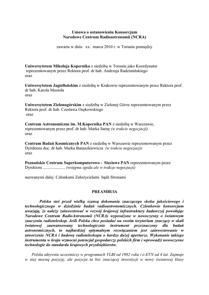 Umowa o ustanowieniu Konsorcjum Narodowe Centrum Radioastronomii (NCRA) zawarta w dniu xx. marca 2010 r. w Toruniu pomiędzy Uniwersytetem Mikołaja Kopernika z siedzibą w Toruniu jako Koordynator reprezentowanym przez Rektora prof. dr hab. Andrzeja Radzimińskiego oraz Uniwersytetem Jagiellońskim z siedzibą w Krakowie reprezentowanym przez Rektora prof. dr hab. Karola Musioła oraz Uniwersytetem Zielonogórskim z siedzibą w Zielonej Górze reprezentowanym przez Rektora prof. dr hab. Czesława Osękowskiego oraz Centrum Astronomiczne im. M.Kopernika PAN z siedzibą w Warszawie, reprezentowanym przez prof. dr hab. Marka Sarnę (w trakcie negocjacji) oraz Centrum Badań Kosmicznych PAN z siedzibą w Warszawie reprezentowanym przez Dyrektora doc. dr hab. Marka Banaszkiewicza (w trakcie negocjacji) oraz Poznańskie Centrum Superkomputerowo - Sieciowe PAN reprezentowanym przez Dyrektora ..................... (wstępna zgoda ale w trakcje negocjacji) nazwanymi dalej Członkami Założycielami bądź Stronami PREAMBUłA Polska stoi przed wielką szansą dokonania znaczącego skoku jakościowego i technologicznego w dziedzinie badań radioastronomicznych. Członkowie konsorcjum uważają, że należy zainwestować w rozwój krajowej infrastruktury badawczej powołując Narodowe Centrum RadioAstronomii (NCRA) wyposażone w nowoczesny o światowym znaczeniu radioteleskop. Jeśli Polska chce posiadać na swoim terytorium znaczący w skali światowej zaawansowany technologicznie instrument przeznaczony dla badań astronomicznych, to najbardziej optymalnym rozwiązaniem jest zainwestowanie w utworzenie NCRA i budowę radioteleskopu o bardzo dużej aperturze. Wykonanie takiego instrumentu w kraju wzmocni potencjał gospodarczy polskich firm i wprowadzi nowoczesne technologie do standardu krajowych przedsiębiorstw. Polska aktywnie uczestniczy w programach VLBI od 1982 roku i e-EVN od 4 lat. Zajmuje w niej mocną pozycję, ale pozycja ta bez znaczącej inwestycji w nowy światowej klasy instrument z upływem czasu osłabnie z uwagi na postęp w tej dziedzinie w świecie, w tym włączaniu nowych dużych anten do sieci VLBI, oraz z uwagi na lawinowo rosnący poziom zakłóceń radiowych generowanych przez cywilizację. Zakłócenia te ograniczają, a w niektórych pasmach uniemożliwiają, wykonywanie czułych pomiarów przy pomocy istniejących radioteleskopów, które pobudowano w miejscach uznanych kiedyś za obszary bezpieczne i chronione dla prowadzenia specjalistycznych badań naukowych. Jeśli nasz kraj nie podtrzyma dalszego rozwój radioastronomii, to pozycja Polski w tej dyscyplinie nauki ulegnie szybkiej degradacji. Szacujemy, że po 8-10 latach działalność badawcza przy użyciu aktualnie posiadanych krajowych instrumentów zaniknie. Polska zasługuje na posiadanie nowoczesnego instrumentu do badań astronomicznych ulokowanego na własnym terytorium. Z uwagi na uwarunkowania klimatyczne, znaczące inwestycje w astrofizykę obserwacyjną mają głęboki sens jedynie w dziedzinie radioastronomii w zakresach wciąż jeszcze „czystych” pasm 5-25 GHz. Z obecnym doświadczeniem, kadrą i silnie rozwiniętą współpracą zagraniczną członków konsorcjum mamy wielką szansę na realizację proponowanej ambitnej inwestycji. Naszym zdaniem inicjatywa budowa dużego radioteleskopu wsparta przez dyrektorów Europejskiej Sieci VLBI (EVN), zapewni polskiej astronomii znaczącą pozycję w nauce światowej przez następne dziesięciolecia. Stworzenie Narodowego Centrum Radioastronomii w powiązaniu z EVN i SKA umożliwi dopływ środków zagranicznych (Trans National Access funds oraz wspólne europejskie programy naukowo-technologiczne), stworzy miejsca pracy dla młodego pokolenia uczonych oraz umożliwi udział w najważniejszych projektach badawczych współczesnej radioastronomii na światowym poziomie. Mając na uwadze powyższe Strony postanawiają co następuje, §1 POSTANOWIENIA OGÓLNE 1. Strony niniejszej umowy powołują konsorcjum pod nazwą Narodowe Centrum Radioastronomii (NCRA), zwane w dalszej części umowy Konsorcjum 2. Strony przystępują do Konsorcjum na równych prawach stając się jego członkami. 3. Koordynatorem Konsorcjum staje się Uniwersytet Mikołaja Kopernika, jako inicjator utworzenia Konsorcjum. 4. Siedziba Konsorcjum jest Uniwersytet Mikołaj Kopernika w Toruniu . 5. Członkowstwo w Konsorcjum nie wyklucza możliwości udziału w innych konsorcjach czy też platformach z zastrzeżeniem udziału w tych konsorcjach i im podobnych podmiotach, które mają charakter zbieżny z Konsorcjum. 6. Strony wypracują i przyjmą oficjalne logo Konsorcjum i wraz z nazwą będzie ono umieszczane na każdym wspólnym dokumencie wypracowanym w związku z realizacją niniejszej umowy 7. Strony zachowują prawo do prowadzenia indywidualnej działalności naukowobadawczej, dydaktycznej i gospodarczej poza Konsorcjum. 8. Utworzone Konsorcjum nie narusza osobowości prawnej jego członków ani ich integralności majątkowej. 9. Konsorcjum nie posiada osobowości prawnej. §2 Cele Konsorcjum Przedmiot działalności konsorcjum obejmuje: • połączenie potencjału naukowego i technicznego instytucji członkowskich konsorcjum dla realizacji ambitnych zadań badawczych i rozwojowych technologicznych w dziedzinach: nauk technicznych, transferu i przetwarzania danych cyfrowych oraz radioastronomii, • utworzenie NCRA - jednostki prowadzącej zaawansowane badania w dziedzinie radioastronomii, z przyszłą funkcją regionalnej filii teleskopów VLBI, ALMA i SKA • nadzór nad pracami projektowymi i budową 90-m anteny RT90 w wolnej od radiowych zakłóceń lokalizacji (np. Bory Tucholskie), • projektowanie, budowa i uruchomienie aparatury naukowej stanowiącej wyposażenie radioteleskopu RT90, • koordynacja i prowadzenie badań naukowych przy pomocą 90-m anteny, • kształcenie i rozwój młodej kadry naukowe w dziedzinie radioastronomii. §3 Członkostwo w Konsorcjum 1. Konsor