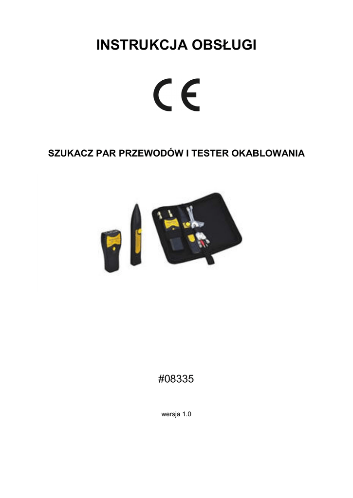 INSTRUKCJA OBSŁUGI SZUKACZ PAR PRZEWODÓW I TESTER OKABLOWANIA #08335 wersja 1.0 1. Wstęp Szukacz par przewodów zintegrowany z testerem okablowania jest przeznaczony do identyfikowania i wyszukiwania przewodów bez naruszania ich izolacji. Dla linii telefonicznych moŜe dodatkowo wskazywać stan linii i ułatwiać rozwiązywanie problemów instalacyjnych i konserwatorskich. Jego dodatkową zaletą jest tester okablowania sieciowego i telefonicznego (RJ45 i RJ11). W tym przypadku diody wbudowane w urządzenie sygnalizują uŜytkownikowi stan badanego kabla. Do urządzenia dołączone są słuchawki umoŜliwiające jego wyciszenie oraz izolację hałasu z otoczenia. 2. Funkcjonalność 2.1. Wyszukiwanie par przewodów. 2.2. Wyszukiwanie punktu uszkodzenia przewodu. 2.3. Wykrywanie sygnału dzwonienia na liniach telefonicznych. 2.4. Identyfikacja stanu sieci teleinformatycznych. 2.5. Wysyłanie sygnału w celu identyfikacji wybranego przewodu spośród wiązki. 3. Uwagi: - Nie naleŜy wystawiać urządzenia na bezpośrednie działanie promieni słonecznych. - Nie naleŜy zostawiać urządzenia w miejscach o duŜym zapyleniu i duŜej wilgotności oraz temperaturach powyŜej 40oC. - NaleŜy uŜywać wyłącznie rodzaju baterii podanych w specyfikacji. - Napraw naleŜy dokonywać wyłącznie przez osoby wykwalifikowane. - Nie uŜywając urządzenia dłuŜszy okres czasu naleŜy wyjąć baterie. - Nie naleŜy podłączać urządzenia do sieci będącej pod napięciem, moŜe to spowodować uszkodzenie urządzenia i moŜe być zagroŜeniem dla Ŝycia lub zdrowia. W skład zestawu wchodzi: 1. Moduł nadawczy, Moduł odbiorczy 2. Słuchawki douszne 3. Kabel zakończony krokodylkami 4. Instrukcja obsługi w języku polskim i angielskim 5. Etui Opis modułu nadawczego (1) Złącze RJ11 (2) Złącze RJ45 (3) Dioda LED sygnalizująca wyszukiwanie przewodu (4) Dioda zasilania (5) Przycisk SKAN (6) Wyłącznik urządzenia/wybór funkcji (7) Zaślepka baterii Opis modułu odbiorczego (1) (2) (3) (4) (5) (6) (7) (8) (9) 2 Detektor sygnałowy Dioda zasilania PWR-VOL (potencjometr) Zaślepka baterii Wskaźnik sygnału Gniazdo RJ45/RJ11 Głośnik Wyjście słuchawkowe Słuchawki douszne 4. Obsługa urządzenia 4.1. Funkcja wyszukiwania par przewodów Funkcja ta pozwala na szybkie wyszukiwanie pary przewodów. W module nadawczym bezpośrednio do gniazda RJ11/RJ45 lub za pomocą krokodylków naleŜy podłączyć jeden koniec przewodu. Przesunąć suwak wyboru funkcji w pozycję środkową. Następnie wcisnąć przycisk SCAN oraz zlokalizować za pomocą modułu odbiorczego poŜądany przewód (moduł odbiorczy naleŜy włączyć potencjometrem, obracając go zgodnie z ruchem wskazówek zegara). Wykrycie zasygnalizowane będzie odpowiednim dźwiękiem. 4.2. Funkcja testowania okablowania Funkcja ta ma za zadanie sprawdzić fizyczny stan przewodu. Zapalenie się poszczególnych diod na urządzeniu ma na celu sygnalizowanie uŜytkownikowi czy jest moŜliwy przesył sygnału danym przewodem. Urządzenie obsługuje następujące rodzaje przewodów: 1. Przewód sieciowy (standardy: 10 Base-t EIA/TIA568A, EIA/TIA 568B, AT&T258A, Token Ring). 2. Przewód telefoniczny (2pin/4pin). Aby przystąpić do testowania naleŜy wpiąć przewód w odpowiednie gniazdo nadajnika, a drugi koniec w wolne gniazdo odbiornika. Następnie przesunąć suwak wyboru funkcji maksymalnie w górę. Zapalanie się odpowiednich diod na odbiorniku sygnalizuje prawidłowe działanie przewodu. PoniŜsza tabela pokazuje prawidłowy status dla testowanych przewodów. UWAGA: NIE NALEśY PODŁĄCZAĆ URZĄDZENIA DO PRZEWODÓW POD NAPIĘCIEM 5. Instrukcja bezpiecznej wymiany i usuwania baterii Aby wymienić baterię zasilającą nadajnik lub odbiornik naleŜy zdjąć klapkę na tylnej ściance obudowy urządzenia, wymienić baterię 9V(6F22) i zamontować powtórnie klapkę, usunięte baterie składować w specjalnie wyznaczonym miejscu zbiórki. 3 Symbol przekreślonego kosza na śmieci, umieszczony na baterii lub opakowaniu, oznacza, Ŝe baterie nie powinny być traktowane jako zwykłe odpadki z gospodarstwa domowego. W dniu 12 czerwca 2009 r. weszły w Ŝycie przepisy ustawy z dnia 24 kwietnia 2009 r. o bateriach i akumulatorach (Dz. U. z 2009 r. Nr 79, poz. 666) ograniczające negatywny wpływ baterii i akumulatorów na środowisko poprzez redukcję ilości substancji niebezpiecznych w bateriach i akumulatorach oraz przez organizowanie systemu selektywnego ich zbierania. Stosując prawidłową utylizację baterii i akumulatorów uŜytkownik przyczynia się do zapobiegania potencjalnie negatywnym konsekwencjom dla środowiska naturalnego i ludzkiego zdrowia, które mogłyby powstać w przypadku nieprawidłowej utylizacji baterii. Recykling materiałów przyczynia się do ochrony zasobów naturalnych. Symbole chemiczne oznaczające rtęć (Hg) lub ołów (Pb) dodawane są, jeŜeli bateria zawiera ponad 0,0005% rtęci lub 0,004% ołowiu. Szczegółowe informacje dotyczące recyklingu baterii moŜna uzyskać od organów samorządu lokalnego, w firmie zajmującej się usuwaniem odpadów lub w sklepie, gdzie produkt został zakupiony. 6. Informacja dla uŜytkowników o pozbywaniu się urządzeń elektrycznych i elektronicznych (dotyczy gospodarstw domowych) Przedstawiony symbol umieszczony na produktach lub dołączonej do nich dokumentacji informuje, Ŝe niesprawnych urządzeń elektrycznych lub elektronicznych nie moŜna wyrzucać razem z odpadami gospodarczymi. Prawidłowe postępowanie w razie konieczności utylizacji, powtórnego uŜycia lub odzysku podzespołów polega na przekazaniu urządzenia do wyspecjalizowanego punktu zbiórki, gdzie będzie przyjęte bezpłatnie. W niektórych krajach produkt moŜna oddać lokalnemu dystrybutorowi podczas zakupu innego urządzenia. Prawidłowa utylizacja urządzenia umoŜliwia zachowanie cennych zasobów i uniknięcie negatywnego wpływu na zdrowie i środowisko, które moŜe być zagroŜone przez nieodpow