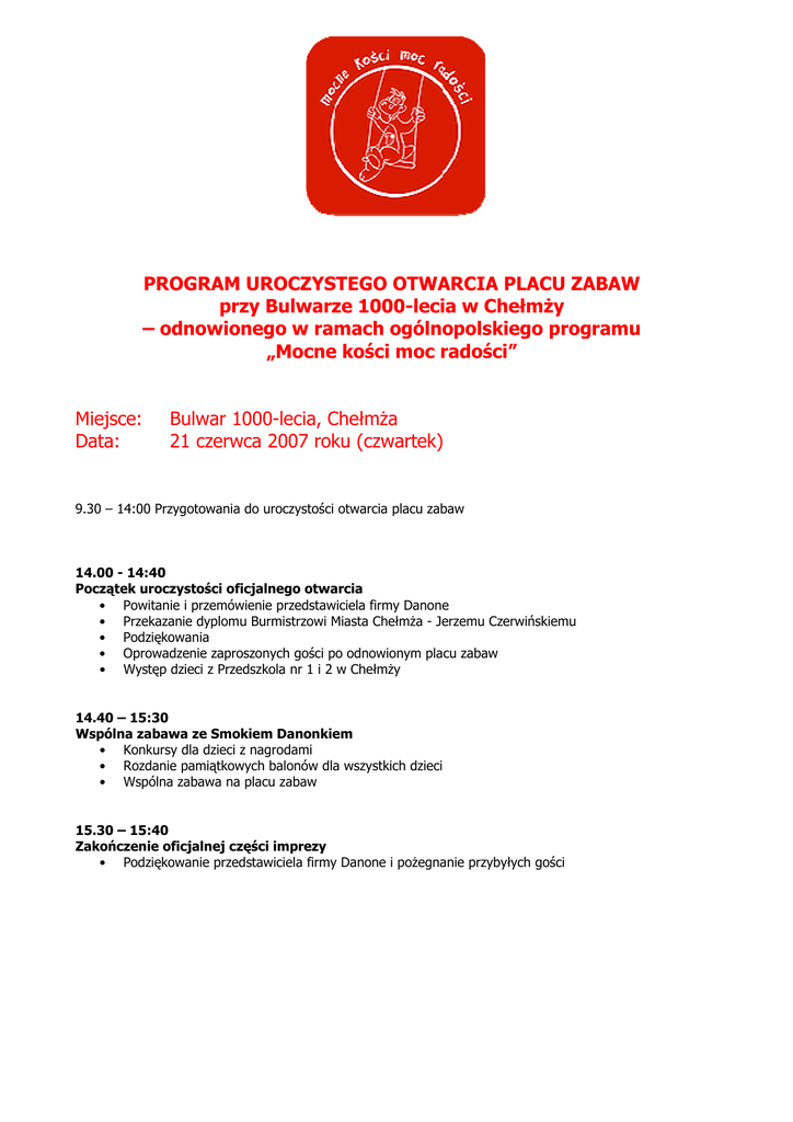 PROGRAM UROCZYSTEGO OTWARCIA PLACU ZABAW przy Bulwarze 1000-lecia w ChełmŜy – odnowionego w ramach ogólnopolskiego programu „Mocne kości moc radości” Miejsce: Data: Bulwar 1000-lecia, ChełmŜa 21 czerwca 2007 roku (czwartek) 9.30 – 14:00 Przygotowania do uroczystości otwarcia placu zabaw 14.00 - 14:40 Początek uroczystości oficjalnego otwarcia • Powitanie i przemówienie przedstawiciela firmy Danone • Przekazanie dyplomu Burmistrzowi Miasta ChełmŜa - Jerzemu Czerwińskiemu • Podziękowania • Oprowadzenie zaproszonych gości po odnowionym placu zabaw • Występ dzieci z Przedszkola nr 1 i 2 w ChełmŜy 14.40 – 15:30 Wspólna zabawa ze Smokiem Danonkiem • Konkursy dla dzieci z nagrodami • Rozdanie pamiątkowych balonów dla wszystkich dzieci • Wspólna zabawa na placu zabaw 15.30 – 15:40 Zakończenie oficjalnej części imprezy • Podziękowanie przedstawiciela firmy Danone i poŜegnanie przybyłych gości