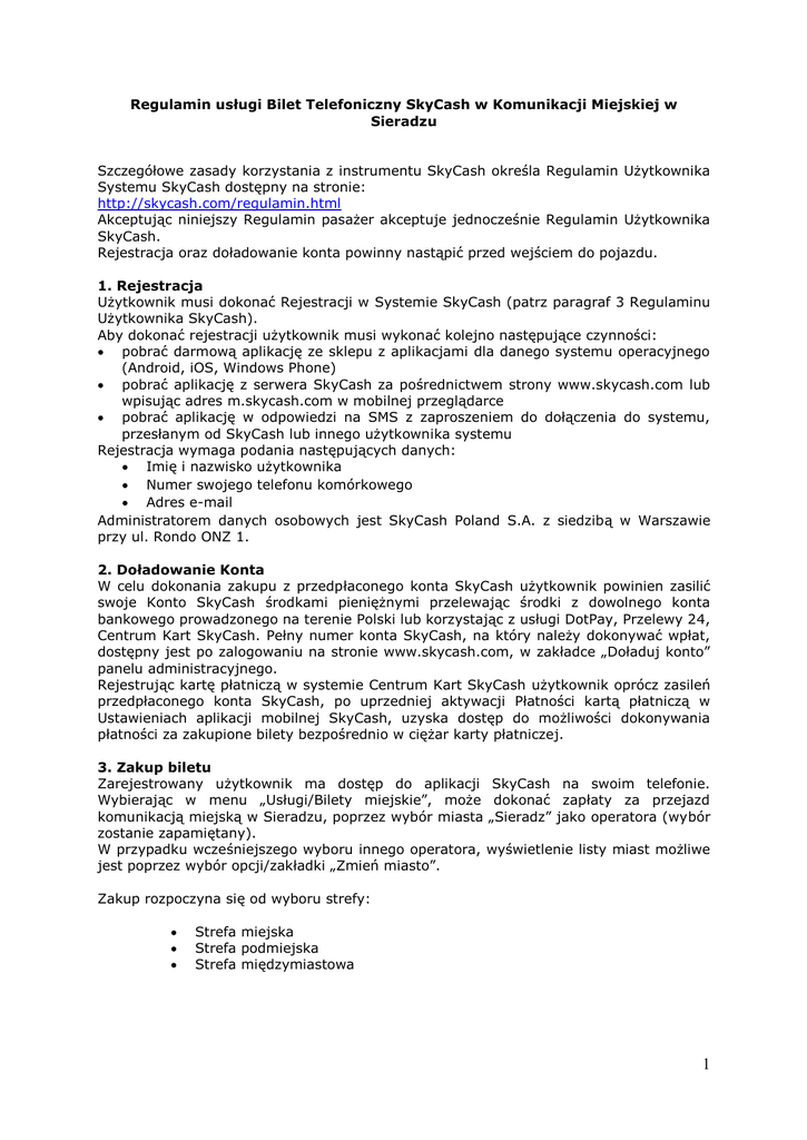 Regulamin usługi Bilet Telefoniczny SkyCash w - Sieradz