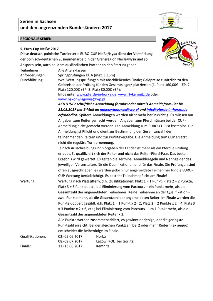 Serien in Sachsen und den angrenzenden Bundesländern 2017 REGIONALE SERIEN 5. Euro-Cup Neiße 2017 Diese deutsch-polnische Turnierserie EURO-CUP Neiße/Nysa dient der Verstärkung der polnisch-deutschen Zusammenarbeit in der Grenzregion Neiße/Nysa und soll Ansporn sein, auch bei dem ausländischen Partner an den Start zu gehen. Teilnehmer: Alle Altersklassen Anforderungen: Springprüfungen Kl. A (max. 1,15m) Durchführung: zwei Wertungsprüfungen mit abschließendes Finale; Geldpreise zusätzlich zu den Gelpreisen der Prüfung für den Gesamtsieger/-platzierten (1. Platz 160,00€ + EP, 2. Platz 120,00€ +EP, 3. Platz 80,00€ +EP); Infos unter www.pferde-in-horka.de, www.rfvkemnitz.de oder [email protected] ACHTUNG: schriftliche Anmeldung formlos oder mittels Anmeldeformular bis 31.05.2017 per E-Mail an [email protected] und [email protected] erforderlich. Spätere Anmeldungen werden nicht mehr berücksichtig. Es müssen nur Angaben zum Reiter gemacht werden, Angaben zum Pferd müssen bei der CUPAnmeldung nicht gemacht werden. Die Anmeldung zum EURO-CUP ist kostenlos. Die Anmeldung ist Pflicht und dient zur Bestimmung der Gesamtanzahl der teilnehmenden Reitern und zur Punktevergabe. Die Anmeldung zum CUP ersetzt nicht die reguläre Turniernennung. Je nach Ausschreibung und Vorgaben der Länder ist mehr als ein Pferd je Prüfung erlaubt. Es qualifiziert sich der Reiter und nicht das Reiter-Pferd-Paar. Das beste Ergebnis wird gewertet. Es gelten die Termine, Anmelderegeln und Nenngelder des jeweiligen Veranstalters für die Qualifikationen und für das Finale. Die Prüfungen sind offen ausgeschrieben, es werden jedoch nur angemeldete Teilnehmer für die EUROCUP Wertung berücksichtigt. Es besteht Teilnahmepflicht am Finale! Wertung: Wertung nach Platzziffern, d.h. Qualifikationen: Platz 1 = 1 Punkt, Platz 2 = 2 Punkte, Platz 3 = 3 Punkte, etc.; bei Eliminierung vom Parcours – ein Punkt mehr, als die Gesamtzahl der angemeldeten Teilnehmer; Keine Teilnahme an der Qualifikation zwei Punkte mehr, als die Gesamtzahl der angemeldeten Reiter. Im Finale werden die Punkte doppelt gezählt, d.h. Platz 1 = 1 Punkt x 2= 2, Platz 2 = 2 Punkte x 2 = 4, Platz 3 = 3 Punkte x 2 = 6, etc.; bei Eliminierung vom Parcours – um 1 Punkt mehr, als die Gesamtzahl der angemeldeten Reiter x 2. Alle Punkte werden zusammenaddiert, es gewinnt derjenige, der die geringste Punktzahl erreicht. Bei der gleichen Punktzahl bei 2 oder mehr Reitern (ex aequo) entscheidet die Reihenfolge im Finale. Qualifikationen: 02.-05.06.2017 Horka 08.-09.07.2017 Lagów, POL (bei Görlitz) Finale: 11.-13.08.2017 Kemnitz ANMELDEFORMULAR / FORMULARZ ZGŁOSZENIOWY Imię / Vorname: ………………………………………………………………………………………………………………………… Nazwisko / Name: …………………………………………………………………………………………………………………………. Rok urodzenia / Geburtsjahr: ………………………………………………………………………………………………………………. Klub (Stowarzyszenie) / Reitverein: ……………………………………………………………………………………………………… Numer telefonu / Telefonnummer: ……………………………………………………………………………………………………….. (w razie pytań/ für Rückfragen) E-mail: …………………………………………………………………………………………………………………………………………………….. (w razie pytań/ für Rückfragen) Ilość koni zgłoszona do CUP’u / Anzahl der zum CUP gemeldeten Pferde: …………………………………………. Numer Licencji jeźdźca / Reiterlizenznummer: …………………………………………………………………………………….. *** Zgłoszenie należy przesłać w dowolnej formie lub na tym formularzu mailem w nieprzekraczalnym terminie do dnia 31. maja 2017 na adres: [email protected] oraz [email protected] UWAGA! Polskich zawodników obowiązuje potwierdzenie polskiej licencji w Niemczech i uzyskanie tzw. licencji gościnnej za pośrednictwem Pana Nemezjusza Kasztelana E-mail: [email protected] Należy to zrobić we własnym zakresie, w jęz. polskim ok. 4 tygodnie przed pierwszymi zawodami, wysyłając mailem swoje dane oraz numer opłaconej licencji jeździeckiej na obecny rok a także podać na jakie zawody w Niemczech ta licencja ma obowiązywać (można podać kilka). Regulacja ta jest niezależna od EURO-CUP i obowiązuje w całych Niemczech na wszystkich zawodach. *** Die Anmeldung, formlos oder auf dem Formular muss bis zum spätestens 31. Mai 2017 per email an: [email protected] und [email protected] geschickt werden.