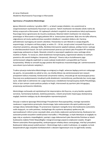dr Jerzy Chełmecki Akademia Wychowania Fizycznego w Warszawie Sportowcy u Prezydenta Mościckiego Ignacy Mościcki urodzony 1 grudnia 1867 r., w latach swojej młodości, nie uczestniczył w zorganizowanym wychowaniu fizycznym czy sporcie. Takich możliwości nie dawała szkoła realna do której uczęszczał w Warszawie. W rządowych szkołach rosyjskich nie prowadzono lekcji wychowania fizycznego lub je ograniczano do musztry woskowej. Również takich możliwości nie stwarzały, powstające w Warszawie w drugiej połowie XIX w. towarzystwa sportowe. Były one nie tylko elitarne, odgrodzone od reszty społeczeństwa wysokimi składkami i zasadami doboru ale i barierą pełnoletności wymaganą od swoich członków. Potwierdza to sam Mościki w swojej biografii, wspominając, że dopiero od klasy piątej, w wieku 15 – 16 lat, zaczął szukać rozrywek fizycznych na otwartym powietrzu, pływając łódką. Bardziej intensywnie spędzał wakacje, jeżdżąc konno i polując w skierbieszewskich lasach. Do tych zainteresowań powraca po latach jako Prezydent RP namiętnie organizując polowania w Spale. Niewiele zmienił w zwyczajach spędzania czasu wolnego okres studiów w Rydze. To raczej on, obok działalności konspiracyjnej, organizował zabawy na wolnym powietrzu dla swoich kolegów z korporacji „Wenecja”. Pewna rolę w kształtowaniu jego zainteresowań odegrały wędrówki w czasie wakacji studenckich z przyjaciółmi po Puszczy Kurpiowskiej. Wtedy to utrwalił się jego podziw dla krajobrazu mazowieckiego jak i zainteresowanie warunkami życia ludności wiejskiej 1. Trudna sytuacja materialna Mościckiego na emigracji w Anglii, wówczas będącą centrum rodzącego się sportu, nie pozwalała na udział w nim, czy choćby bliższe się zainteresowanie tym nowym przejawem kultury masowej. Konieczność utrzymania rodziny, zmuszała go do wyczerpującej pracy fizycznej oraz podejmowanie żmudnych prób działalności rzemieślniczej, pochłaniały bez reszty jego życie. Jakże było to odmienne niż u jego towarzysza z działalności konspiracyjnej Józefa Piłsudskiego, który w tym samym czasie podczas pobytu w Anglii, interesował się sportem jako intrygującą propozycją wychowania młodzieży. Mościckiego cechowała od najmłodszych lat nieprzeciętna siła fizyczna, co przy bardzo wysokim wzroście, harmonijnej budowie, świetnej postawie, z latami przyniosło imponujący dostojnością wygląd, świetnie nadający się do obowiązków reprezentacyjnych. Decyzja o wyborze Ignacego Mościckiego Prezydentem Rzeczypospolitej, znanego wprawdzie naukowca i organizatora przemysłu chemicznego, była zaskoczeniem dla opinii publicznej jak i samego obozu belwederskiego. Po przewrocie majowym nastąpiły teraz lata budowania autorytetu osób stojących, na czele państwa, niezbędnego dla uzyskania akceptacji społecznej dla wprowadzanych reform przez zwycięski obóz, przy braku większości parlamentarnej, Budowano ten autorytet przede wszystkim wokół postaci marszałka J. Piłsudskiego, co było łatwiejsze ze względu na jego rolę w uzyskaniu niepodległości, pamięć o jego dokonaniach jako Naczelnika Państwa w latach budowania zrębów Polski Niepodległej i nieograniczonego poparcia większości wojska. Drugim filarem autorytetu Rzeczypospolitej, sankcjonującym władzę obozu sanacyjnego, miał być prezydent. Budowanie takiej pozycji wokół postaci I. Mościckiego była o wiele trudniejsze, ze względu na brak bezpośrednich jego związków kombatanckich z obozem legionowym oraz na ogół braku wiedzy sympatyków nowej władzy, o jego działalności konspiracyjnej okresu zaborów. Na gruncie sportu podział ról miedzy tymi osobami został jasno zakreślony. Dla Marszałka Piłsudskiego, interesującego się od wielu lat się sportem jako instrumentem podnoszenia zdolności bojowej wojska, została zarezerwowania rola reformatora tej dziedziny. Jako Przewodniczący utworzonej w 1927 r. Rady Naukowej Wychowania Fizycznego, aktywnie w jej pracach uczestniczył, wyznaczając kierunki rozwoju kultury fizycznej w Polsce. Z jego inicjatywy jako premiera z rezerwy budżetowej wybudowano Centralny Instytut Wychowania Fizycznego (dzisiejszy AWF) oraz reprezentacyjny Stadion Wojska Polskiego. To z jego inicjatywy stworzono pierwsze ministerstwo sportu (PU WF i PW) w strukturach Min. Spraw Wojskowych z własnym, zatwierdzanym przez Sejm, budżetem. To on osobiście wspierał rozwój sportu wyczynowego, szczególnie rozwój sportu kobiet. To dzięki jego wsparciu w przyjętej doktrynie wojskowej, wychowaniu fizycznemu i sportowi nadano szczególnie ważną rolę w przygotowaniu całego społeczeństwa do obrony niedawno uzyskanej niepodległości2. Rolą Prezydenta RP, poprzez roztoczony protektorat nad sportem, było podnoszenie rangi społecznej tej młodej dziedziny oraz pozyskiwanie dla sanacji społecznych działaczy oraz szybko rosnącej rzeszy młodzieży podejmującej działalność sportową. Początkowo zadania te wypełniane były okazyjnie, przy okazji wizytowania różnych regionów kraju. Przykładem może być obecność Mościckiego wraz z małżonką na Międzynarodowych Regatach Wioślarskich w Brdyujściu przy okazji wizytowania Bydgoszczy3. Z czasem przygotowano planową ofensywę celem objęcia patronatem całego społecznego sportu polskiego. Premiera nastąpiła z okazji II Polskiego Kongresu Sportowego w dniach 9 i 10 kwietnia 1927r. Kongres uzyskał patronat Prezydenta Mościckiego i premiera Józefa Piłsudskiego oraz środki finansowe na jego organizację. Na otwarcie kongresu przybył sam Prezydent ze swoją świtą w otoczeniu wicepremiera K. Bartna i kilku ministrów, wysokich urzędników ministerialnych oraz przedstawicieli wszystkich okręgów wojskowych. Uczestnicy kongresu, 400 przedstawicieli społecznego polskiego sportu, entuzjastycznie przyjęli zainteresowanie rozwojem sportu władz państwowych oraz przedstawione plany państwoweg