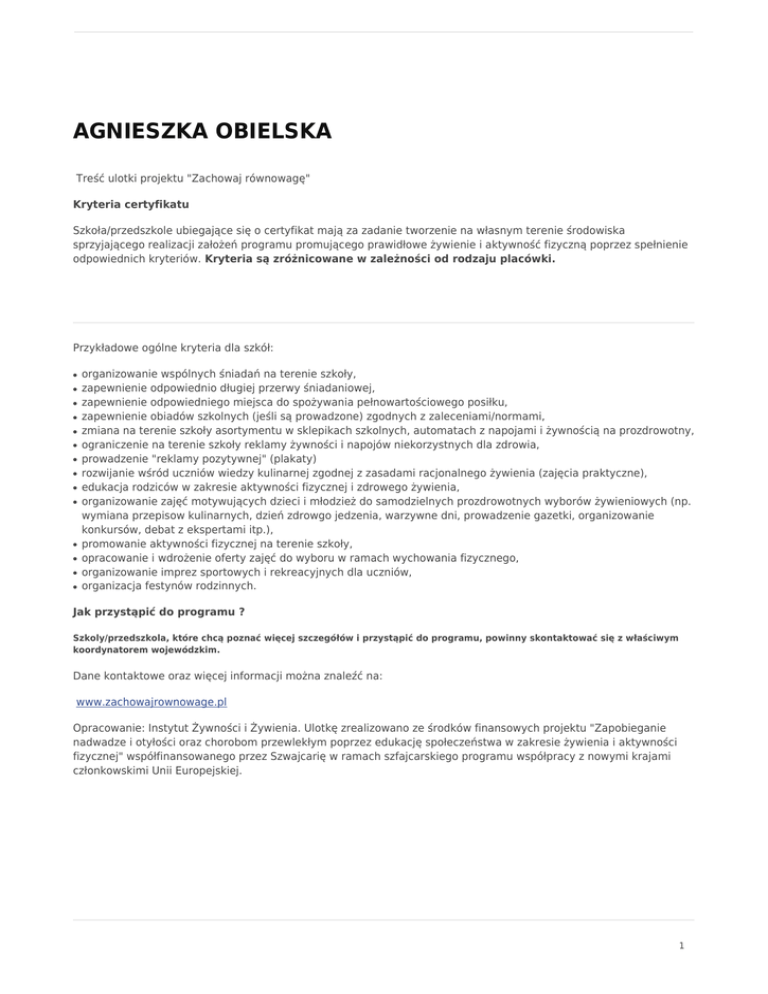 AGNIESZKA OBIELSKA Treść ulotki projektu "Zachowaj równowagę" Kryteria certyfikatu Szkoła/przedszkole ubiegające się o certyfikat mają za zadanie tworzenie na własnym terenie środowiska sprzyjającego realizacji założeń programu promującego prawidłowe żywienie i aktywność fizyczną poprzez spełnienie odpowiednich kryteriów. Kryteria są zróżnicowane w zależności od rodzaju placówki. Przykładowe ogólne kryteria dla szkół: ● ● ● ● ● ● ● ● ● ● ● ● ● ● organizowanie wspólnych śniadań na terenie szkoły, zapewnienie odpowiednio długiej przerwy śniadaniowej, zapewnienie odpowiedniego miejsca do spożywania pełnowartościowego posiłku, zapewnienie obiadów szkolnych (jeśli są prowadzone) zgodnych z zaleceniami/normami, zmiana na terenie szkoły asortymentu w sklepikach szkolnych, automatach z napojami i żywnością na prozdrowotny, ograniczenie na terenie szkoły reklamy żywności i napojów niekorzystnych dla zdrowia, prowadzenie "reklamy pozytywnej" (plakaty) rozwijanie wśród uczniów wiedzy kulinarnej zgodnej z zasadami racjonalnego żywienia (zajęcia praktyczne), edukacja rodziców w zakresie aktywności fizycznej i zdrowego żywienia, organizowanie zajęć motywujących dzieci i młodzież do samodzielnych prozdrowotnych wyborów żywieniowych (np. wymiana przepisow kulinarnych, dzień zdrowgo jedzenia, warzywne dni, prowadzenie gazetki, organizowanie konkursów, debat z ekspertami itp.), promowanie aktywności fizycznej na terenie szkoły, opracowanie i wdrożenie oferty zajęć do wyboru w ramach wychowania fizycznego, organizowanie imprez sportowych i rekreacyjnych dla uczniów, organizacja festynów rodzinnych. Jak przystąpić do programu ? Szkoly/przedszkola, które chcą poznać więcej szczegółów i przystąpić do programu, powinny skontaktować się z właściwym koordynatorem wojewódzkim. Dane kontaktowe oraz więcej informacji można znaleźć na: www.zachowajrownowage.pl Opracowanie: Instytut Żywności i Żywienia. Ulotkę zrealizowano ze środków finansowych projektu "Zapobieganie nadwadze i otyłości oraz chorobom przewlekłym poprzez edukację społeczeństwa w zakresie żywienia i aktywności fizycznej" współfinansowanego przez Szwajcarię w ramach szfajcarskiego programu współpracy z nowymi krajami członkowskimi Unii Europejskiej. 1