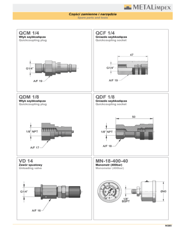 Części zamienne i narzędzia Spare parts and tools QCM 1/4 Wtyk szybkozłącza Quickcoupling plug QCF 1/4 Gniazdo szybkozłącza Quickcoupling socket 47 G1/4” G1/4” A/F 19 QDM 1/8 Wtyk szybkozłącza Quickcoupling plug A/F 19 QDF 1/8 Gniazdo szybkozłącza Quickcoupling socket 50 1/8” NPT A/F 17 VD 14 Zawór spustowy Unloading valve 1/8” NPT A/F 18 MN-18-400-40 Manometr (400bar) Manometer (400bar) Ø40 G1/4” 1/8” BSPT A/F 16 H/265 Części zamienne i narzędzia Spare parts and tools MN-14-600-40 MN-14-600-62 Manometr (600bar) Manometer (600bar) Manometr (600bar) Manometer (600bar) Ø40 Ø62 1/4” BSPT 1/4” BSPT SPS 1/4 SPS 1/8 Czujnik ciśnienia do paneli kontrolnych Pressure sensor ~50 40 ~83 G1/4” Czujnik ciśnienia do paneli kontrolnych Pressure sensor A/F 27 9 2 Połączenie elektryczne ze strownikiem prasy Electrical connection to the press ~83 Gwintowane połączenie z panelem kontrolnym Threaded connection to the control panel 25 4 P A/F 19 G1/8” 1 Gwintowane połączenie z panelem kontrolnym Threaded connection to the control panel 2 7 4 P 1 Informacje techniczne / Technical data Zalety Zakres pracy / Range: ● Niewielki wymiary. ● Umożliwia automatyczny monitoring instalacji azotowych. ● Alarm pozwala uniknąć produkcji wadliwych detali. ● Zwiększenie efektywności produkcji. 50 - 200 bar Dokałdność / Tolerance: ±5 bar 20 ºC Gwint / Thread: G1/4” ; G1/8” Napięcie / Tension: Maksymalne ciśnienie / Safety over-pressure: Temperatura pracy / Working temperature: 24 ÷ 250 V 300 bar -25ºC ÷ +50 ºC Jeżeli ciśnienie w instalacji azotowej spadnie poniżej dopuszczalnej wartości ustawionej przez użytkownika (minimalne ciśnienie pracy), czujnik wysyła sygnał ostrzegający lub zatrzymujący pracę urządzenia. If the pressure of the piping circuit drops below a set limit user (optimal minimum operation), the switch sends a signal can be used to either warn or stop mechanism that is associated. H/266 ~50 40 Połączenie elektryczne ze strownikiem prasy Electrical connection to the press Advantages ● Compact design. ● Allows automatic control of piping circuits. ● Alert previously avoiding the production of defective parts. ● Increased efficiency in production. Części zamienne i narzędzia Spare parts and tools DIN 7757 XTC-M6 Zawór Valve Zawór Valve Vg 5 M6 A 800 ALXTC DMNL DDNM Szczypce do zaworów Pliers for valves Klucz do zaworów Key for valves Wkrętak z końcówkami do zaworów Screwdriver ABXP XTCP Wkrętak z końcówkami do zaworów Screwdriver ABXP XTCP H/267 Części zamienne i narzędzia Spare parts and tools 06 HI 8-Q 06 GA 11 Adapter M6 / szybkozłączka Adapter Adapter G1/8” / M6 Adapter e/c 13 G1/8” M6 5 28 18 HI 4-Q 18 GA 5 Adapter G1/8” / G1/8” Adapter e/c 16 G1/8” 27 M6 G1/8” 6 Adapter G1/8” / szybkozłączka Adapter G1/8” LM 3 Narzędzie do wyciągania tłoka Extraction tool for piston rods LM 6 Narzędzie do wyciągania tłoka Extraction tool for piston rods M3 LM 8 Narzędzie do wyciągania tłoka Extraction tool for piston rods M8 H/268 M6 LM 16 Narzędzie do wyciągania tłoka Extraction tool for piston rods M16 Części zamienne i narzędzia Spare parts and tools DALL 3 DPA 5 Klucz imbusowy Allen key Wkrętak płaski Flat head screwdriver e/c 3 DALL 5 Klucz imbusowy Allen key e/c 5 T 1/8 T M6 Zaślepka Plug Zaślepka Plug M6 G1/8” TR M6 A 550 1/8-M6 Zaślepka Plug Przyrząd do opróżniania sprężyn Draining tool M6 G1/8” LRP 1 Szczypce do pierścieni Pliers M6 LRP 2 Szczypce do pierścieni Pliers H/269