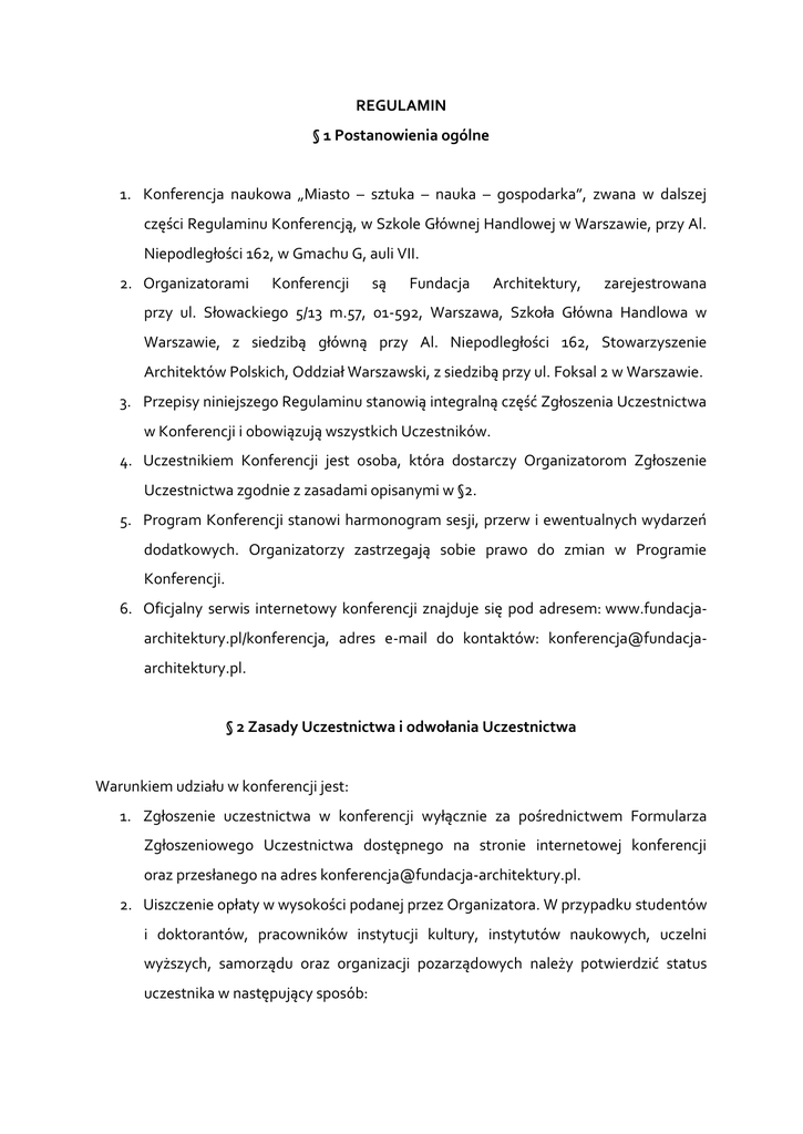 REGULAMIN § 1 Postanowienia ogólne 1. Konferencja naukowa „Miasto – sztuka – nauka – gospodarka”, zwana w dalszej części Regulaminu Konferencją, w Szkole Głównej Handlowej w Warszawie, przy Al. Niepodległości 162, w Gmachu G, auli VII. 2. Organizatorami Konferencji są Fundacja Architektury, zarejestrowana przy ul. Słowackiego 5/13 m.57, 01-592, Warszawa, Szkoła Główna Handlowa w Warszawie, z siedzibą główną przy Al. Niepodległości 162, Stowarzyszenie Architektów Polskich, Oddział Warszawski, z siedzibą przy ul. Foksal 2 w Warszawie. 3. Przepisy niniejszego Regulaminu stanowią integralną część Zgłoszenia Uczestnictwa w Konferencji i obowiązują wszystkich Uczestników. 4. Uczestnikiem Konferencji jest osoba, która dostarczy Organizatorom Zgłoszenie Uczestnictwa zgodnie z zasadami opisanymi w §2. 5. Program Konferencji stanowi harmonogram sesji, przerw i ewentualnych wydarzeń dodatkowych. Organizatorzy zastrzegają sobie prawo do zmian w Programie Konferencji. 6. Oficjalny serwis internetowy konferencji znajduje się pod adresem: www.fundacjaarchitektury.pl/konferencja, adres e-mail do kontaktów: [email protected]. § 2 Zasady Uczestnictwa i odwołania Uczestnictwa Warunkiem udziału w konferencji jest: 1. Zgłoszenie uczestnictwa w konferencji wyłącznie za pośrednictwem Formularza Zgłoszeniowego Uczestnictwa dostępnego na stronie internetowej konferencji oraz przesłanego na adres [email protected]. 2. Uiszczenie opłaty w wysokości podanej przez Organizatora. W przypadku studentów i doktorantów, pracowników instytucji kultury, instytutów naukowych, uczelni wyższych, samorządu oraz organizacji pozarządowych należy potwierdzić status uczestnika w następujący sposób: ◦ studenci i doktoranci: przesłanie mailem skanu legitymacji lub zaświadczenia uczelni, ◦ pracownicy instytucji kultury, instytutów naukowych, uczelni wyższych, samorządu: zgłoszenie udziały w konferencji należy nadesłać z adresu mailowego instytucji, ◦ pracownicy organizacji pozarządowych: należy nadesłać skan oświadczenia o zatrudnieniu uczestnika w organizacji podpisanego przez osobę upoważnioną do reprezentowania organizacji. 3. Opłatę za konferencję należy przesłać na konto bankowe Fundacji Architektury według instrukcji otrzymanej w odpowiedzi na przesłanie Formularza Zgłoszeniowego Uczestnictwa. 4. Opłata konferencyjna: A) Opłaty wniesione do 30.07.2013: dla studentów i doktorantów: 120 pln, dla pracowników instytucji kultury, instytutów naukowych, uczelni wyższych, samorządu, organizacji pozarządowych: 160 pln, dla pozostałych uczestników: 200 pln. B) Opłaty wniesione po 30.07.2013: dla studentów i doktorantów: 160 pln, dla pracowników instytucji kultury, instytutów naukowych, uczelni wyższych, samorządu, organizacji pozarządowych: 200 pln, dla pozostałych uczestników: 250 pln. 5. Opłaty należy wznieść do 14 dni od przesłania Formularza Zgłoszeniowego Uczestnictwa na numer konta podany w odpowiedzi zwrotnej z adresu: [email protected]. Przy czym ostateczny termin wnoszenia opłat upływa 12 października 2013 roku. 6. Obowiązuje limit miejsc: 150 uczestników. 7. Opłata konferencyjna pokrywa koszty materiałów konferencyjnych oraz posiłków podczas konferencji. Organizatorzy nie pokrywają kosztu dojazdu uczestników ani ewentualnego kosztu ich pobytu w Warszawie. 8. Na indywidualną prośbę Uczestnika Organizator wystawi rachunek za udział w konferencji. 9. Każdy Uczestnik otrzyma zaświadczenie udziału w konferencji. 10. Koszt pobytu i przejazdu Uczestnik pokrywa we własnym zakresie. 11. Organizator ma prawo nie dopuścić Uczestnika do udziału w Konferencji w przypadku wyczerpania miejsc, gdy nie dokonał zgłoszenia uczestnictwa lub nie uiścił opłat, w terminach określonych przez Organizatora. 12. Ostateczny termin nadsyłania zgłoszeń Uczestnictwa w Konferencji oraz wnoszenia opłat upływa w dniu 12 października 2013 roku. Uczestnicy zgłaszający udział po tym terminie mogą nie mieć możliwości skorzystania z pełnej oferty Konferencji. 13. W przypadku wolnych miejsc, uczestnicy zgłaszający udział w Konferencji w dniu rejestracji uiszczają opłatę w gotówce. Uczestnicy zgłaszający udział w dniu konferencji mogą nie mieć możliwości skorzystania z pełnej oferty Konferencji. 14. Uczestnik może zrezygnować z Uczestnictwa w Konferencji. Rezygnacja Uczestnika z udziału w Konferencji powinna być dokonana w formie pisemnej, przesłanej na adres: [email protected]. 15. W przypadku rezygnacji Uczestnika z udziału w Konferencji Organizatorowi przysługuje zwrot: A) gdy Organizator otrzyma oświadczenie o rezygnacji na 30 dni przed rozpoczęciem konferencji, pod warunkiem otrzymania wpłaty za udział, zwróci Uczestnikowi wpłaconą kwotę, zatrzymując odstępne w wysokości 10% wartości całości opłaty. B) gdy Organizator otrzyma oświadczenie na 20 dni przed rozpoczęciem konferencji lub później ma prawo zatrzymać 50% wartości całości opłaty. C) w przypadku, gdy Organizator otrzyma oświadczenie o rezygnacji na 10 dni przed rozpoczęciem konferencji lub później Organizator ma prawo zatrzymać całą otrzymaną kwotę. 16. Organizator zastrzega sobie prawo do zmiany prelegentów z przyczyn od Niego niezależnych. Uczestnikowi nie przysługuje w takim przypadku prawo do odszkodowania ze strony Organizatora. 17. Organizator zastrzega sobie prawo do zmiany terminu Konferencji z przyczyn od Niego niezależnych. W takim przypadku rezygnacja z Uczestnictwa w Konferencji może odbyć się bezkosztowo. Jednocześnie Organizator nie pokrywa kosztów dodatkowych poniesionych przez Uczestnika w związku z Konferencją. §3 Reklamacje 1. Wszelkie reklamacje Uczestników Konferencji wobec Organizatora powinny być zgłaszane w formie pisemnej listem poleconym na adres Fundacji Architektury. 2. Reklamacje Uczestników Konferencji mogą być zgłaszane nie późnie