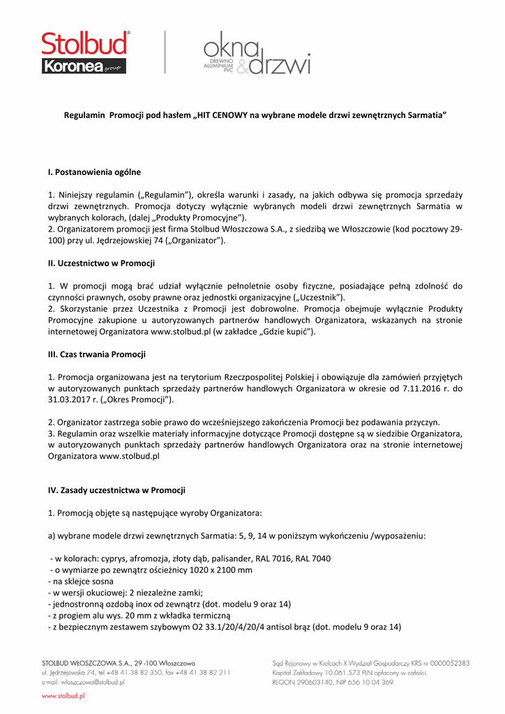 Regulamin Promocji pod hasłem „HIT CENOWY na wybrane modele drzwi zewnętrznych Sarmatia” I. Postanowienia ogólne 1. Niniejszy regulamin („Regulamin”), określa warunki i zasady, na jakich odbywa się promocja sprzedaży drzwi zewnętrznych. Promocja dotyczy wyłącznie wybranych modeli drzwi zewnętrznych Sarmatia w wybranych kolorach, (dalej „Produkty Promocyjne”). 2. Organizatorem promocji jest firma Stolbud Włoszczowa S.A., z siedzibą we Włoszczowie (kod pocztowy 29100) przy ul. Jędrzejowskiej 74 („Organizator”). II. Uczestnictwo w Promocji 1. W promocji mogą brać udział wyłącznie pełnoletnie osoby fizyczne, posiadające pełną zdolność do czynności prawnych, osoby prawne oraz jednostki organizacyjne („Uczestnik”). 2. Skorzystanie przez Uczestnika z Promocji jest dobrowolne. Promocja obejmuje wyłącznie Produkty Promocyjne zakupione u autoryzowanych partnerów handlowych Organizatora, wskazanych na stronie internetowej Organizatora www.stolbud.pl (w zakładce „Gdzie kupić”). III. Czas trwania Promocji 1. Promocja organizowana jest na terytorium Rzeczpospolitej Polskiej i obowiązuje dla zamówień przyjętych w autoryzowanych punktach sprzedaży partnerów handlowych Organizatora w okresie od 7.11.2016 r. do 31.03.2017 r. („Okres Promocji”). 2. Organizator zastrzega sobie prawo do wcześniejszego zakończenia Promocji bez podawania przyczyn. 3. Regulamin oraz wszelkie materiały informacyjne dotyczące Promocji dostępne są w siedzibie Organizatora, w autoryzowanych punktach sprzedaży partnerów handlowych Organizatora oraz na stronie internetowej Organizatora www.stolbud.pl IV. Zasady uczestnictwa w Promocji 1. Promocją objęte są następujące wyroby Organizatora: a) wybrane modele drzwi zewnętrznych Sarmatia: 5, 9, 14 w poniższym wykończeniu /wyposażeniu: - w kolorach: cyprys, afromozja, złoty dąb, palisander, RAL 7016, RAL 7040 - o wymiarze po zewnątrz ościeżnicy 1020 x 2100 mm - na sklejce sosna - w wersji okuciowej: 2 niezależne zamki; - jednostronną ozdobą inox od zewnątrz (dot. modelu 9 oraz 14) - z progiem alu wys. 20 mm z wkładka termiczną - z bezpiecznym zestawem szybowym O2 33.1/20/4/20/4 antisol brąz (dot. modelu 9 oraz 14) 2. W Okresie Promocji istnieje możliwość nabycia Produktów Promocyjnych na niżej wymienionych zasadach: Uczestnicy – klienci indywidualni (tj. ostateczni odbiorcy/użytkownicy) mają możliwość nabycia drzwi zewnętrznych w cenach: w przypadku zakupu w autoryzowanych punktach sprzedaży prowadzonych przez partnerów handlowych Organizatora, pod warunkiem: - wpłacenia zaliczki w wysokości 50 % wartości zamówienia objętego promocją przed jego uruchomieniem do produkcji, - udostępnienia Organizatorowi swoich danych (miasto, numer telefonu, adres e-mail), - podpisania regulaminu promocji przed realizacją zamówienia. 3. Ceny promocyjne podane powyżej nie obejmują: klamek, rozet i wkładek. 4. Wyżej wymienione promocje nie łącza się z promocją pracowniczą oraz innymi promocjami. V. Reklamacje 1. Wszelkie reklamacje w zakresie niezgodności przeprowadzenia Promocji z Regulaminem należy zgłosić w Okresie Promocji lub w terminie 30 dni od dnia zakończenia Promocji, listem poleconym na adres: Stolbud Włoszczowa S.A. 29-100 Włoszczowa, ul. Jędrzejowska 74. Reklamacje, które wpłyną do Organizatora po upływie 30 dni od dnia zakończenia Promocji, nie będą rozpatrywane. 2. Zgłoszenie reklamacyjne powinno zawierać: imię i nazwisko Uczestnika, adres do korespondencji jak również opis podstaw reklamacji oraz podpis wnoszącego reklamację. 3. Reklamacje rozpatrywane będą w terminie 14 dni od daty otrzymania przez Organizatora. VI. Ochrona danych osobowych 1. Udział w promocji i podanie związanych z udziałem w niej danych osobowych jest całkowicie dobrowolne. Organizator Promocji zapewnia ochronę danych osobowych Uczestników i oświadcza, że wykorzystanie danych osobowych będzie zgodne z ustawą z dnia 29 sierpnia 1997 roku o ochronie danych osobowych (Dz.U. 2014 r. poz. 1182) - „Ustawa”. 2. Przed wzięciem udziału w Promocji, Uczestnik jest zobowiązany do zapoznania się i zaakceptowania Regulaminu oraz wyrażenia zgody na przetwarzanie swoich danych osobowych przez Organizatora Promocji na potrzeby prowadzenia Promocji, zgodnie z obowiązującymi przepisami prawa. Złożenie zamówienia w Okresie Promocji na Produkty promocyjne oznacza akceptację warunków Promocji oraz treści Regulaminu. Udzielenie zgody przez Uczestnika Promocji na przetwarzanie danych osobowych w celach, o których mowa w zdaniu pierwszym jak powyżej, następuje przez złożenie oddzielnego oświadczenia. 3. Administratorem danych osobowych zebranych podczas Promocji jest - w rozumieniu Ustawy Organizator. Uczestnicy mają prawo dostępu do ich danych osobowych, jak również prawo do ich zmieniania, uzupełniania lub poprawiania. Dane osobowe Uczestników nie będą przekazywane podmiotom trzecim. VII. Postanowienia końcowe. 1. Naruszenie przez Uczestnika lub partnera handlowego Organizatora warunków Regulaminu może spowodować cofnięcie uprawnień przysługujących mu z tytułu udziału w Promocji. 2. Organizator zastrzega sobie prawo do zmiany Regulaminu pod warunkiem, że nie naruszy to praw już nabytych Uczestników Promocji do dnia wejścia w życie jego zmian. Informacja o zmianach w Regulaminie będzie dostępna na stronie www.stolbud.pl Zmiany Regulaminu wchodzą w życie w dniu następnym po dniu ich opublikowania w sposób podany w zdaniu poprzedzającym. 3. Prawa i obowiązki Organizatora oraz Uczestnika określone są wyłącznie w Regulaminie i obowiązujących przepisach prawa.