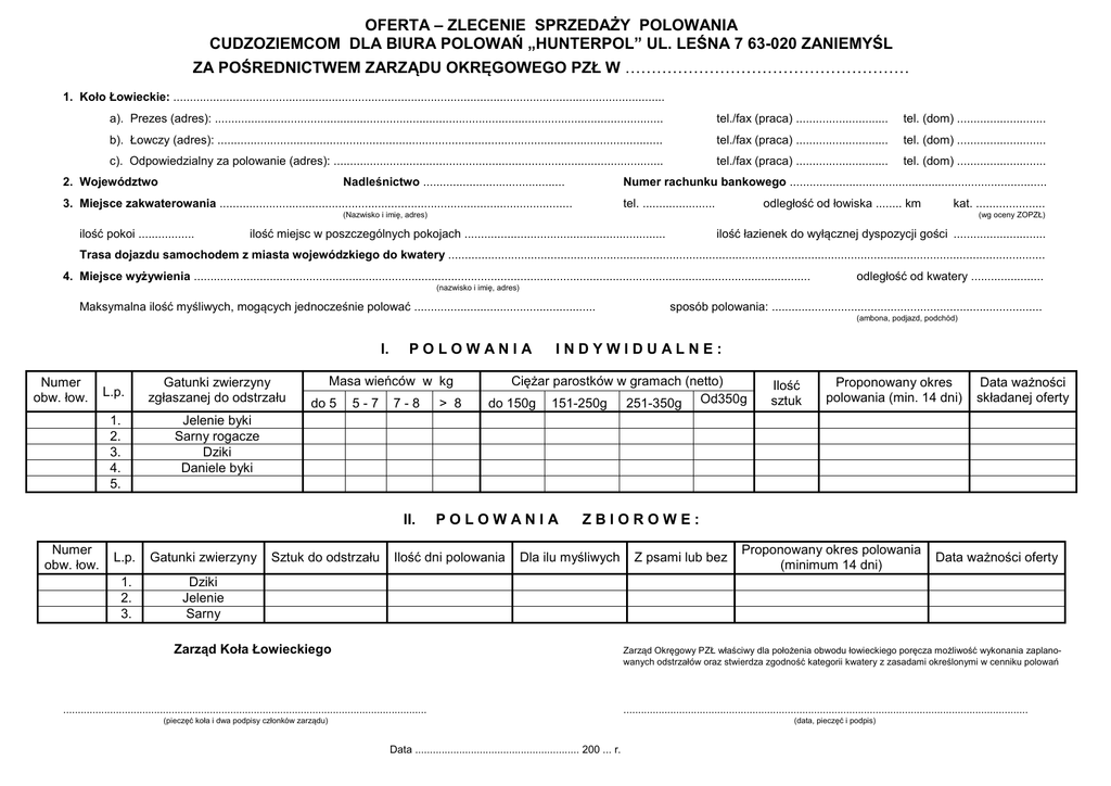 OFERTA – ZLECENIE SPRZEDAŻY POLOWANIA CUDZOZIEMCOM DLA BIURA POLOWAŃ „HUNTERPOL” UL. LEŚNA 7 63-020 ZANIEMYŚL ZA POŚREDNICTWEM ZARZĄDU OKRĘGOWEGO PZŁ W ……………………………………………… 1. Koło Łowieckie: ..................................................................................................................................................... a). Prezes (adres): ........................................................................................................................................ tel./fax (praca) ............................ tel. (dom) ........................... b). Łowczy (adres): ....................................................................................................................................... tel./fax (praca) ............................ tel. (dom) ........................... c). Odpowiedzialny za polowanie (adres): .................................................................................................... tel./fax (praca) ............................ tel. (dom) ........................... 2. Województwo Nadleśnictwo ........................................... Numer rachunku bankowego .............................................................................. 3. Miejsce zakwaterowania ........................................................................................................... tel. ...................... odległość od łowiska ........ km kat. ..................... (Nazwisko i imię, adres) ilość pokoi ................. (wg oceny ZOPZŁ) ilość miejsc w poszczególnych pokojach ............................................................. ilość łazienek do wyłącznej dyspozycji gości ............................ Trasa dojazdu samochodem z miasta wojewódzkiego do kwatery ..................................................................................................................................................................................... 4. Miejsce wyżywienia ........................................................................................................................................................................................... odległość od kwatery ...................... (nazwisko i imię, adres) Maksymalna ilość myśliwych, mogących jednocześnie polować ....................................................... sposób polowania: .................................................................................. (ambona, podjazd, podchód) I. Numer obw. łow. L.p. 1. 2. 3. 4. 5. Gatunki zwierzyny zgłaszanej do odstrzału POLOWANIA Masa wieńców w kg do 5 5-7 7-8 Ciężar parostków w gramach (netto) do 150g 151-250g 251-350g Od350g Ilość sztuk Proponowany okres polowania (min. 14 dni) Data ważności składanej oferty Jelenie byki Sarny rogacze Dziki Daniele byki II. Numer obw. łow. > 8 INDYWIDUALNE: L.p. Gatunki zwierzyny 1. 2. 3. Dziki Jelenie Sarny Sztuk do odstrzału POLOWANIA Ilość dni polowania ZBIOROWE: Dla ilu myśliwych Zarząd Koła Łowieckiego Z psami lub bez Proponowany okres polowania (minimum 14 dni) Data ważności oferty Zarząd Okręgowy PZŁ właściwy dla położenia obwodu łowieckiego poręcza możliwość wykonania zaplanowanych odstrzałów oraz stwierdza zgodność kategorii kwatery z zasadami określonymi w cenniku polowań ............................................................................................................................ (pieczęć koła i dwa podpisy członków zarządu) .......................................................................................................................................... (data, pieczęć i podpis) Data ........................................................ 200 ... r. Ogólna charakterystyka obwodów łowieckich zgłoszonych do polowań dla cudzoziemców Numer obwodu (obwodów) : ............................................................................. Powierzchnia użytkowa : ............................................................................. w tym : - leśna ............................................................................. - polna ............................................................................. - wód ............................................................................. W obwodzie przeważają drzewostany : liściaste, iglaste, mieszane, zwarte kompleksy, remizy śródpolne i inne. * Teren : płaski, pofałdowany, górzysty. * Ilość ambon : .................. Stan zwierzyny (dotyczy oferowanych gatunków) : Rodzaj zwierzyny Wykonanie odstrzału Plan odstrzału sezonu poprzedniego na sezon obecny Jelenie byki Sarny rogacze Dziki Daniele byki Muflon Bażanty Kaczki Gęsi Informacje dotyczące polowań zbiorowych z sezonu poprzedniego: Ilość myśliwych……………………………………………… Ilość strzałów………………………………………………… Ilość dni polowania…………………………………………. Rodzaj i ilość zwierzyny grubej na rozkładzie .................................................................................................................................... .................................................................................................................................... .................................................................................................................................... .................................................................................................................................... * - podkreślić odpowiednie.