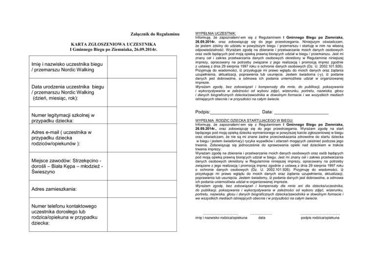 Załącznik do Regulaminu KARTA ZGŁOSZENIOWA UCZESTNIKA I Gminnego Biegu po Ziemniaka, 26.09.2014r. Imię i nazwisko uczestnika biegu / przemarszu Nordic Walking Data urodzenia uczestnika biegu / przemarszu Nordic Walking (dzień, miesiąc, rok): Numer legitymacji szkolnej w przypadku dziecka: Adres e-mail ( uczestnika w przypadku dziecka rodziców/opiekunów ): Miejsce zawodów: Strzekęcino dorośli – Biała Kępa – młodzież Świeszyno Adres zamieszkania: Numer telefonu kontaktowego uczestnika dorosłego lub rodzica/opiekuna w przypadku dziecka: WYPEŁNIA UCZESTNIK: Informuję, że zapoznałam/-em się z Regulaminem I Gminnego Biegu po Ziemniaka, 26.09.2014r. oraz zobowiązuję się do jego przestrzegania. Niniejszym oświadczam, że jestem zdolny do udziału w powyższym biegu / przemarszu i startuję w nim na własną odpowiedzialność. Wyrażam zgodę na zbieranie i przetwarzanie moich danych osobowych oraz osób będących pod moją opieką prawną biorących udział w biegu / przemarszu. Jest mi znany cel i zakres przetwarzania danych osobowych określony w Regulaminie niniejszej imprezy, opracowany na potrzeby związane z jego realizacją i promocją imprez zgodnie z ustawą z dnia 29 sierpnia 1997 roku o ochronie danych osobowych (Dz. U. 2002.101.926). Przyjmuję do wiadomości, iż przysługuje mi prawo wglądu do moich danych oraz żądania uzupełnienia, aktualizacji, poprawienia lub usunięcia. Jestem świadoma (-y), iż podanie danych jest dobrowolne, a odmowa ich podania uniemożliwia udział w organizowanej imprezie. Wyrażam zgodę, bez zobowiązań i kompensaty dla mnie, do publikacji, pokazywania i wykorzystywania w zależności od wyboru zdjęć, wizerunku, portretu, nazwiska, głosu i danych biograficznych dziecka/zawodnika w dowolnym formacie i we wszystkich mediach istniejących obecnie i w przyszłości na całym świecie. Podpis:____________________ Data: ______________________ WYPEŁNIA RODZIC DZIECKA STARTUJĄCEGO W BIEGU: Informuję, że zapoznałam/-em się z Regulaminem I Gminnego Biegu po Ziemniaka, 26.09.2014r., oraz zobowiązuję się do jego przestrzegania. Wyrażam zgodę na start będącego pod moją opieką dziecka wymienionego w powyższej karcie zgłoszeniowej w biegu oraz oświadczam, że nie są mi znane żadne przeciwskazania zdrowotne do startu dziecka w biegu i jestem świadoma(y) ryzyka wypadków i zdarzeń mogących zaistnieć podczas jego trwania. Zobowiązuję się jednocześnie do sprawowania opieki nad dzieckiem w trakcie trwania imprezy. Wyrażam zgodę na zbieranie i przetwarzanie moich danych osobowych oraz osób będących pod moją opieką prawną biorących udział w biegu. Jest mi znany cel i zakres przetwarzania danych osobowych określony w Regulaminie niniejszej imprezy, opracowany na potrzeby związane z jego realizacją i promocją imprez zgodnie z ustawą z dnia 29 sierpnia 1997 roku o ochronie danych osobowych (Dz. U. 2002.101.926). Przyjmuję do wiadomości, iż przysługuje mi prawo wglądu do moich danych oraz żądania uzupełnienia, aktualizacji, poprawienia lub usunięcia. Jestem świadomy, iż podanie danych jest dobrowolne, a odmowa ich podania uniemożliwia udział w organizowanej imprezie. Wyrażam zgodę, bez zobowiązań i kompensaty dla mnie ani dla dziecka/uczestnika, do publikacji, pokazywania i wykorzystywania w zależności od wyboru zdjęć, wizerunku, portretu, nazwiska, głosu i danych biograficznych dziecka/zawodnika w dowolnym formacie i we wszystkich mediach istniejących obecnie i w przyszłości na całym świecie. …………………… …………… ……………………… imię i nazwisko rodzica/opiekuna data podpis rodzica/opiekuna